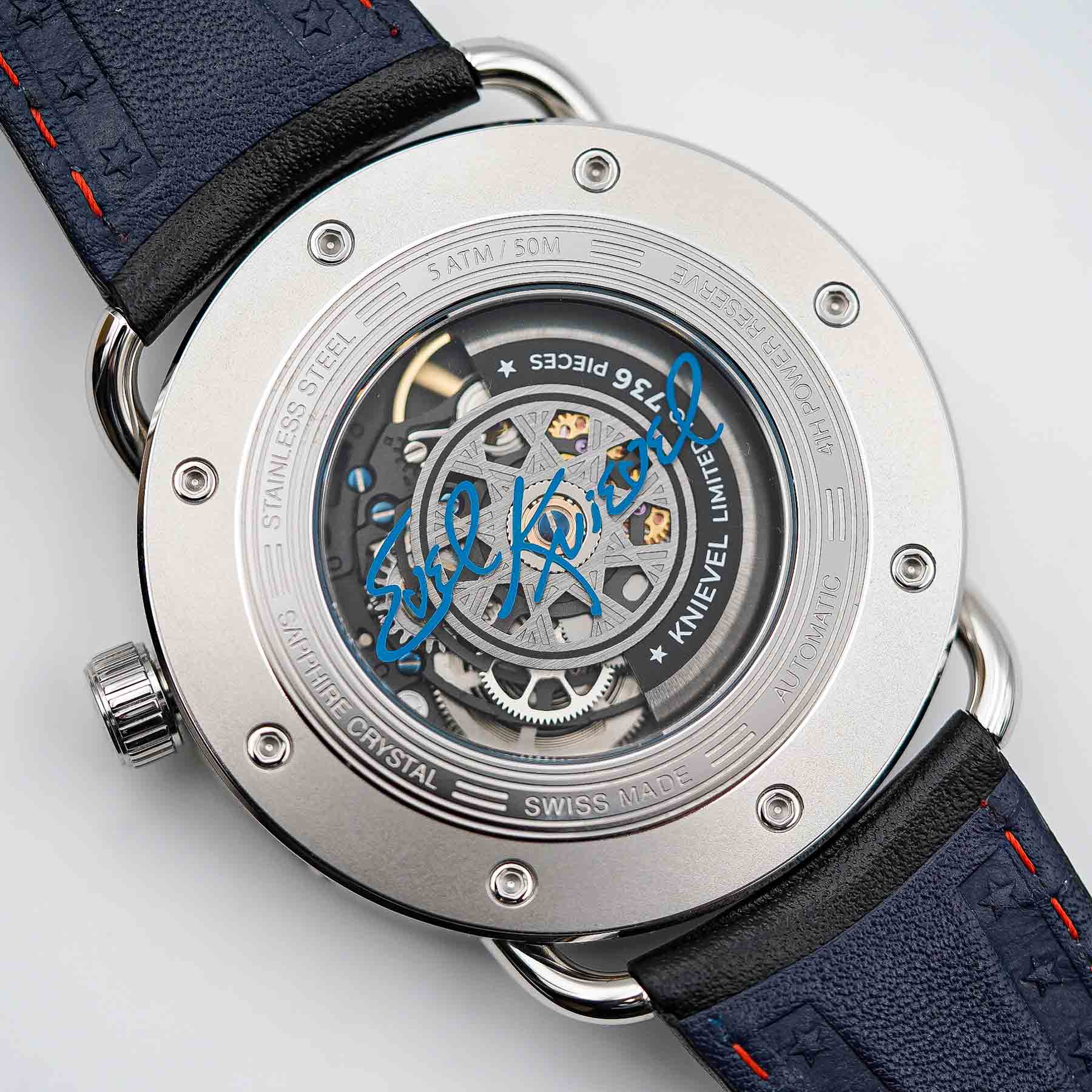The caseback is just as meaningful. Though it uses mineral glass rather than sapphire, it serves its purpose as a viewing window for the movement and features a bright blue Evel Knievel’s signature. It’s both a stamp of authenticity and a symbolic bridge between the watch and the daredevil’s legendary exploits. The watch is rated to 50 meters of water resistance—not dive-watch territory, but sufficient for everyday wear. The slightly domed sapphire crystal on the front completes the case design with durability and clarity, ensuring the vibrant dial underneath gets its due spotlight.