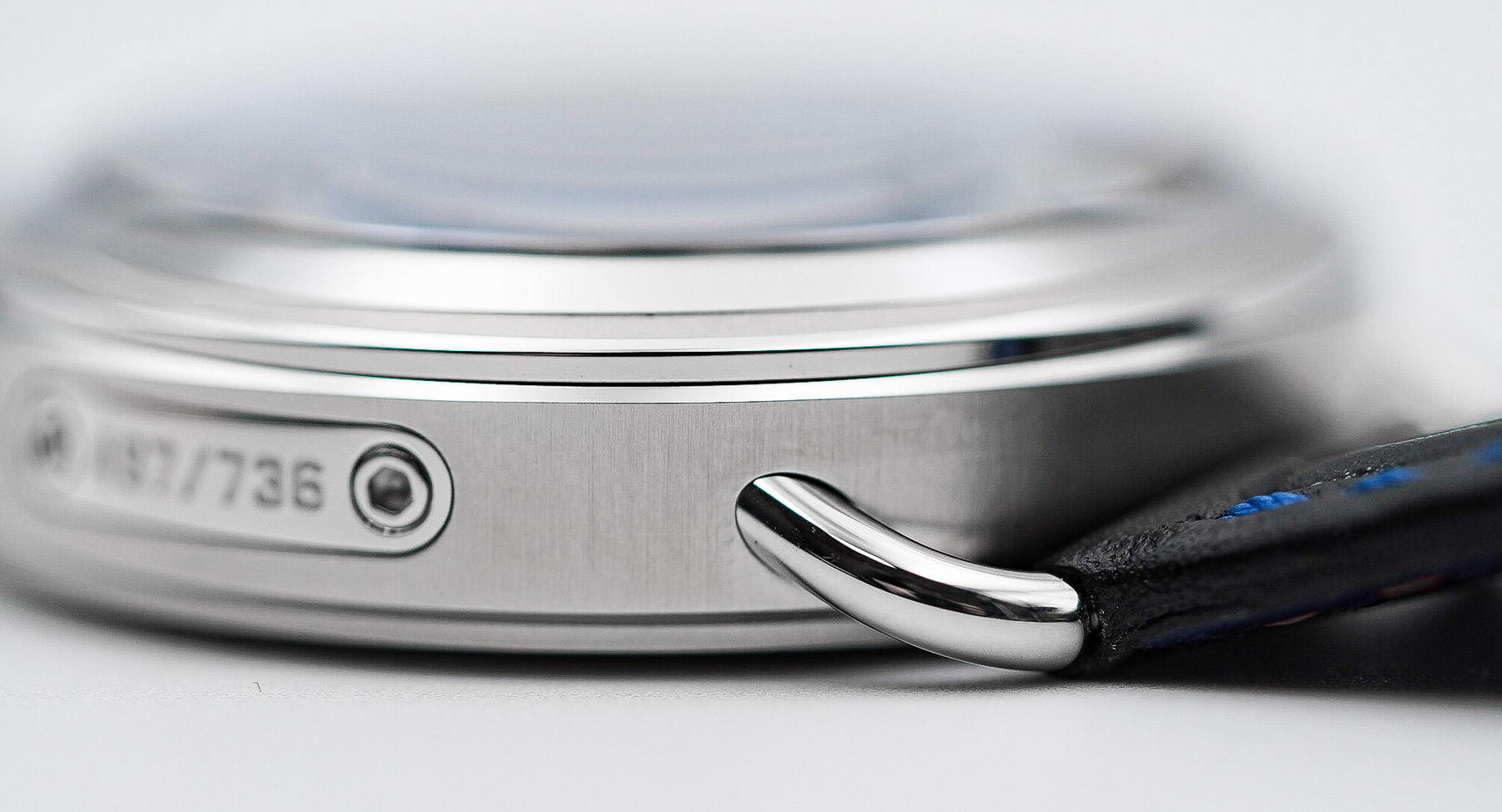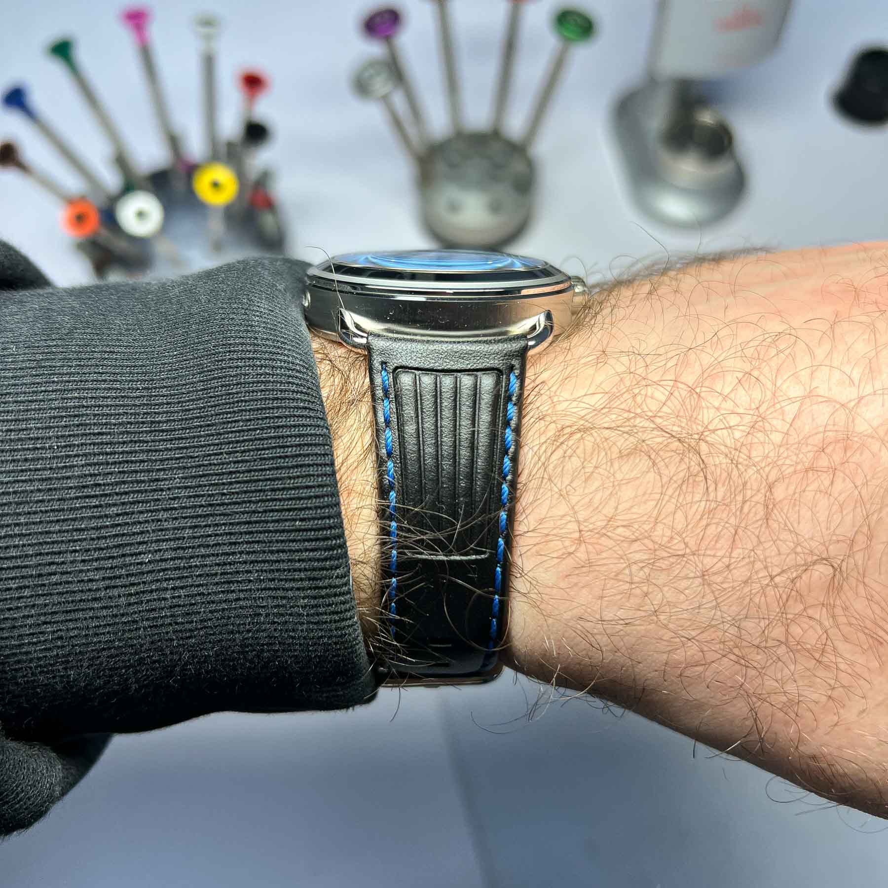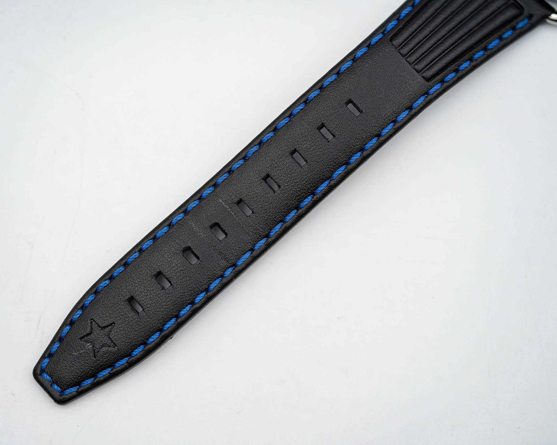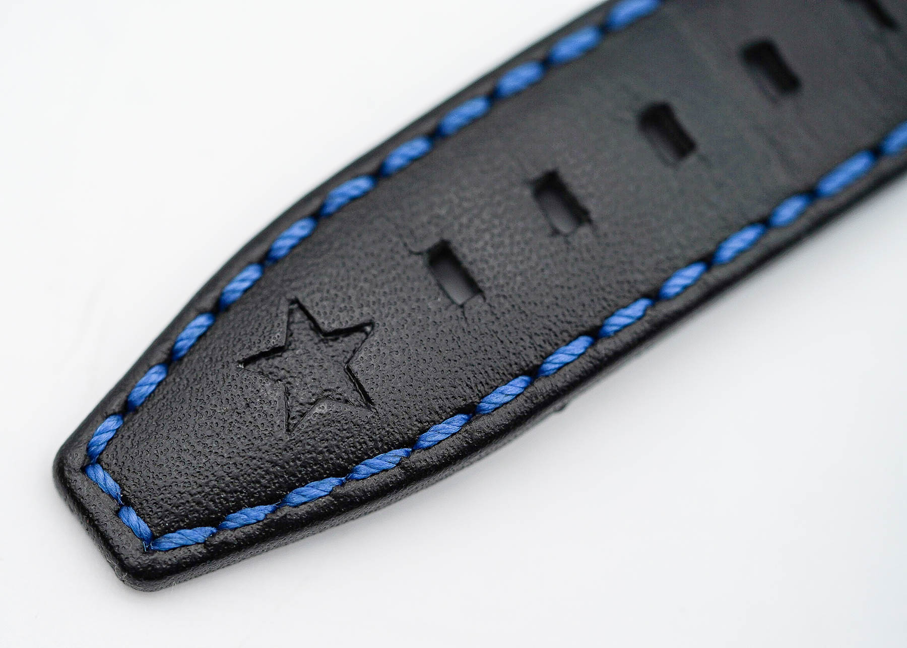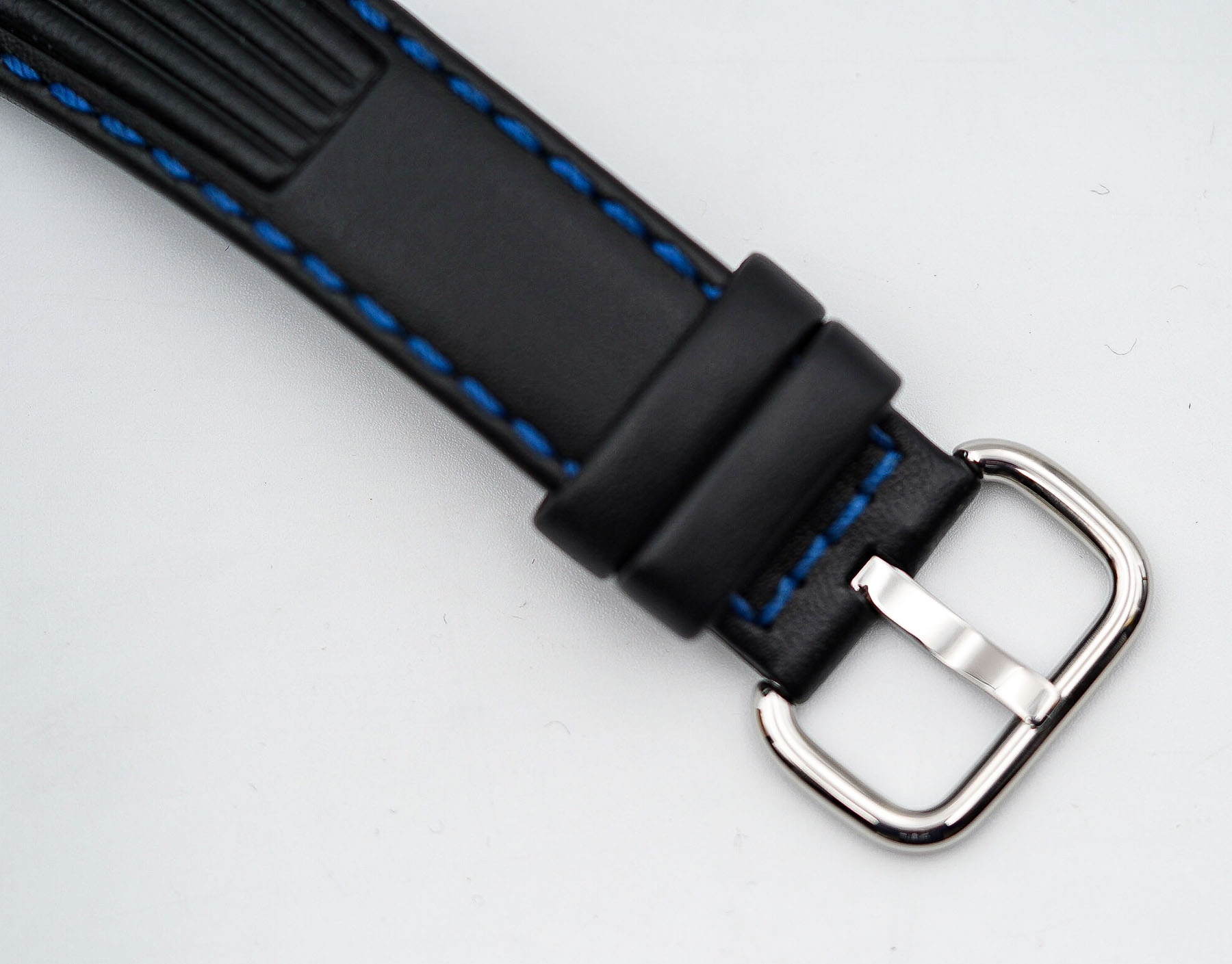 The strap on the TTT Knievel is more than an afterthought—it’s integral to the watch’s thematic cohesion. Made from black calfskin leather, it’s supple, thick, and comfortable, with a subtly padded structure that helps it sit flush against the wrist. Near the lugs, you’ll find embossed horizontal ribs, which resemble the protective leather gear worn by motorcycle riders—a quiet but effective reference to Knievel’s world. Bright blue contrast stitching ties the strap to the dial’s color accents, while the underside lining adds a splash of unexpected color: vivid blue leather with red cross-stitching. This detail mirrors the red, white, and blue motif found throughout the watch, reinforcing the Americana aesthetic from every angle.
