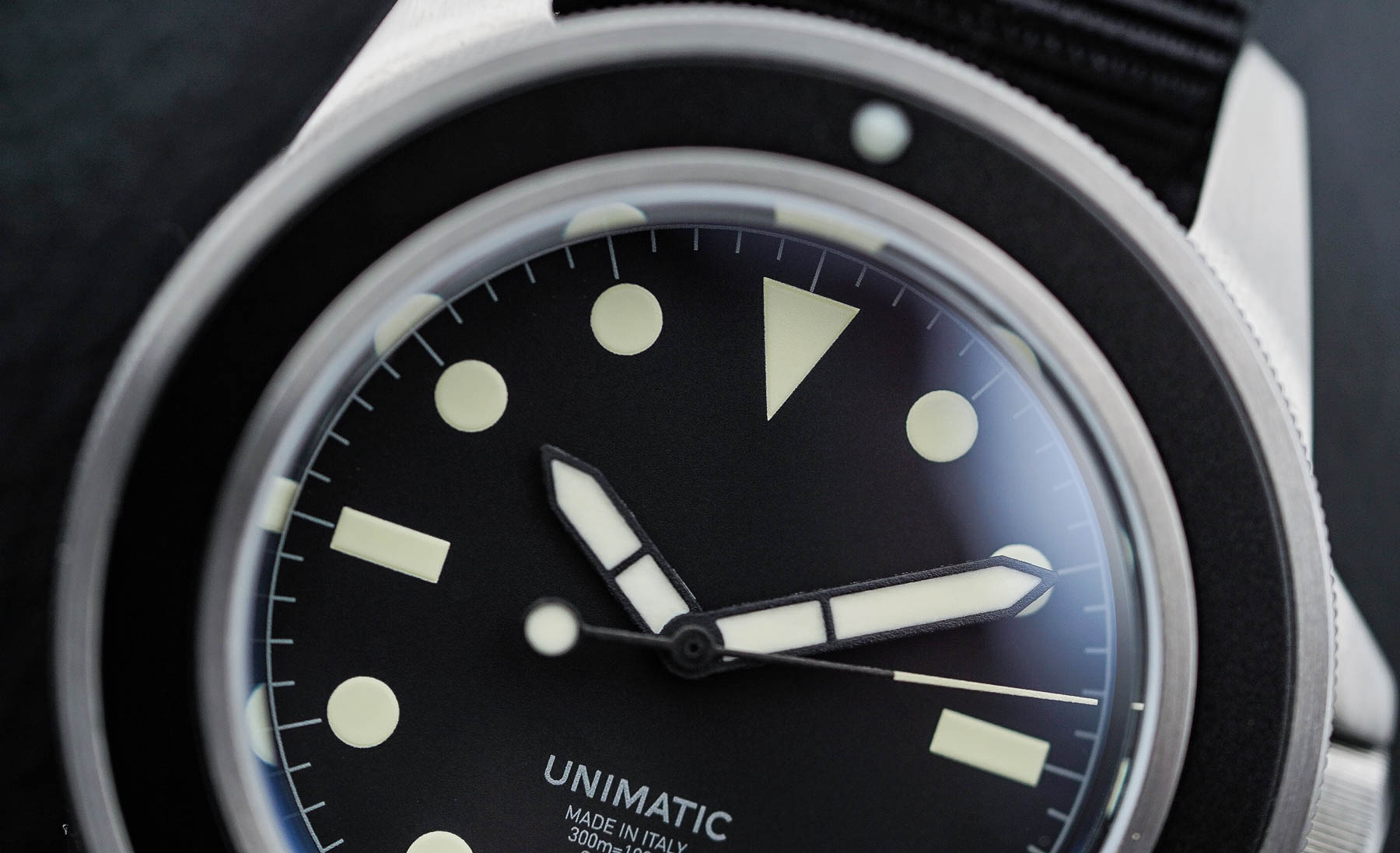 The dial of the UC1 is minimalist but not dull. It is matte black, stark and utilitarian, yet artfully composed. There is an unmistakable austerity to the design—there’s no logo at the 12 o’clock position, only a triangle marker. All branding, including the Unimatic name, the “Made in Italy” designation, and the 300m water resistance rating, is relegated to the lower half of the dial, beneath the central axis. This unusual layout leaves the upper half visually clean. Hour markers are filled with C1 Super-LumiNova, which unfortunately is one of the weaker points of the watch. The lume is adequate but not outstanding. Charging it takes a bit more time than one would expect from a modern dive watch, and its glow fades faster than desirable—especially when compared to peers sporting BGW9 or X1 lume compounds. It’s a rare stumble for a watch with otherwise impeccable design credibility.