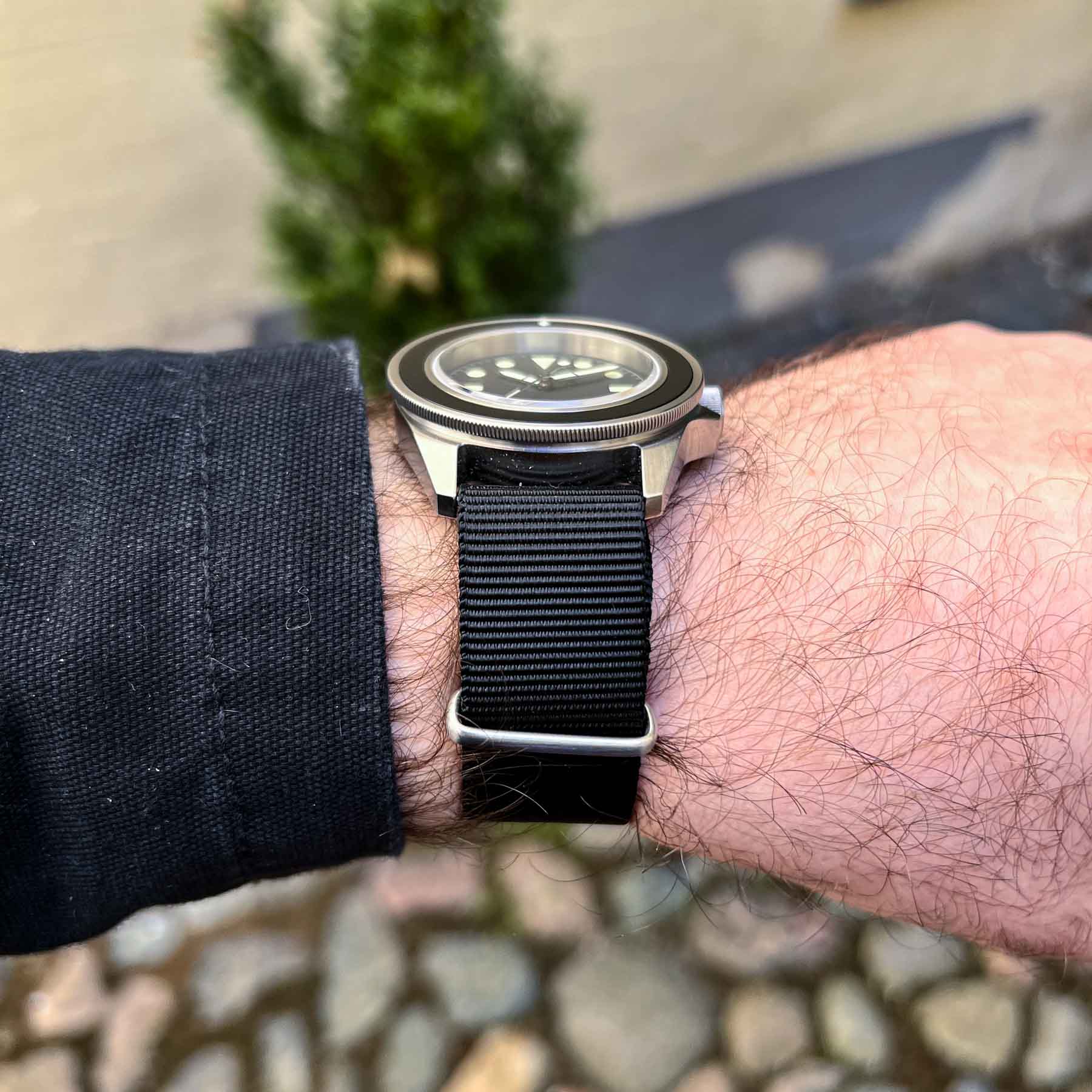 First impressions of the watch itself are strong. It delivers a distinctly utilitarian, no-nonsense aesthetic. The sterile bezel and the almost text-free dial set the tone immediately: this is a watch that doesn’t try to shout, but instead commands attention through quiet confidence and clean, deliberate design. If I had one gripe at this stage, it would be the included NATO strap. While functional and in keeping with the tool watch theme, it falls a bit short of expectations at this price point. A higher-end seatbelt-style NATO—thicker, softer, and with a tighter weave—would’ve elevated the first-impressions experience and daily wear. It’s a small detail, but one that can make a big difference in how the watch feels from day one.