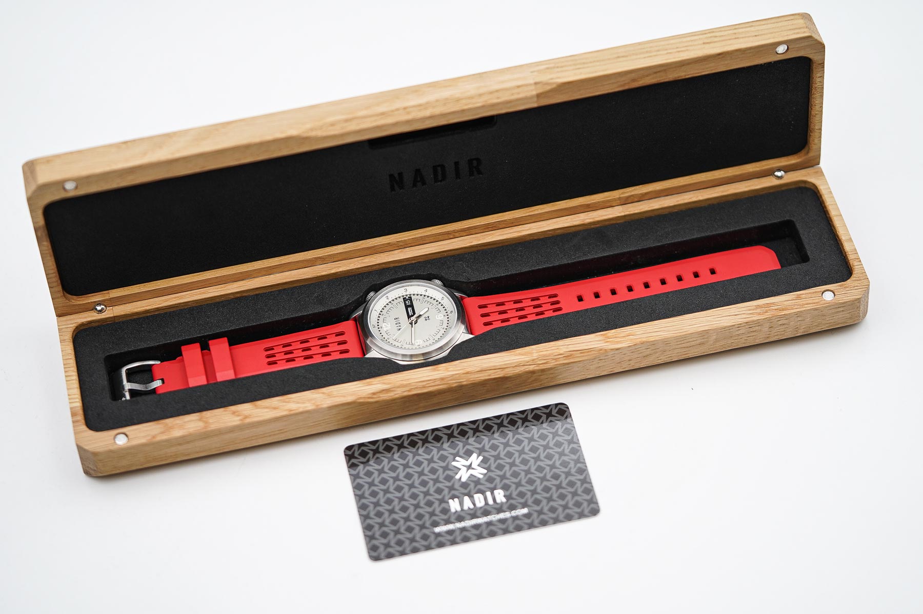 The Nadir Vespera arrived in an elegant rectangular wooden presentation box, subtly branded with the Nadir logo. Substantial in weight, the box immediately conveys a sense of quality, clearly crafted from solid wood. The lid is secured by discreet magnets, offering a clean and satisfying opening experience. Inside, the contents are neatly arranged: the watch itself, an additional leather strap, and a warranty card. While I typically favor more funtional packaging, I must admit this box strikes a compelling balance between function and form. It’s well executed and enhances the overall unboxing experience.