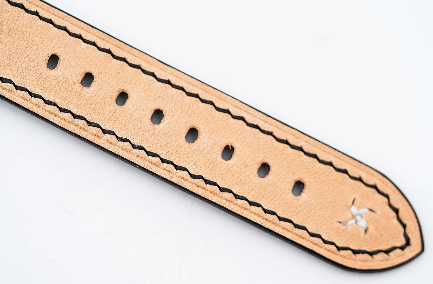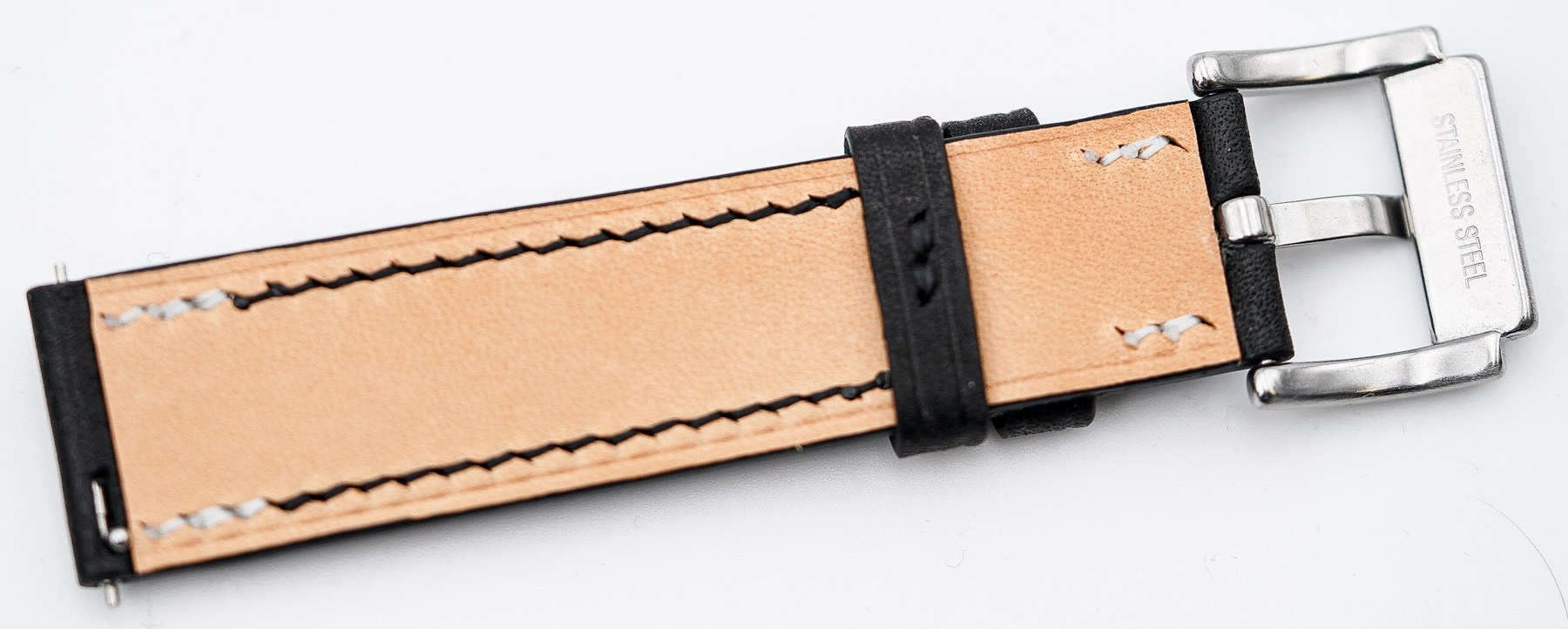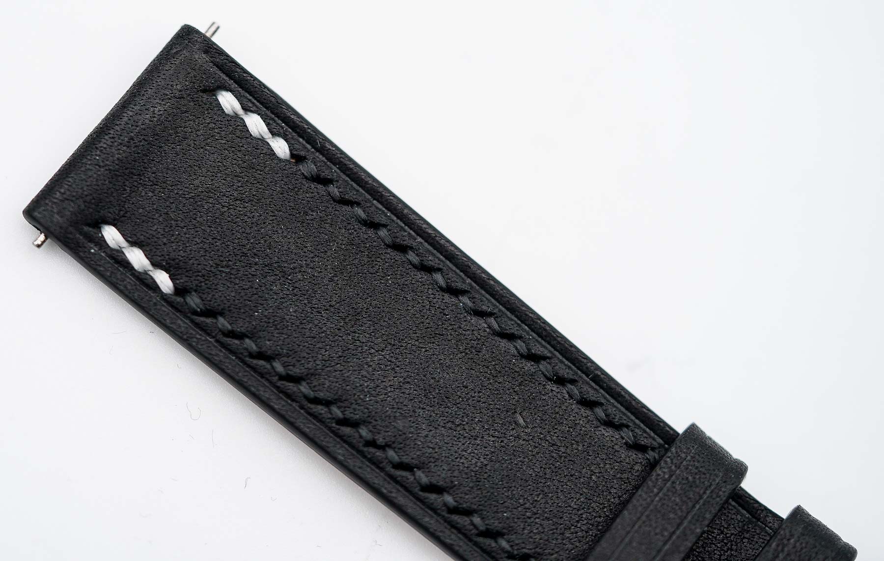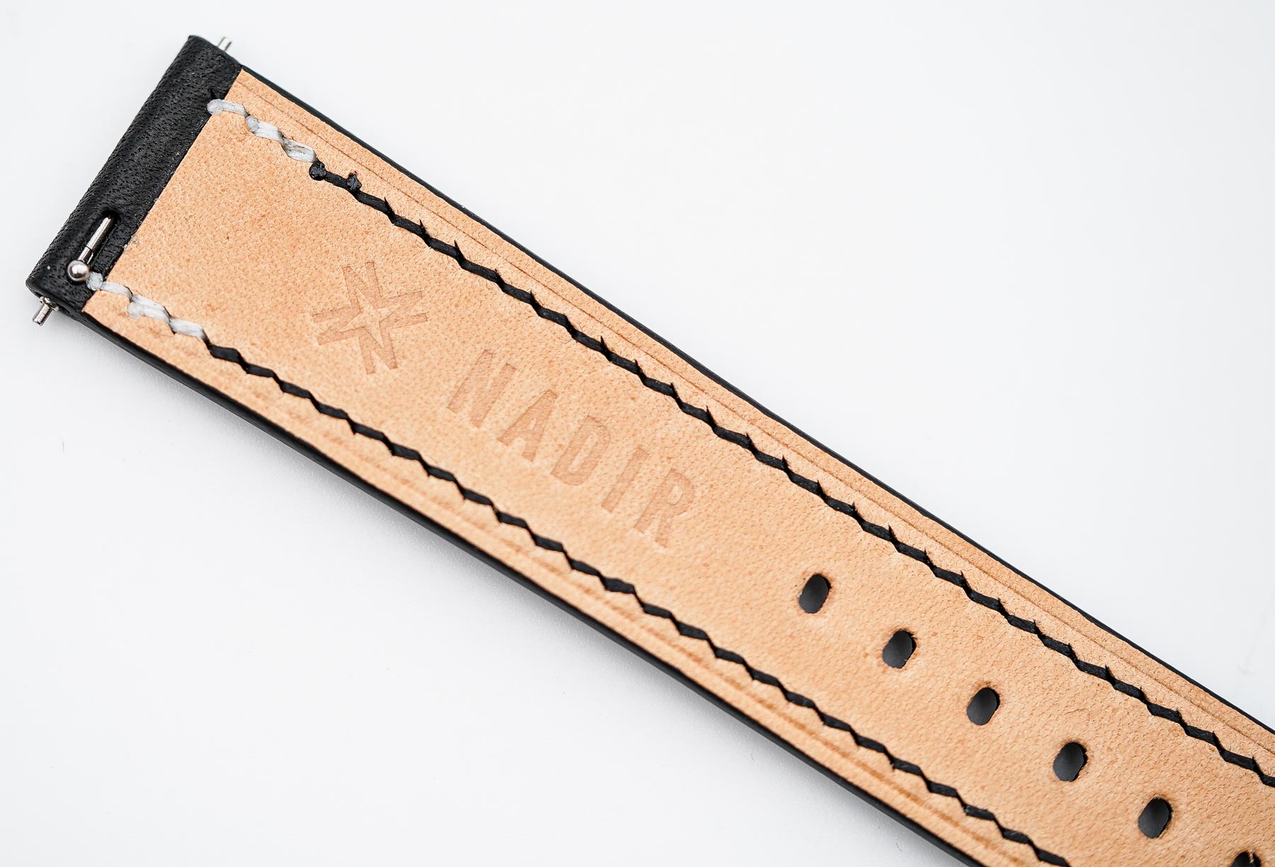 The second strap offers a more classic appeal. Made from Tuscan Badalassi Carlo Pueblo leather, it features a rich texture, authentic leather aroma, and excellent craftsmanship. The black leather is smooth and paired with a contrasting light tan lining for added visual interest. Subtle black stitching runs along the strap, accented by white contrast stitches at the lugs and ends. Like the rubber strap, it also includes quick-release spring bars. The buckle here takes on a stepped design, engraved with the Nadir logo—distinct from the rubber strap’s hardware, but just as well executed. Comfort-wise, the leather is soft and pliable right out of the box, making it an equally enjoyable option.