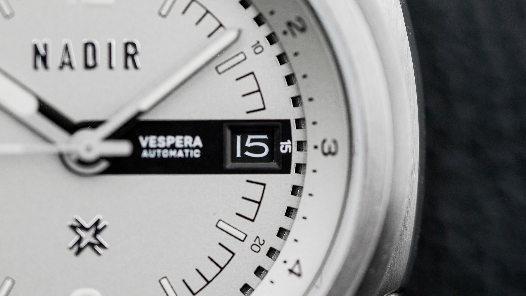 The Vespera’s dial is where Nadir Watches lets its design language speak the loudest. The model reviewed—Vespera Grey—features a matte silver dial with a subtle, almost bead-blasted finish. The tone leans toward a soft, ashen silver, offering a clean, utilitarian feel. Framing the dial is an internal rotating bezel, which some might initially mistake for a chapter ring. It features a printed minute track and 12-hour markers in black, adding both functionality and visual depth. Just beneath, small cutouts line the inner edge of the dial—subtle but effective in creating dimensionality. The raised, lumed hour markers are clean and legible, with Arabic numerals at 6, 9, and 12 o’clock for quick orientation. The lume works, but won’t win brightness awards. At 3 o’clock, a date window is integrated seamlessly, marked by a fine black rectangular line extending from the center of the dial. On the black line we also have the model name “Vespera” printed in white. The color-matched black date wheel is a thoughtful touch that many brands often overlook.