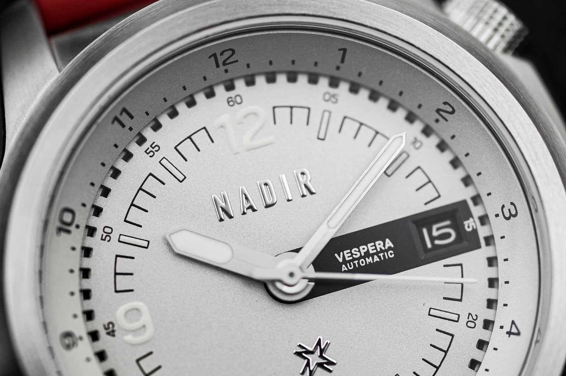 Branding is kept minimal, an applied Nadir logo at 12 and the crest at 6 offer balance without cluttering the dial. The hour and minute hands are index-shaped with a split finish—polished on one side and bead-blasted on the other to echo the dial’s texture. They’re also lumed for low-light readability. The slim, needle-like seconds hand is painted white, providing just the right amount of contrast. Overall, the dial design is smartly detailed and well balanced—modern, functional, and true to the Vespera’s adventurous spirit.