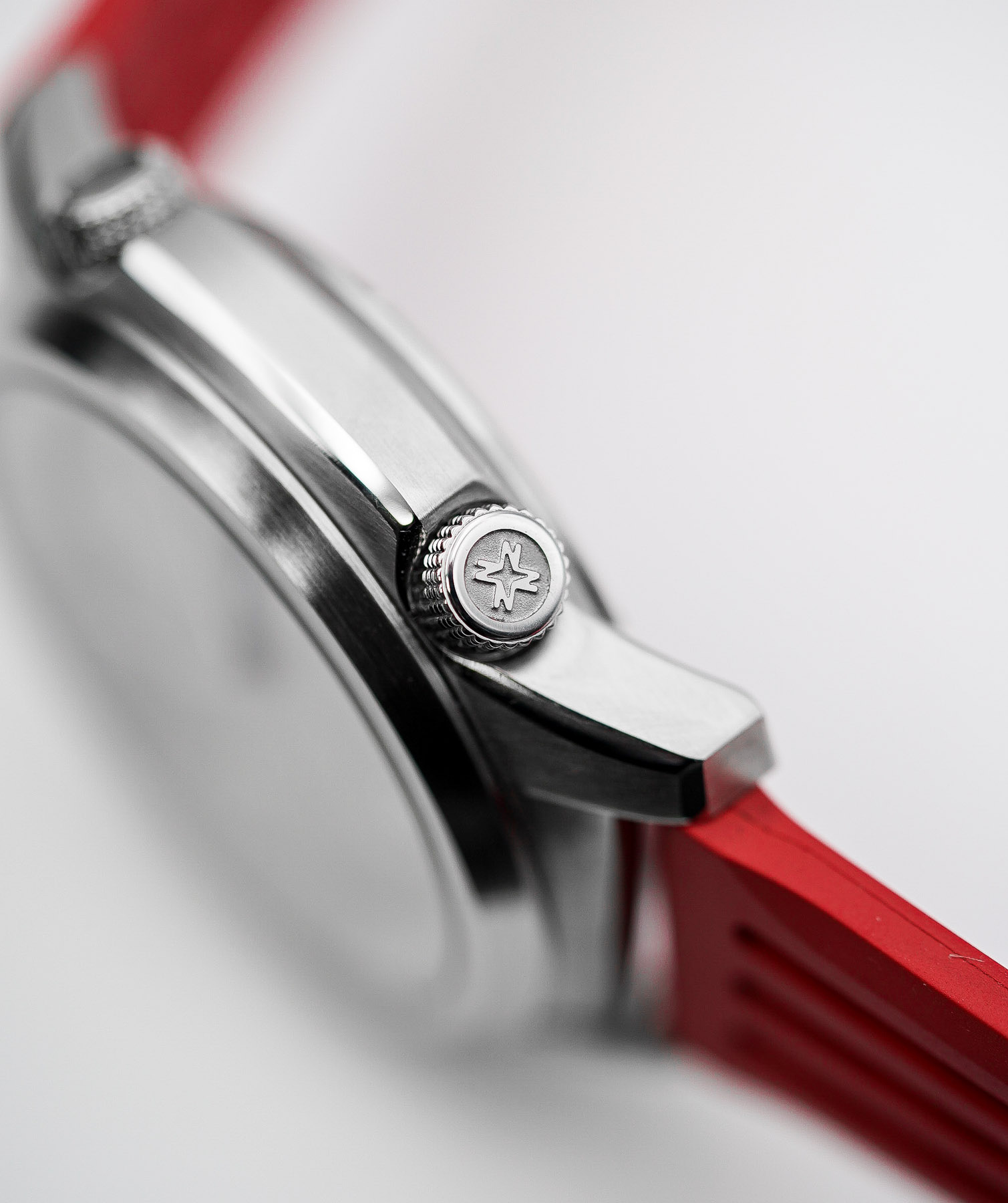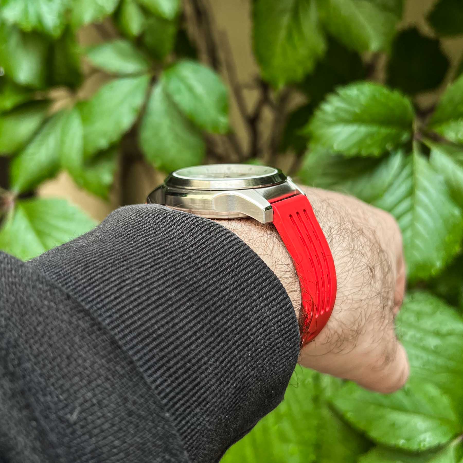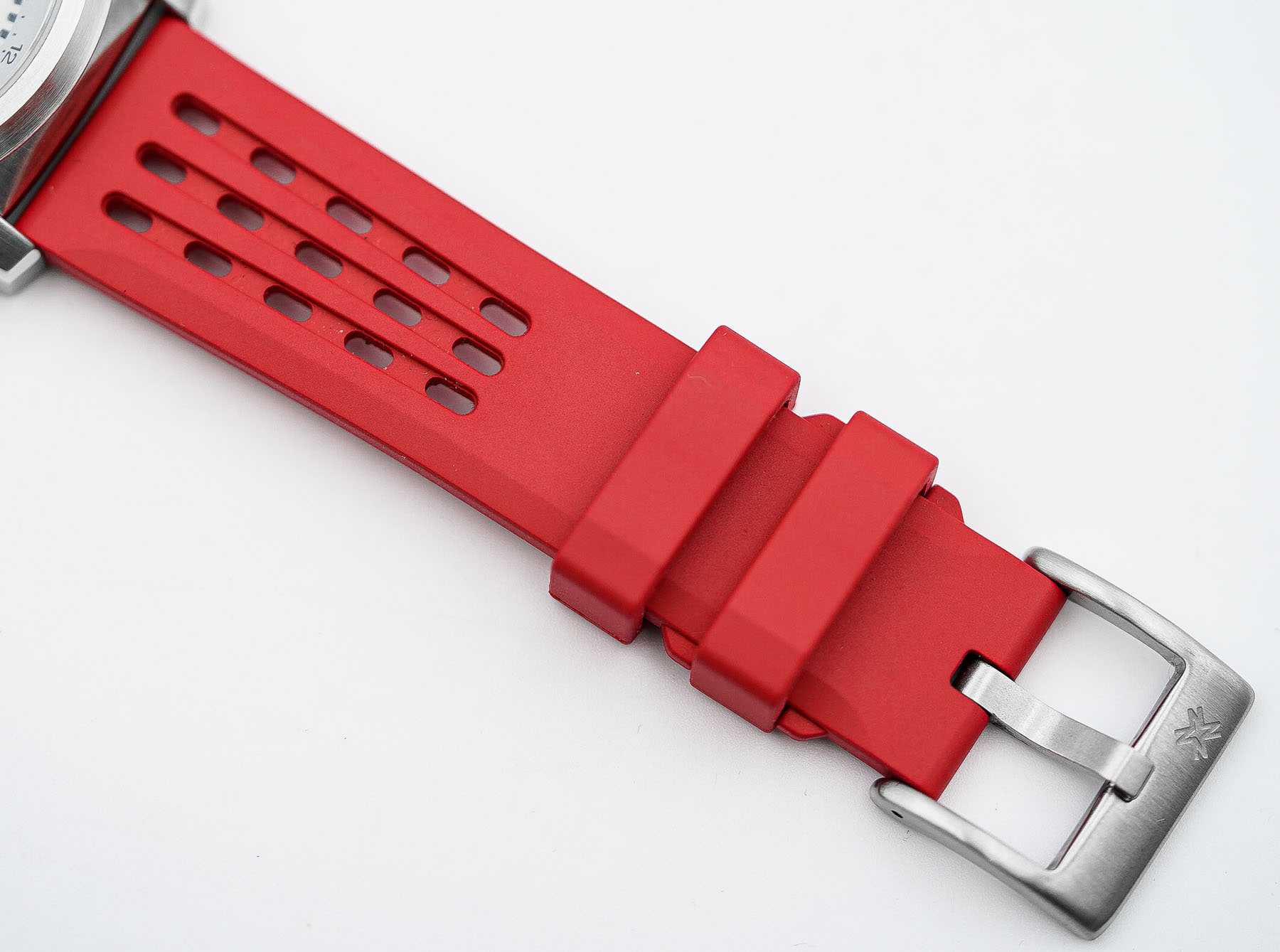 The Vespera Grey comes equipped with two strap options: a black leather strap and a bold red FKM rubber strap. Of the two, the red rubber quickly became my go-to—especially in summer, when comfort and breathability are key. The strap is perforated, allowing for better airflow on hot days, and it’s crafted from FKM (fluoroelastomer) rubber, a high-performance material often found in aerospace and automotive industries. Compared to standard silicone, FKM offers superior resistance to heat, UV rays, and chemicals, making it an ideal companion for both everyday wear and more demanding conditions. On the wrist, the rubber strap feels supple yet robust, offering all-day comfort without compromising durability. It tapers nicely from 20mm at the lugs to 18mm at the buckle, ensuring a clean, proportional fit. Sizing is generous, with enough holes to accommodate a wide range of wrist sizes. The brushed stainless steel buckle—signed with the Nadir crest—matches the watch’s utilitarian aesthetic and is substantial enough to complement the case. Quick-release spring bars round out the thoughtful design, allowing for fast, tool-free strap changes.