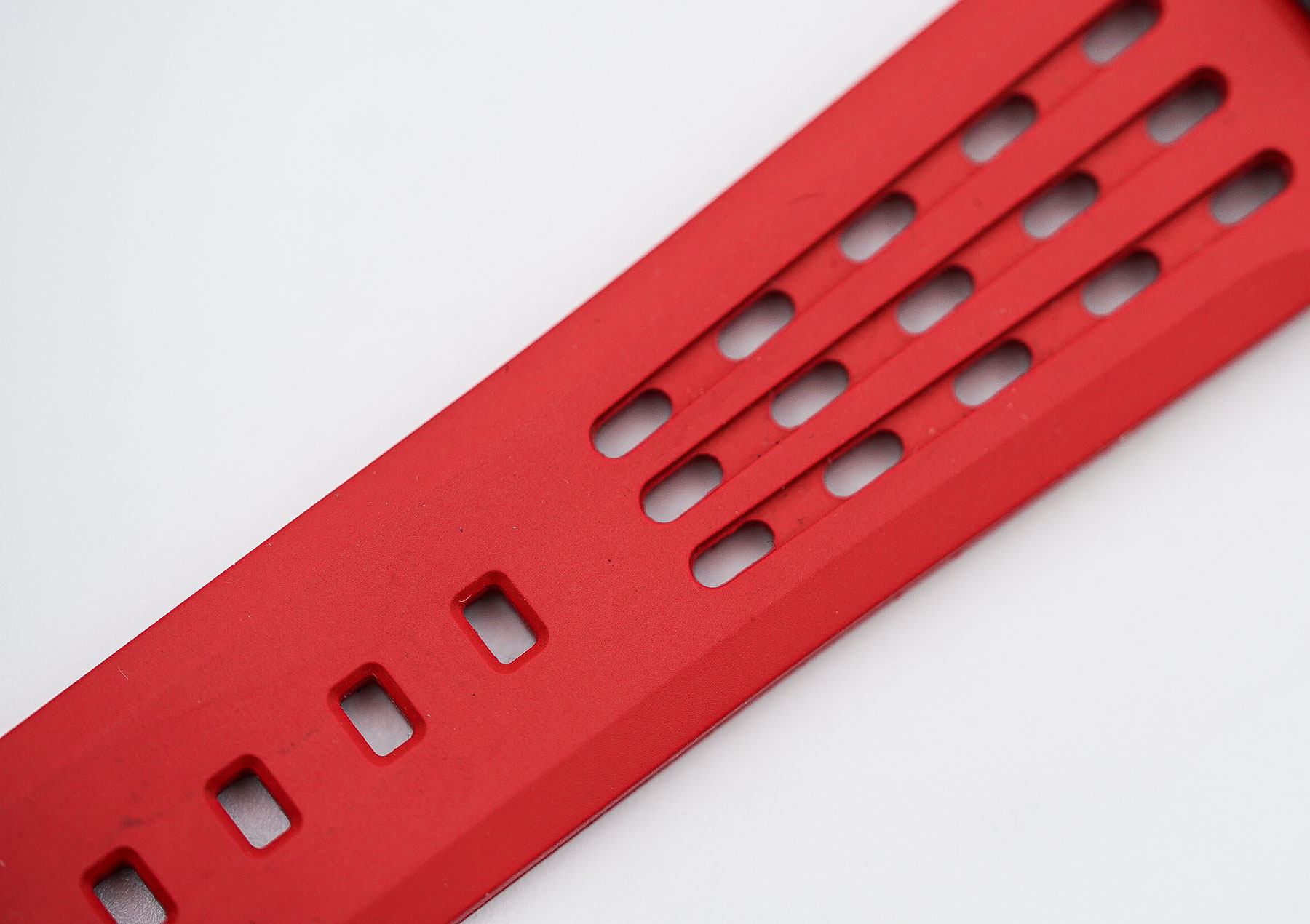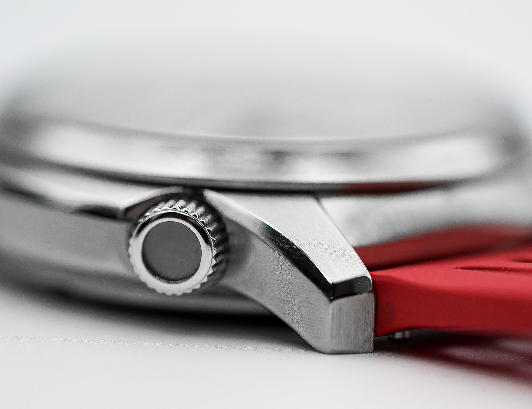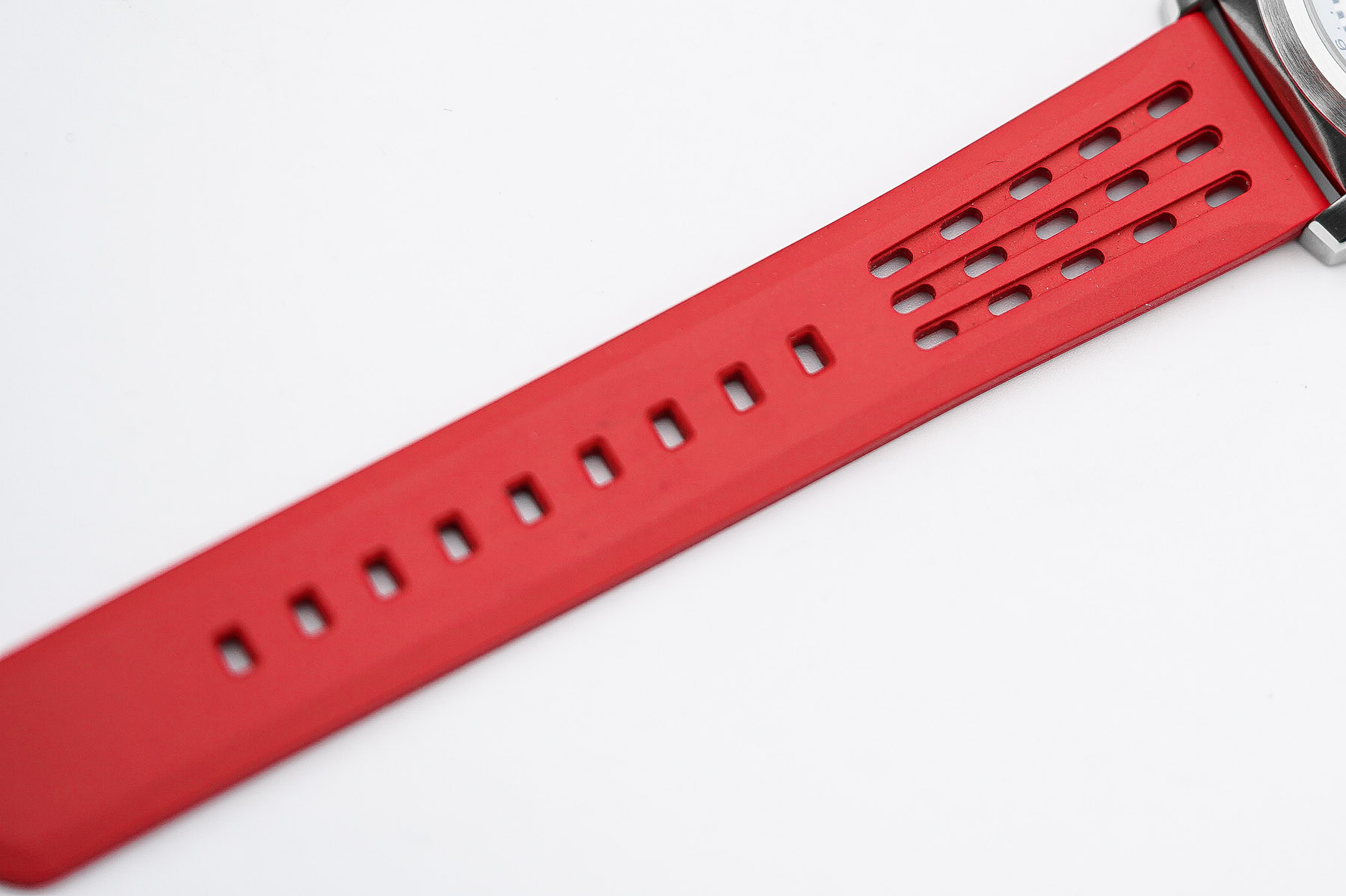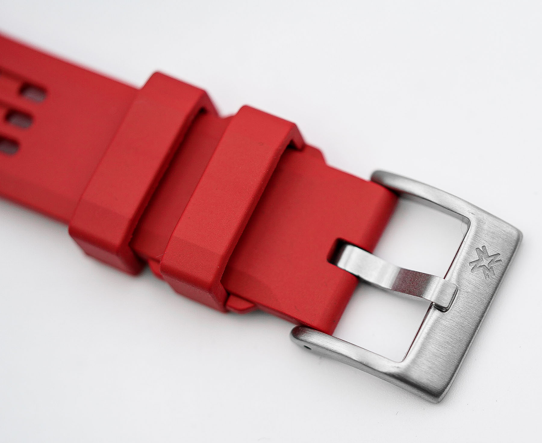 The Vespera Grey comes equipped with two strap options: a black leather strap and a bold red FKM rubber strap. Of the two, the red rubber quickly became my go-to—especially in summer, when comfort and breathability are key. The strap is perforated, allowing for better airflow on hot days, and it’s crafted from FKM (fluoroelastomer) rubber, a high-performance material often found in aerospace and automotive industries. Compared to standard silicone, FKM offers superior resistance to heat, UV rays, and chemicals, making it an ideal companion for both everyday wear and more demanding conditions. On the wrist, the rubber strap feels supple yet robust, offering all-day comfort without compromising durability. It tapers nicely from 20mm at the lugs to 18mm at the buckle, ensuring a clean, proportional fit. Sizing is generous, with enough holes to accommodate a wide range of wrist sizes. The brushed stainless steel buckle—signed with the Nadir crest—matches the watch’s utilitarian aesthetic and is substantial enough to complement the case. Quick-release spring bars round out the thoughtful design, allowing for fast, tool-free strap changes.