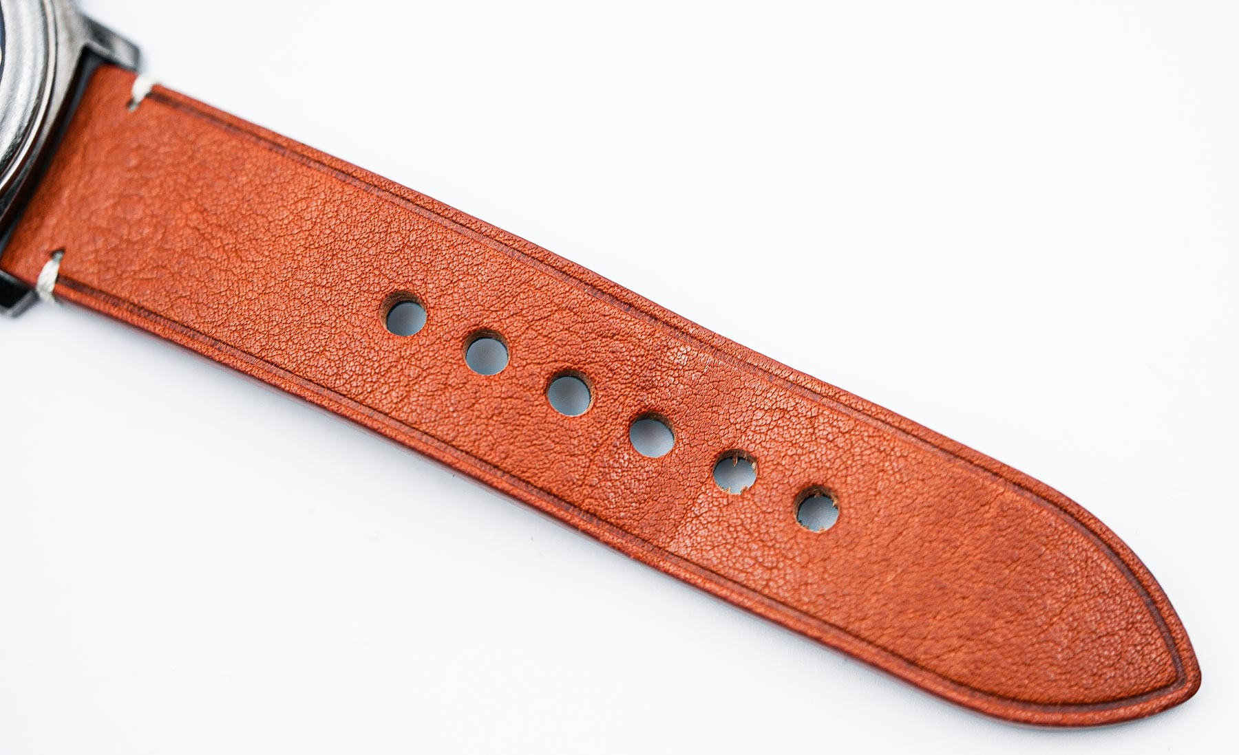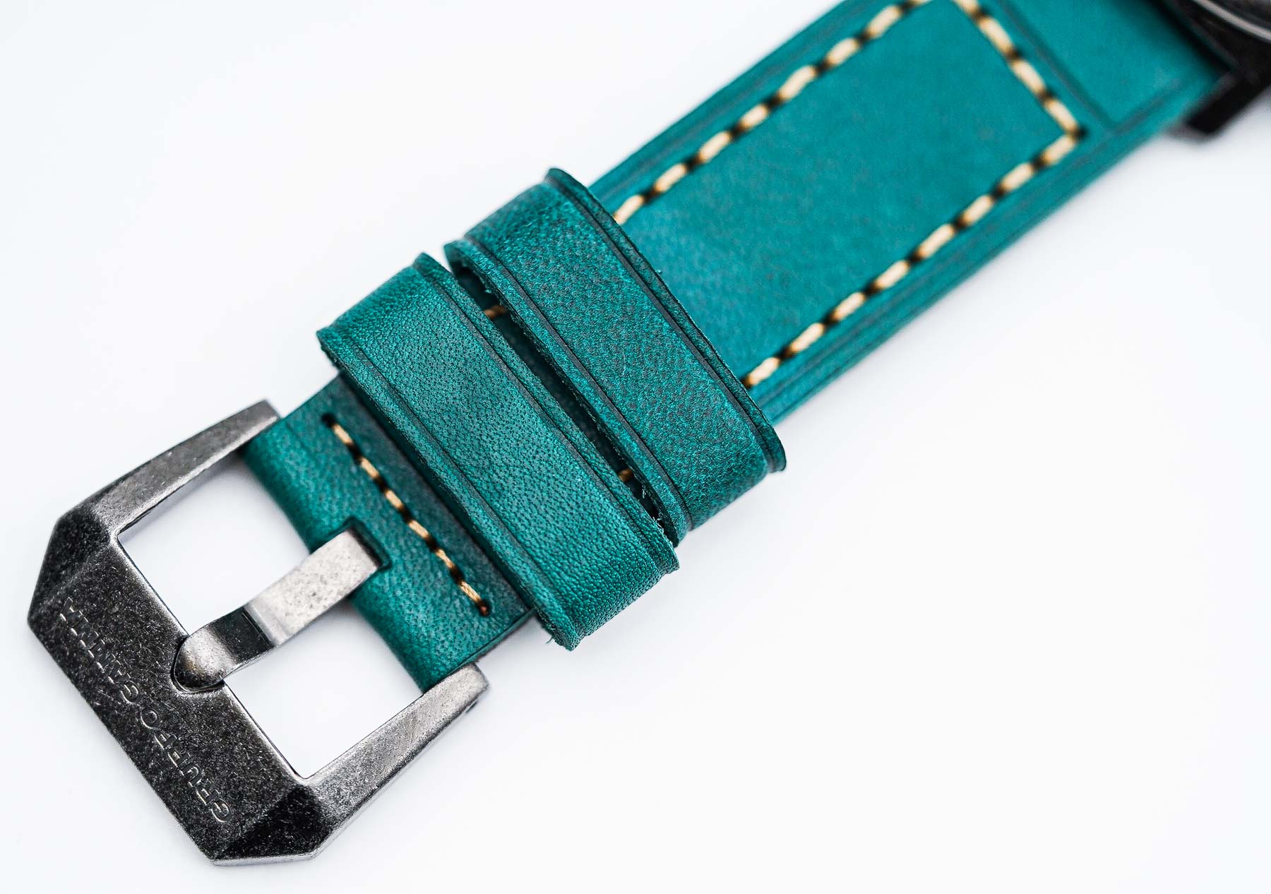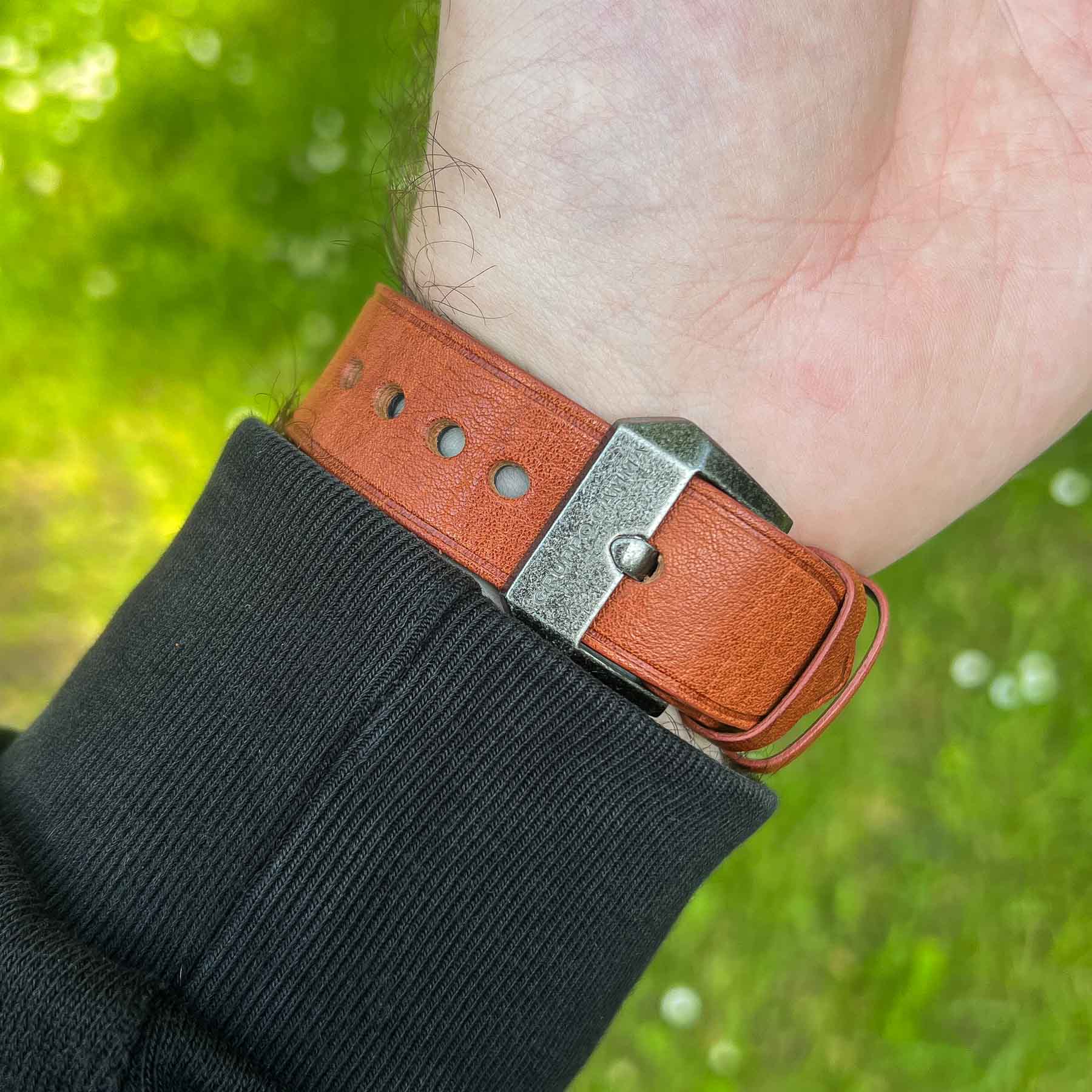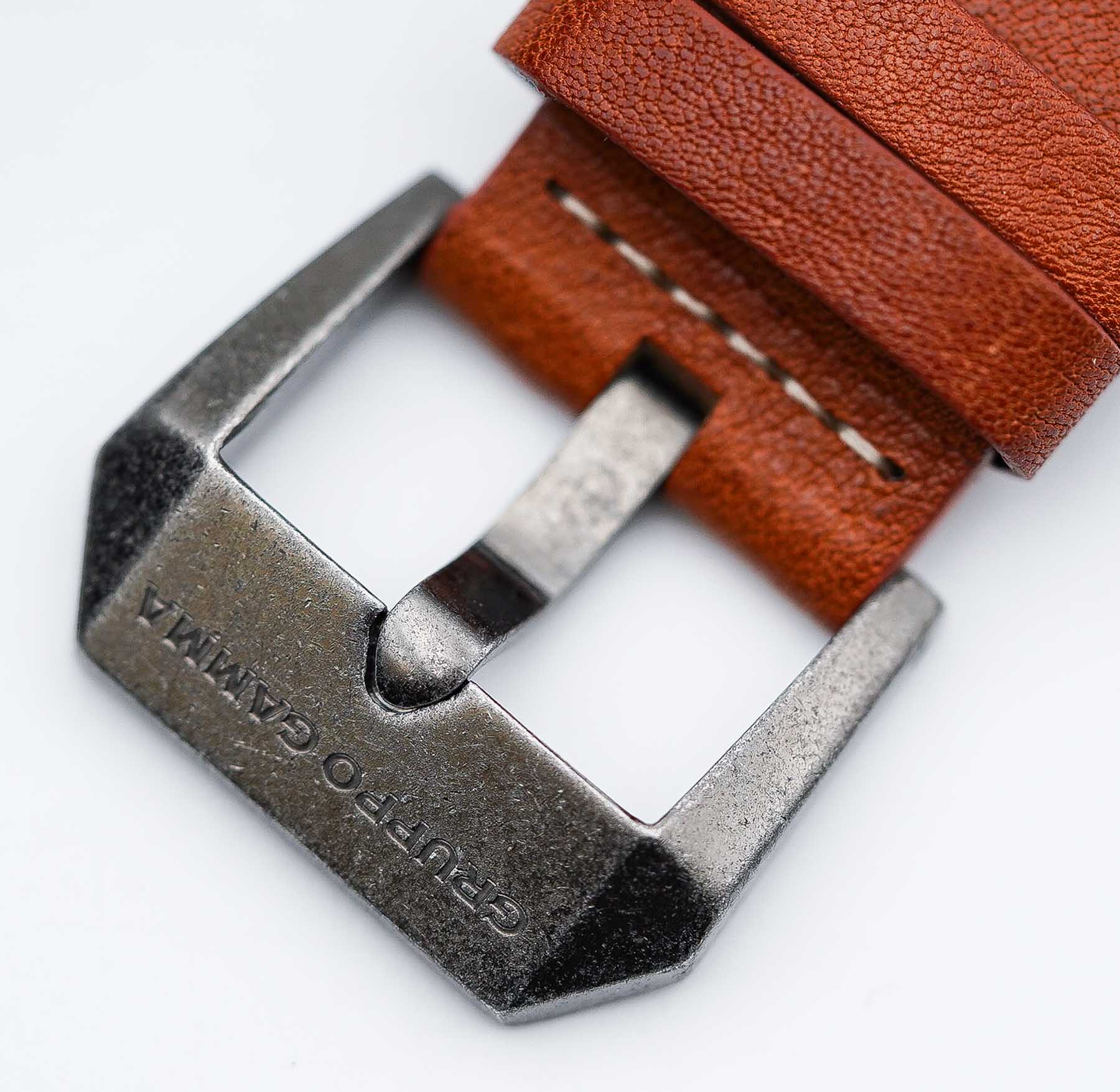 One of the definite positives of the Gruppo Gamma Vanguard AV-10 is the strap. The included light brown vegan leather strap is surprisingly impressive—it looks and feels remarkably close to real leather. Right out of the box, it’s soft, flexible, and comfortable on the wrist—no stiffness, no break-in period needed. While it lacks the signature scent of genuine leather, everything else—from the texture to the stitching—feels premium. The strap features vintage-style stitching at the lugs and buckle, adding a rugged, classic aesthetic. The underside is lined with smooth black vegan leather, and there’s subtle branding with the Gruppo Gamma logo and a stamp identifying it as vegan leather—a thoughtful and eco-conscious detail. The tang-style buckle is made of 316L stainless steel and matches the watch case with the same weathered finish. It’s also signed with the Gruppo Gamma logo, tying the whole look together nicely. At 22mm wide from lug to buckle, the strap maintains a strong, balanced presence on the wrist.
