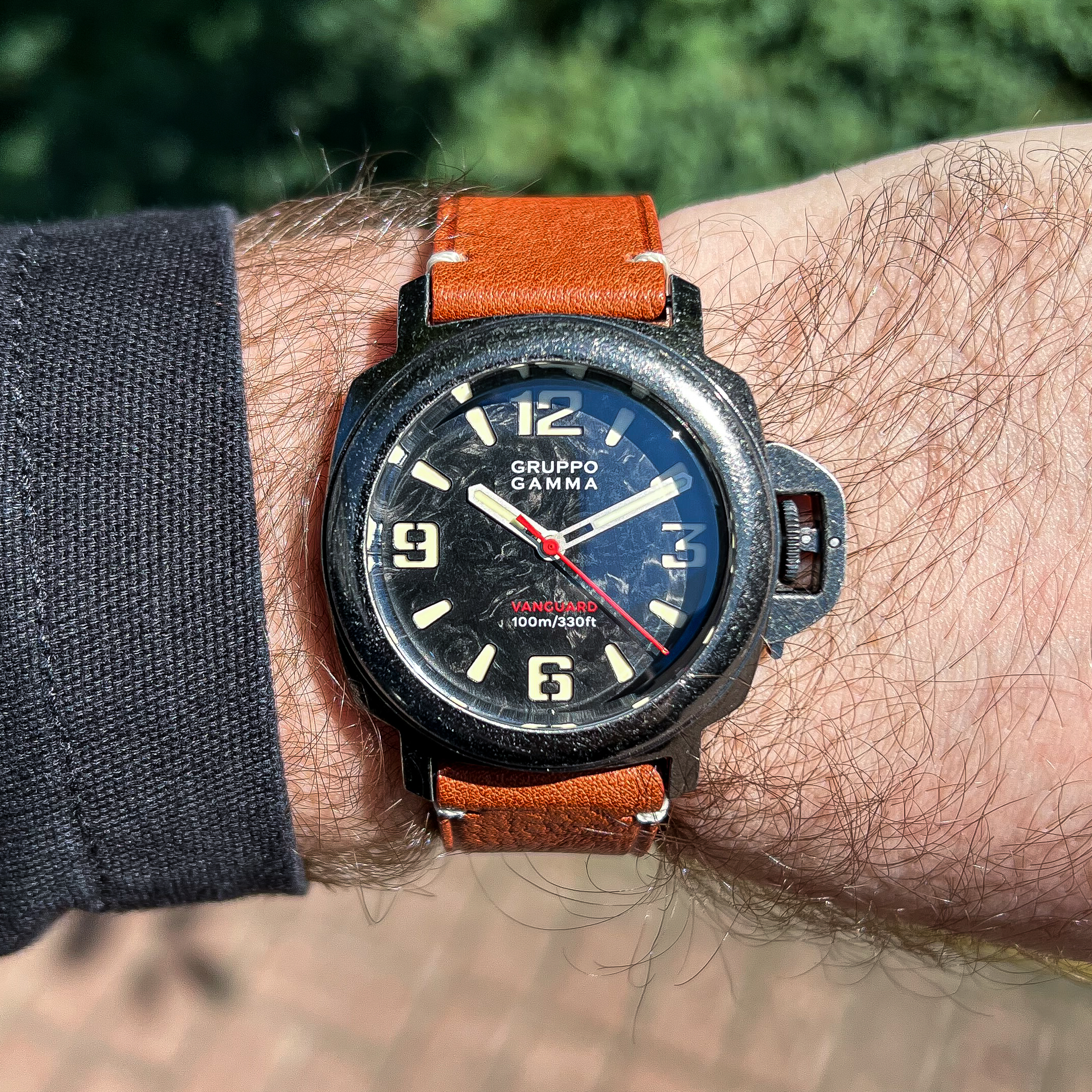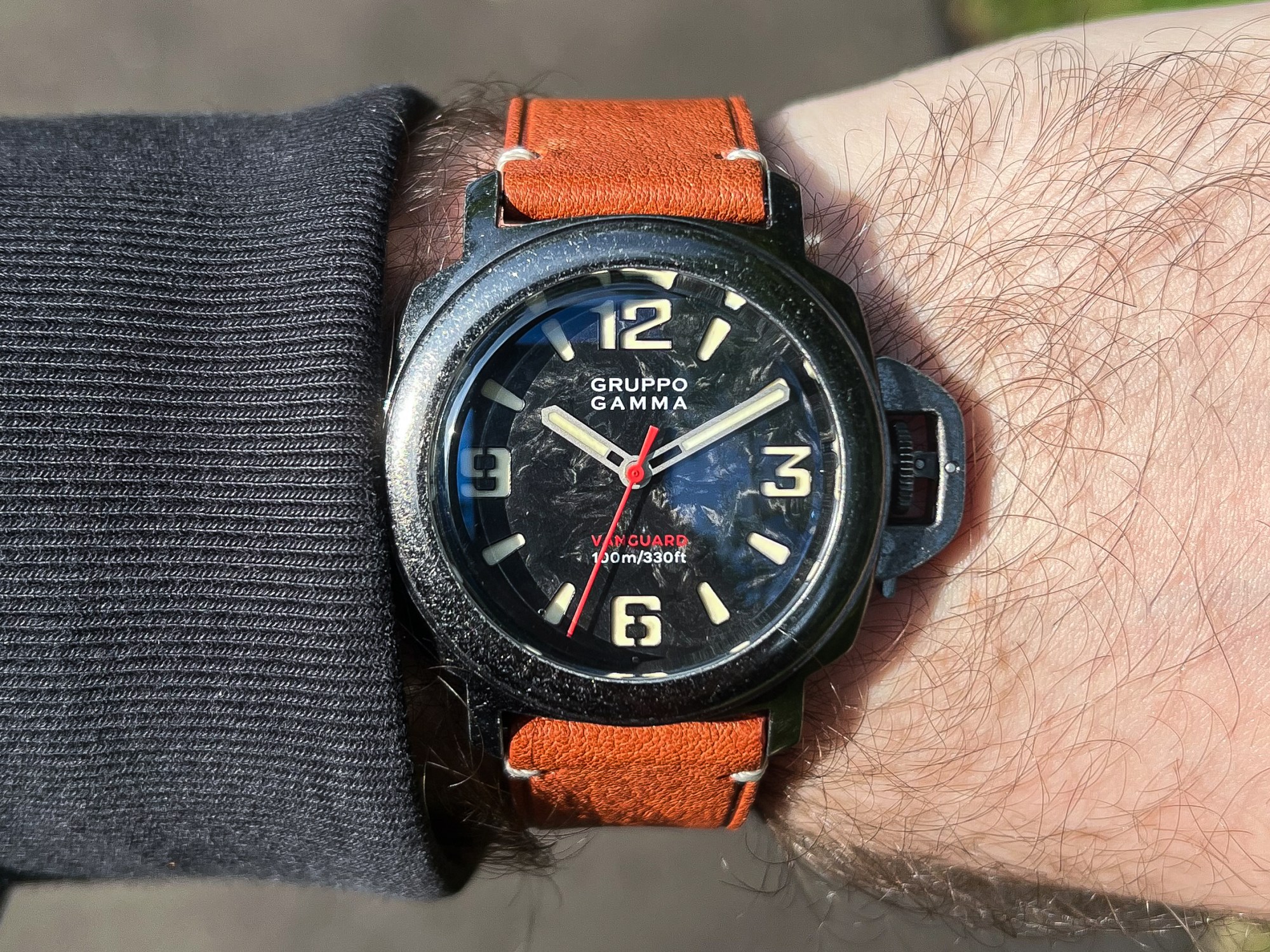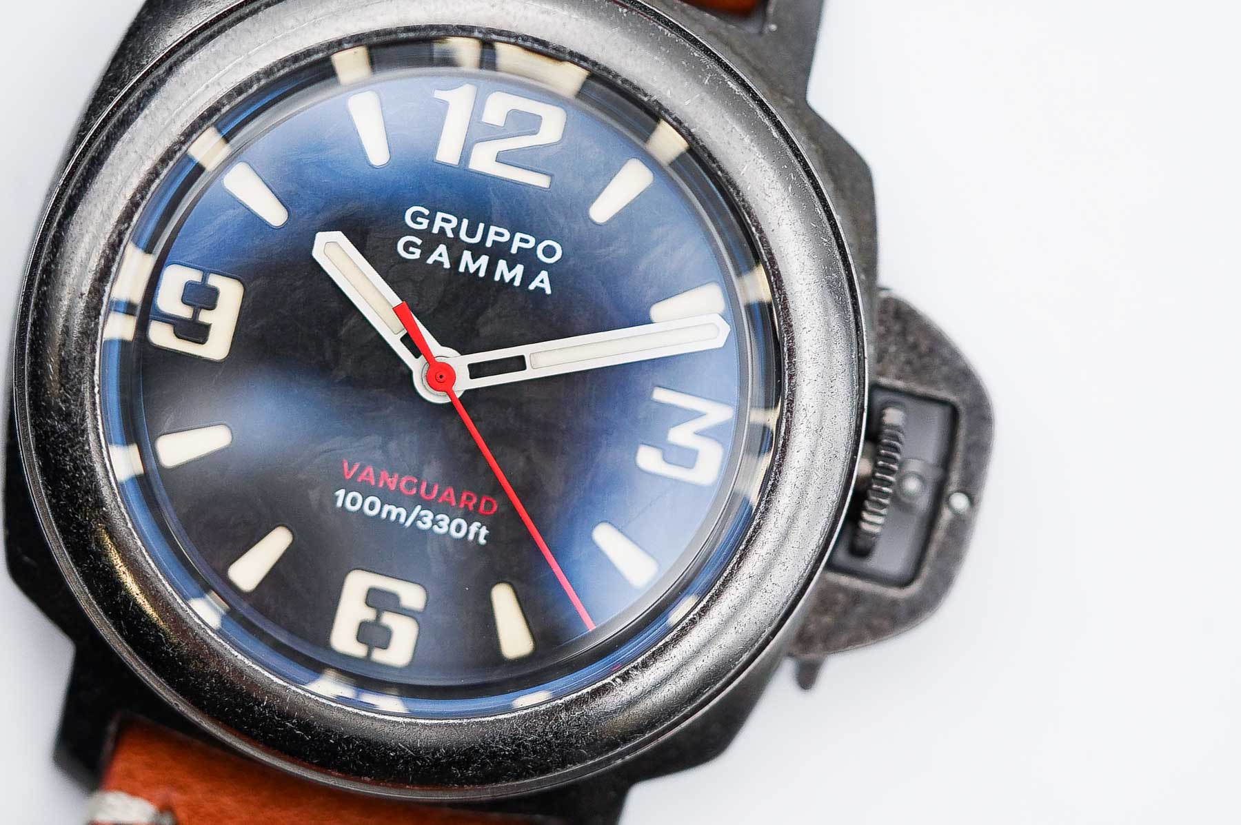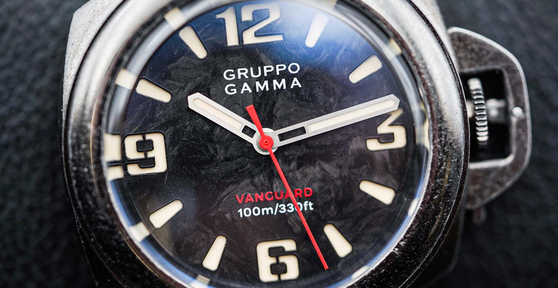 The branding is kept minimal and clean. At 12 o’clock, the Gruppo Gamma logo is printed in crisp white, while the model name and 100m depth rating sit unobtrusively at 6 o’clock in red & white, adding just the right pop of color. The hands are equally well-executed—hour and minute hands feature a sandblasted finish with generous lume application, perfectly complementing the rugged aesthetic. The red seconds hand ties in nicely with the red model name and adds a bit of visual energy. Legibility is excellent. The dial layout is clear, the contrast is strong, and thanks to both the sandwich construction and well-executed lume, it remains highly readable even in low-light conditions. The luminous-infused forged carbon isn’t just a gimmick—it adds visual depth and a modern edge that really sets the Vanguard apart from more traditional tool watches.