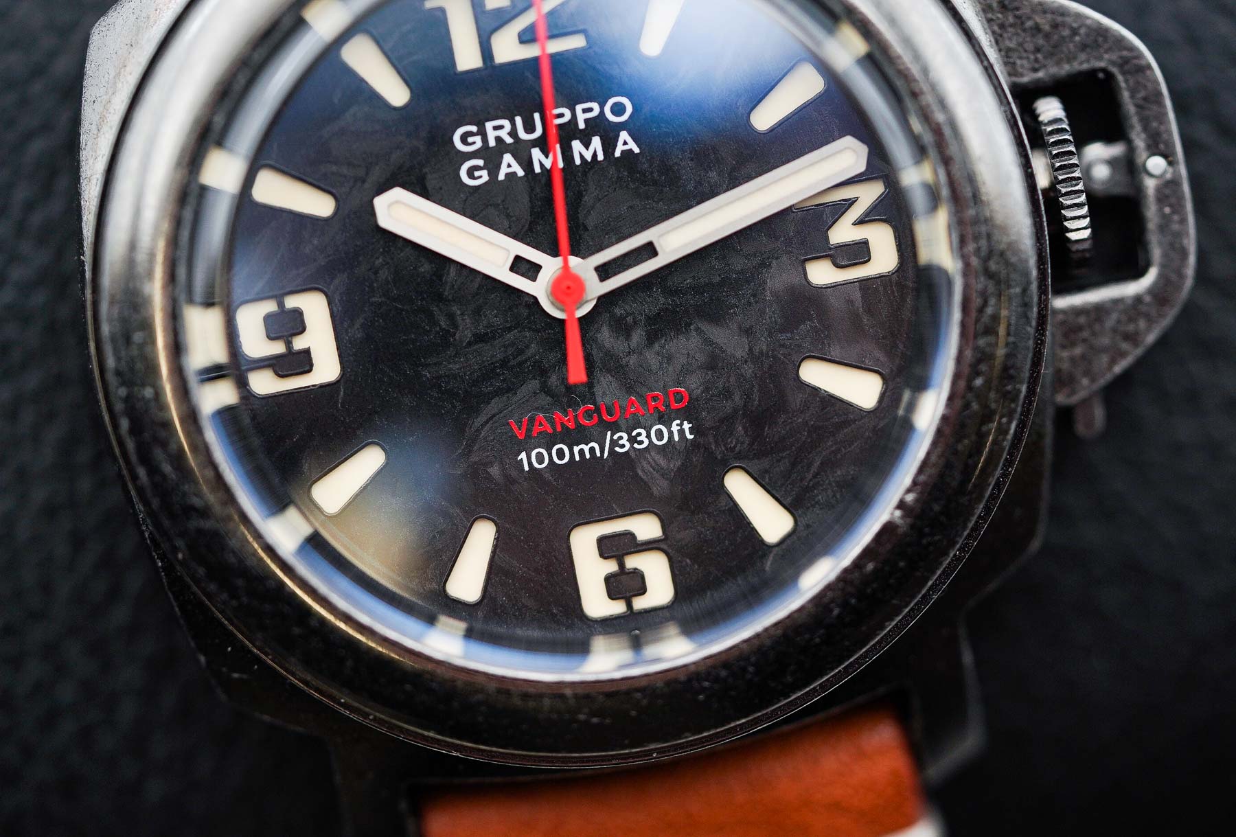 One of the standout features of the Vanguard AV-10 is undoubtedly its dial. Gruppo Gamma has taken the classic sandwich dial concept and given it a bold, modern twist—crafting the top layer from forged carbon. The sandwich construction consists of a luminous base layer with cutouts on the top layer for the Arabic numerals and hour markers, allowing the lume beneath to glow through. It’s a technique reminiscent of Panerai’s iconic dial design, but Gruppo Gamma takes it a step further: the forged carbon itself is infused with luminous pigment. Yes, the actual dial material glows. It might not add any practical functionality, but let’s be honest—it looks absolutely stunning in the dark and gives the watch an otherworldly presence.