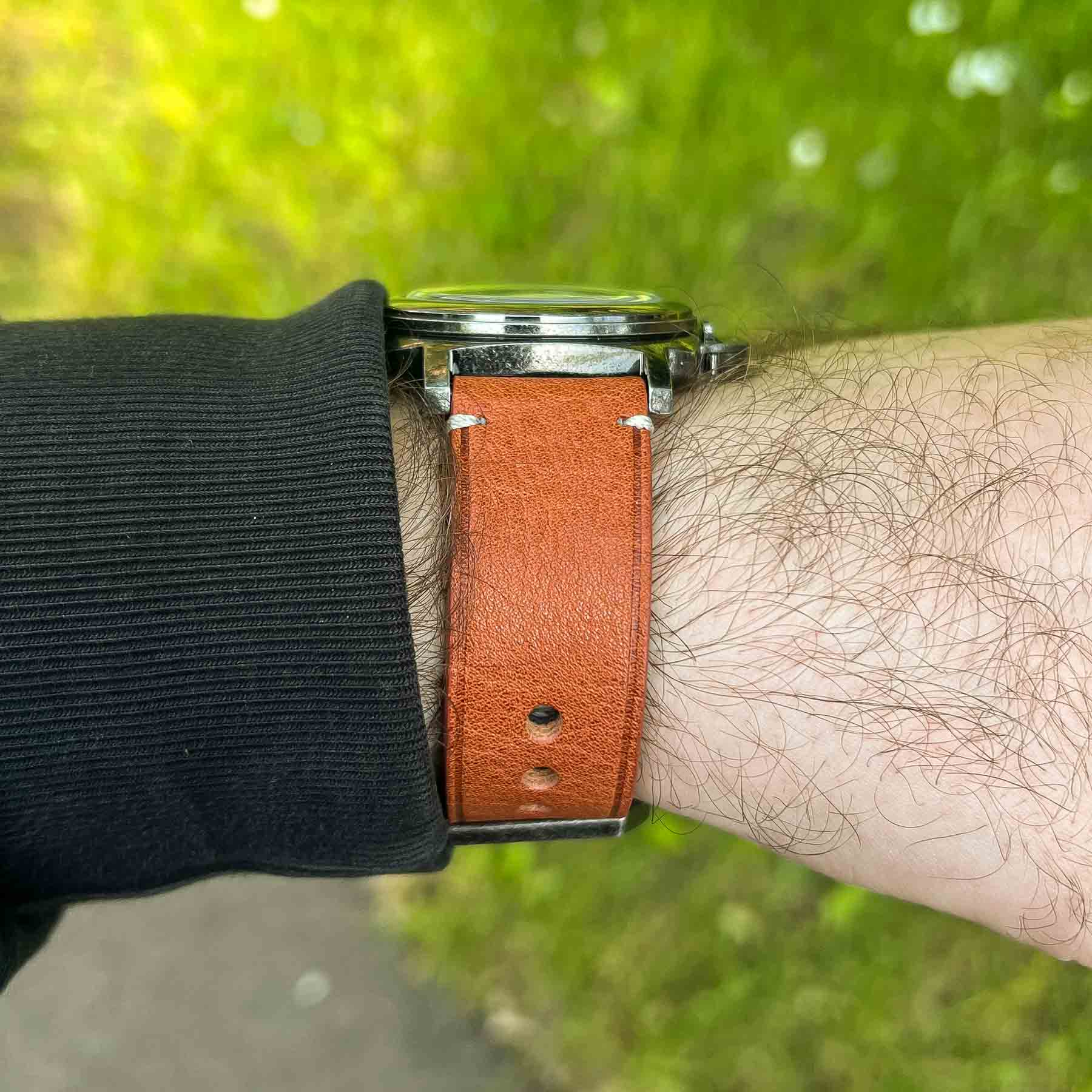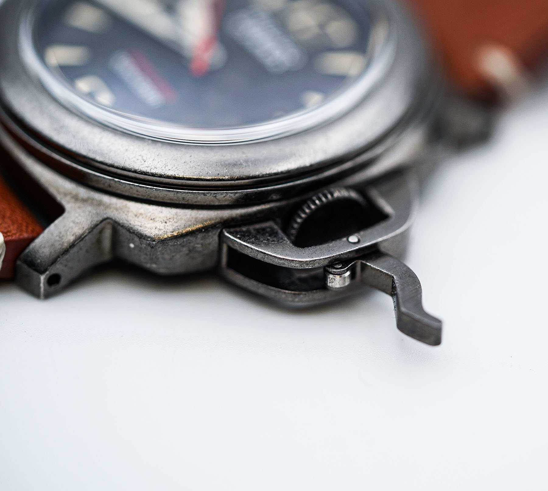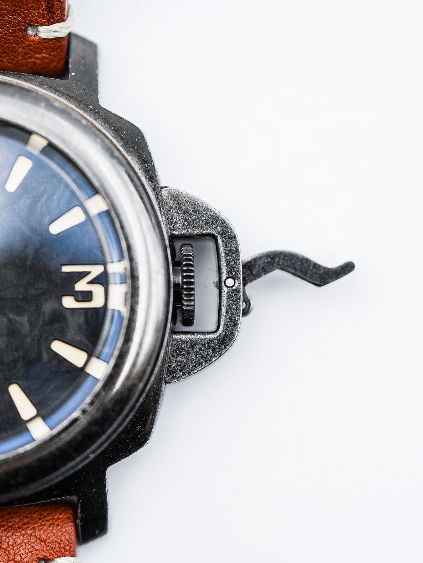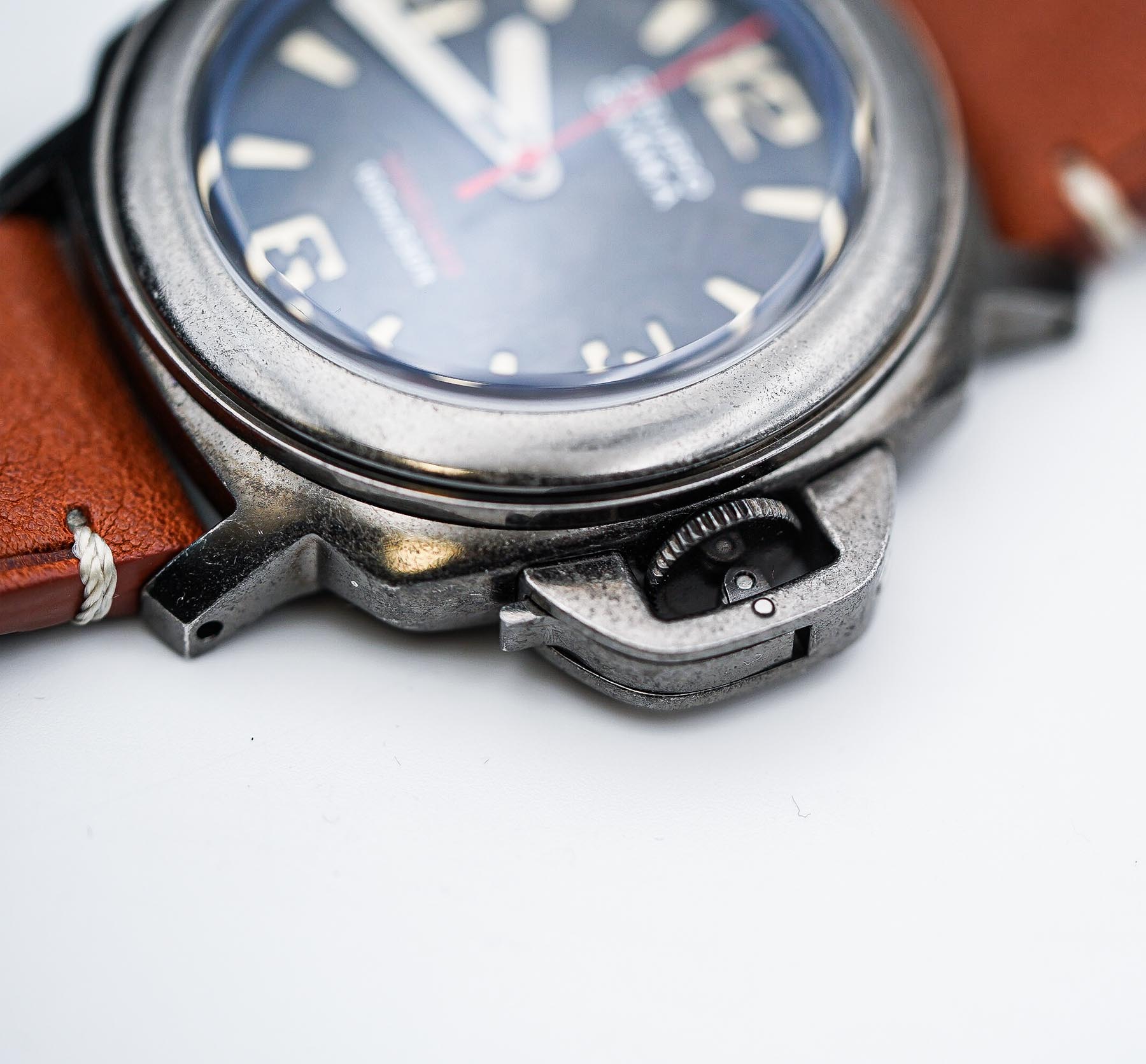 First impressions? Genuinely positive. I was particularly taken with the weathered case finish. To be honest, I had my reservations—my past experience with “distressed” finishes (looking at you, Out Of Order) left me unconvinced. But Gruppo Gamma’s approach is on a different level. The aging is even, tactile, and adds character without looking forced or gimmicky. It gives the Vanguard a sense of rugged history, like it’s already lived a few stories. Design-wise, this piece ticks a lot of boxes for me. As someone who appreciates that iconic Panerai aesthetic, the Vanguard’s semi-homage styling hits the mark—bold, masculine, and confident without being derivative. And let’s talk straps: vegan leather isn’t usually my thing, but these? These are impressively well-executed. Soft, supple, and convincingly close to the real thing—definitely among the best I’ve handled in this category.