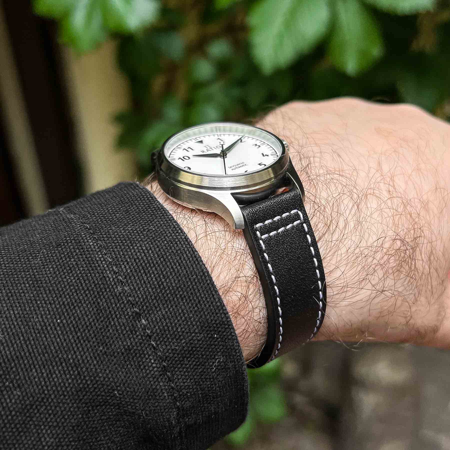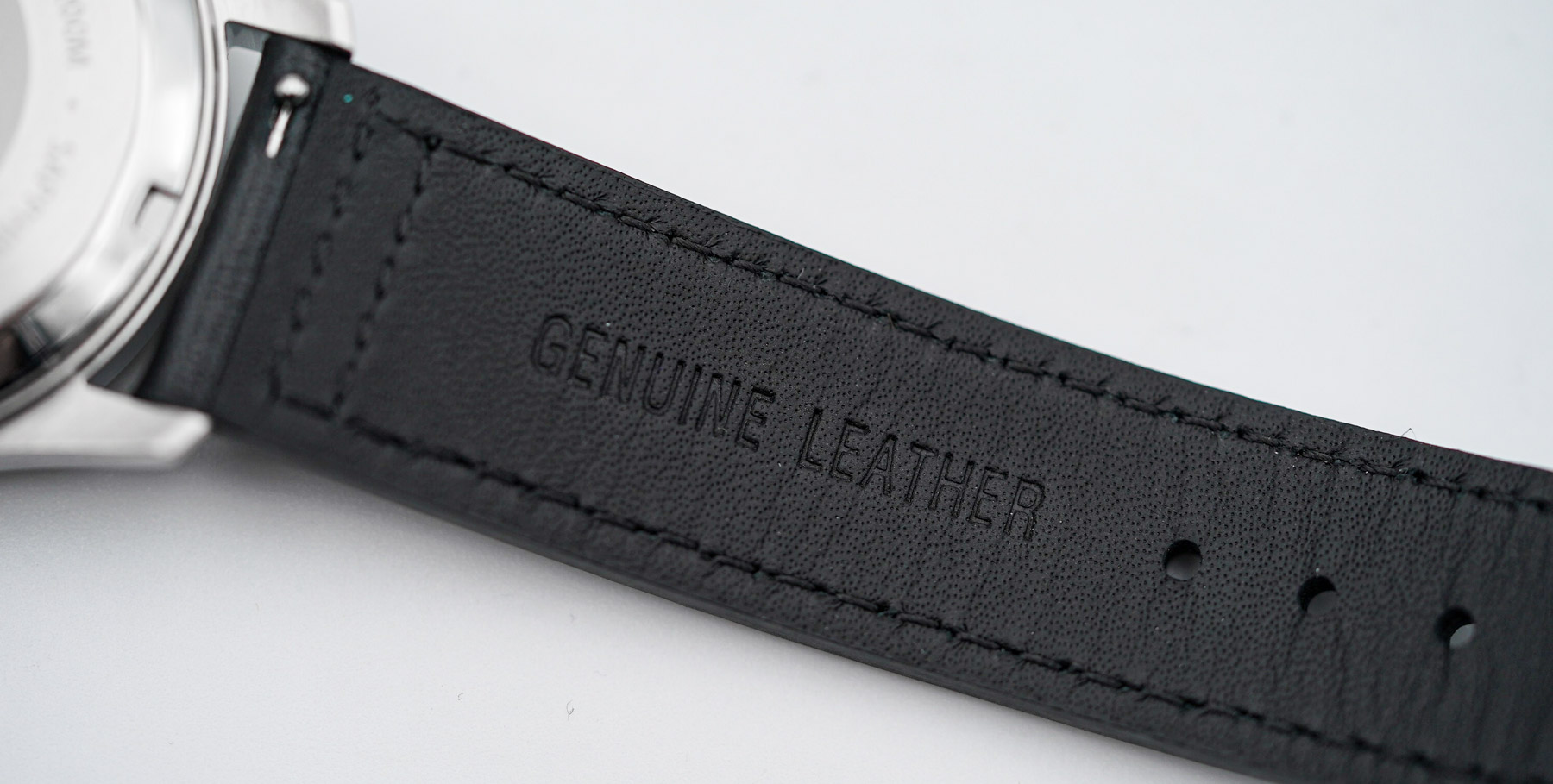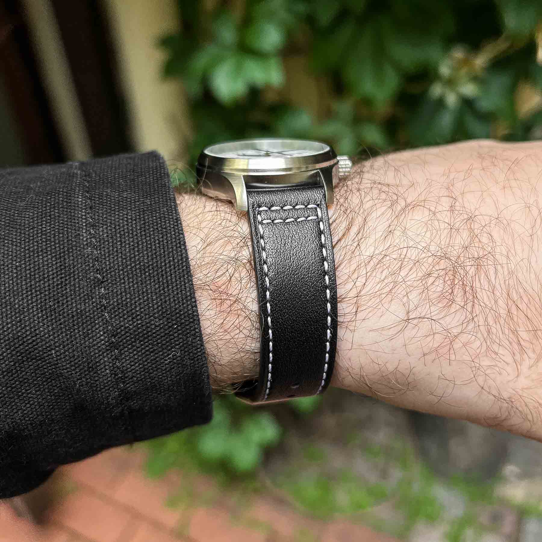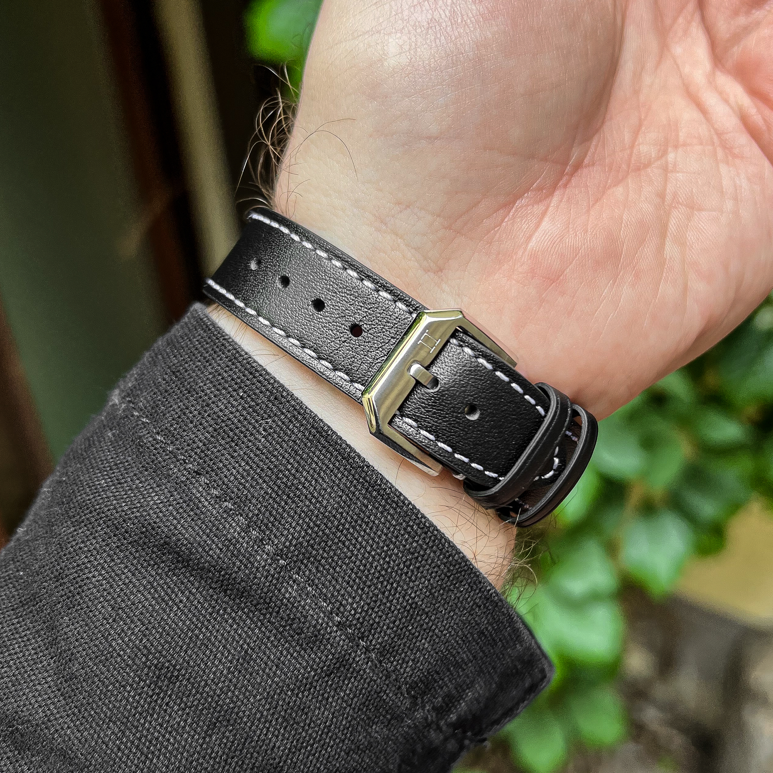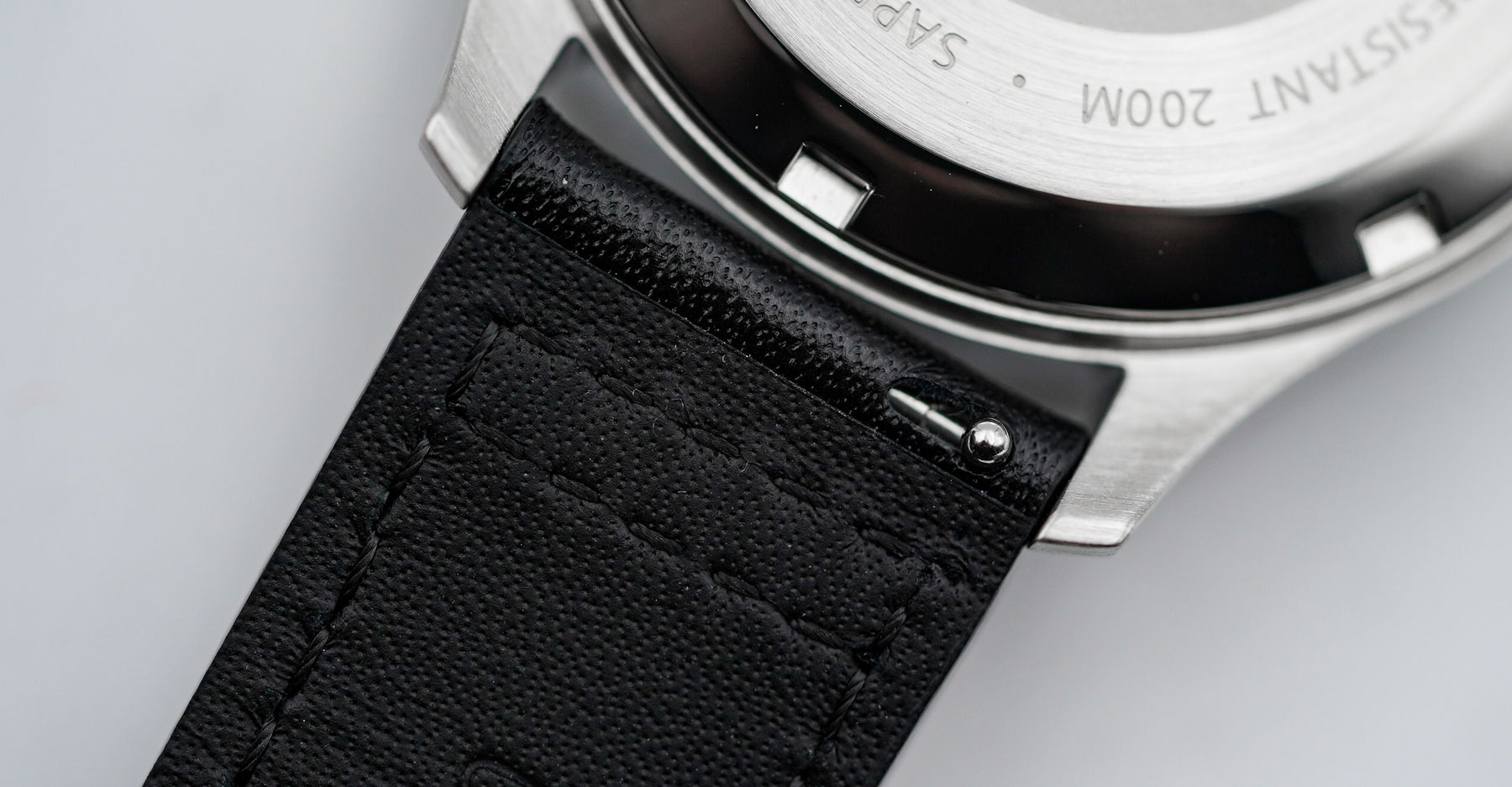 The Skysurfer comes equipped with a black leather strap in a classic Flieger style. Crafted from soft, supple leather, the strap features clean white contrast stitching that adds a touch of character without overwhelming the overall design. The underside is also lined in smooth black leather, this time with matching black stitching for a more understated finish. Although the strap itself is unsigned, this is understandable at this price point and not something I find concerning. It tapers subtly from 20mm at the lugs to 18mm at the buckle, offering a refined profile on the wrist. The tang-style buckle, however, is signed and showcases a tasteful combination of brushed finishing with polished edges, giving it a premium feel. A practical highlight is the inclusion of quick-release spring bars, which make swapping straps a breeze. Out of the box, the strap is remarkably comfortable and requires virtually no break-in time. I’ve also experimented with pairing the Skysurfer with a variety of other straps, and it handles them all with ease — it’s a true strap monster.