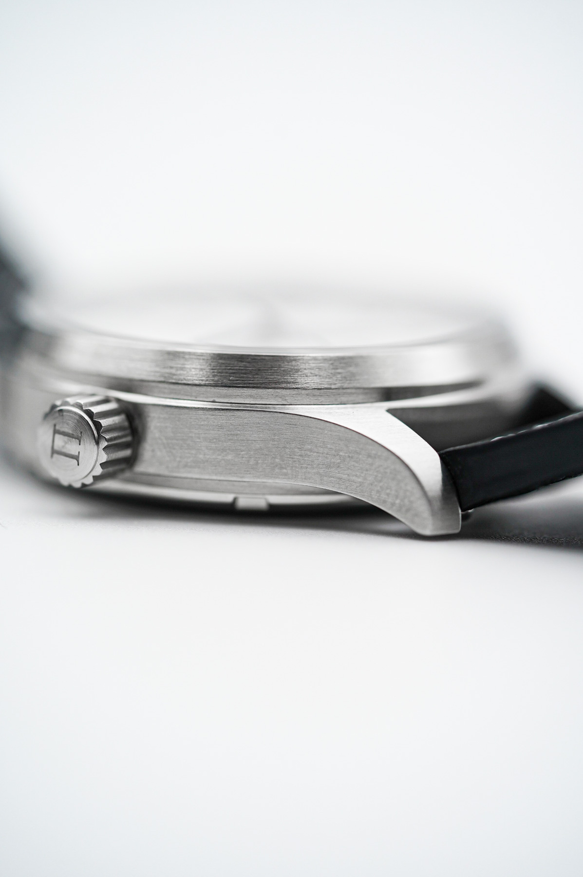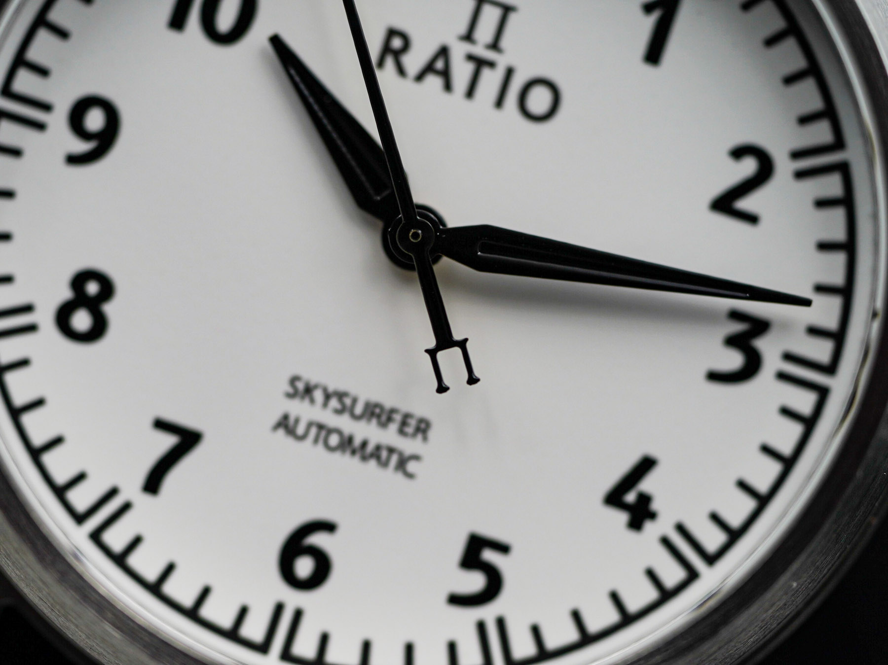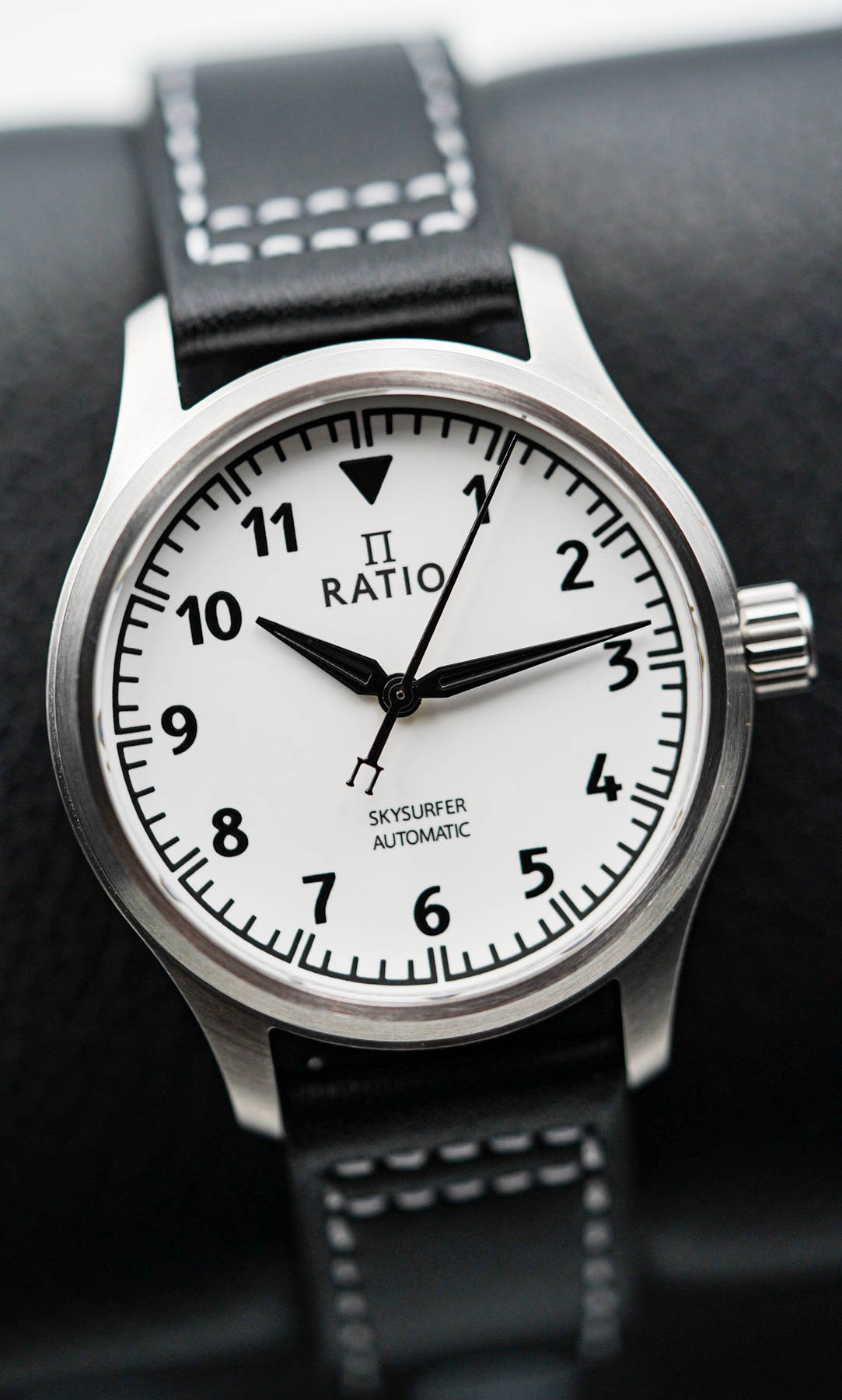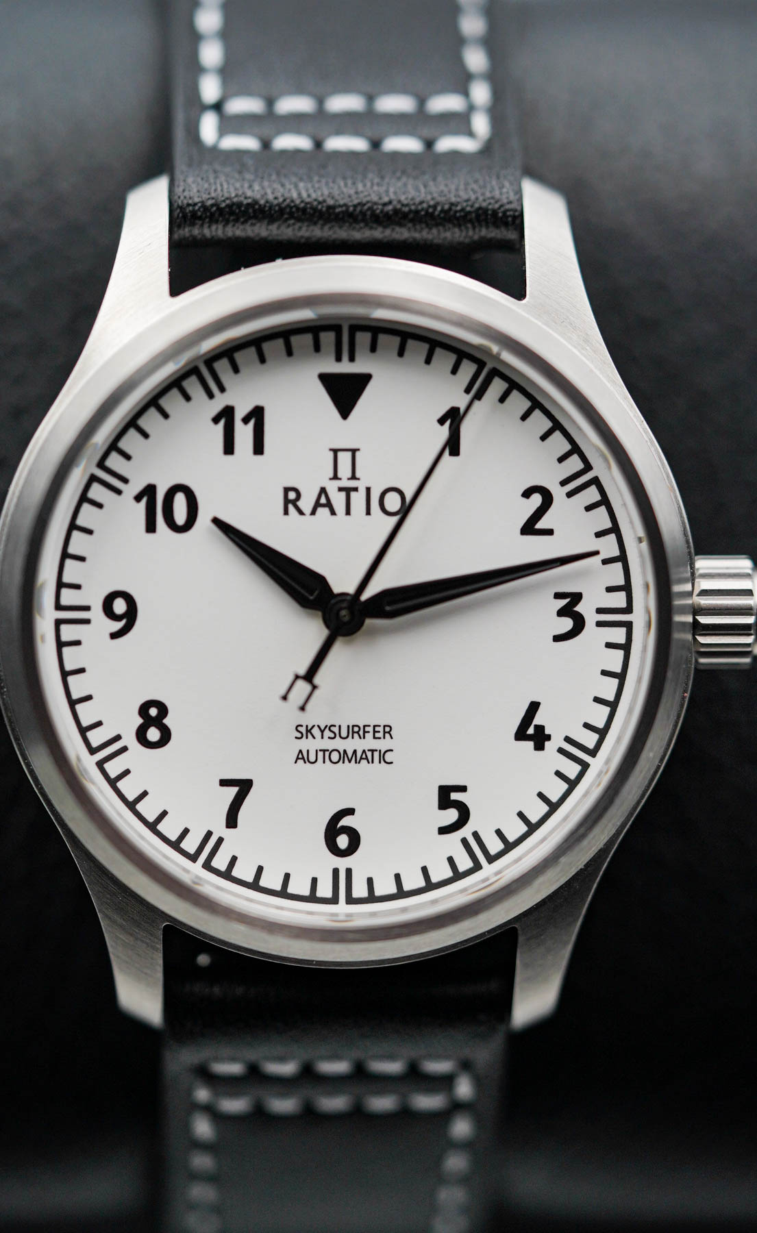 All numerals and minute markers are sharply printed in glossy black, delivering excellent contrast and readability. The sword-shaped hands, also in glossy black, maintain the strong legibility while reinforcing the watch’s utilitarian character. A slender needle-like seconds hand extends cleanly to the outer minute track and features a subtle Ratio “R” logo as a counterbalance—an elegant branding touch that adds a hint of personality without disrupting the traditional flieger aesthetic. Overall, the dial delivers clarity, balance, and functionality, remaining highly legible in all lighting conditions. It’s a refined execution of a historic design, with thoughtful updates that make it both modern and practical.