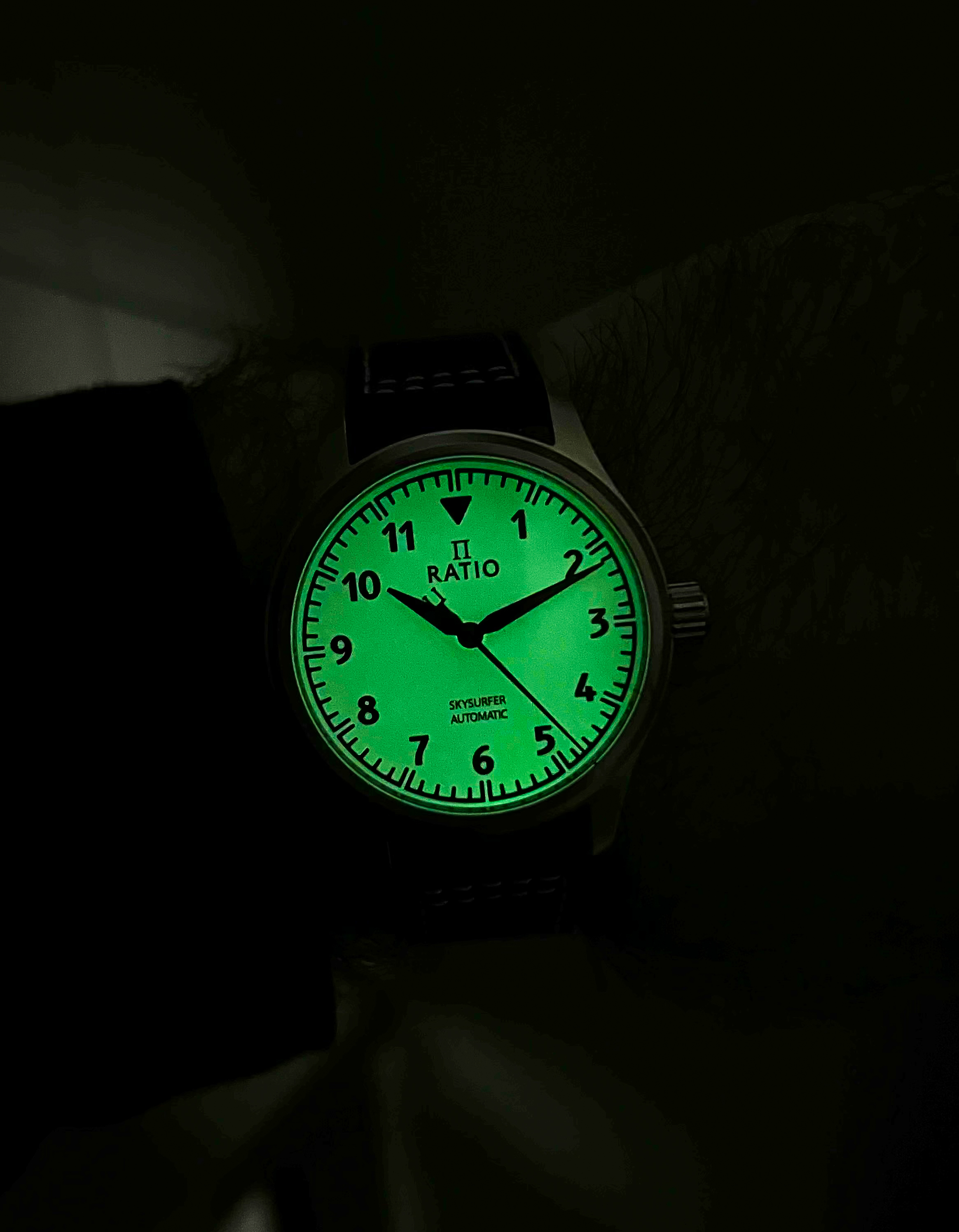 When Ratio offered me the opportunity to review two of their watches, I selected one dive watch (which I’ll keep under wraps until the next review goes live) and paired it with a pilot-style timepiece. The watch we’re focusing on today comes from their Skysurfer collection—a lineup of 12 aviation-inspired models featuring blue, black, and full-lume dials in various layouts, all paying tribute to classic pilot’s watches. Notably, the full-lume dial version commands a slightly higher price than its blue and black counterparts. Still, it immediately caught my eye. I’ve always been drawn to the concept of fully luminous dials, though in practice, the execution often falls short (yes, I’m looking at you, AVI-8).