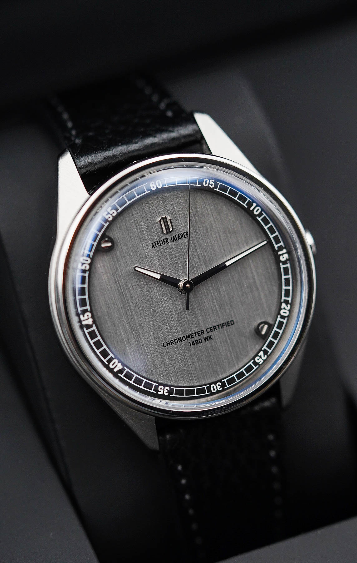 The chapter ring itself is a masterstroke. Evoking the Smiths gauges in the original E-Type’s dashboard, it features chemin-de-fer track markings and bold Arabic numerals at 5-minute intervals. The outer scale provides just enough visual hierarchy to tell time intuitively, despite the absence of hour markers. At 12 o’clock sits the Atelier Jalaper logo, while at 6 o’clock you’ll find the “1480 WK” registration number of the donor Jaguar—a detail as romantic as it is specific. The handset consists of polished, obelisk-shaped hour and minute hands, both filled with lume, and a needle-thin polished seconds hand that extends gracefully across the dial. Their forms subtly echo the pointed needles found on vintage Smiths gauges, reinforcing the automotive theme without shouting.