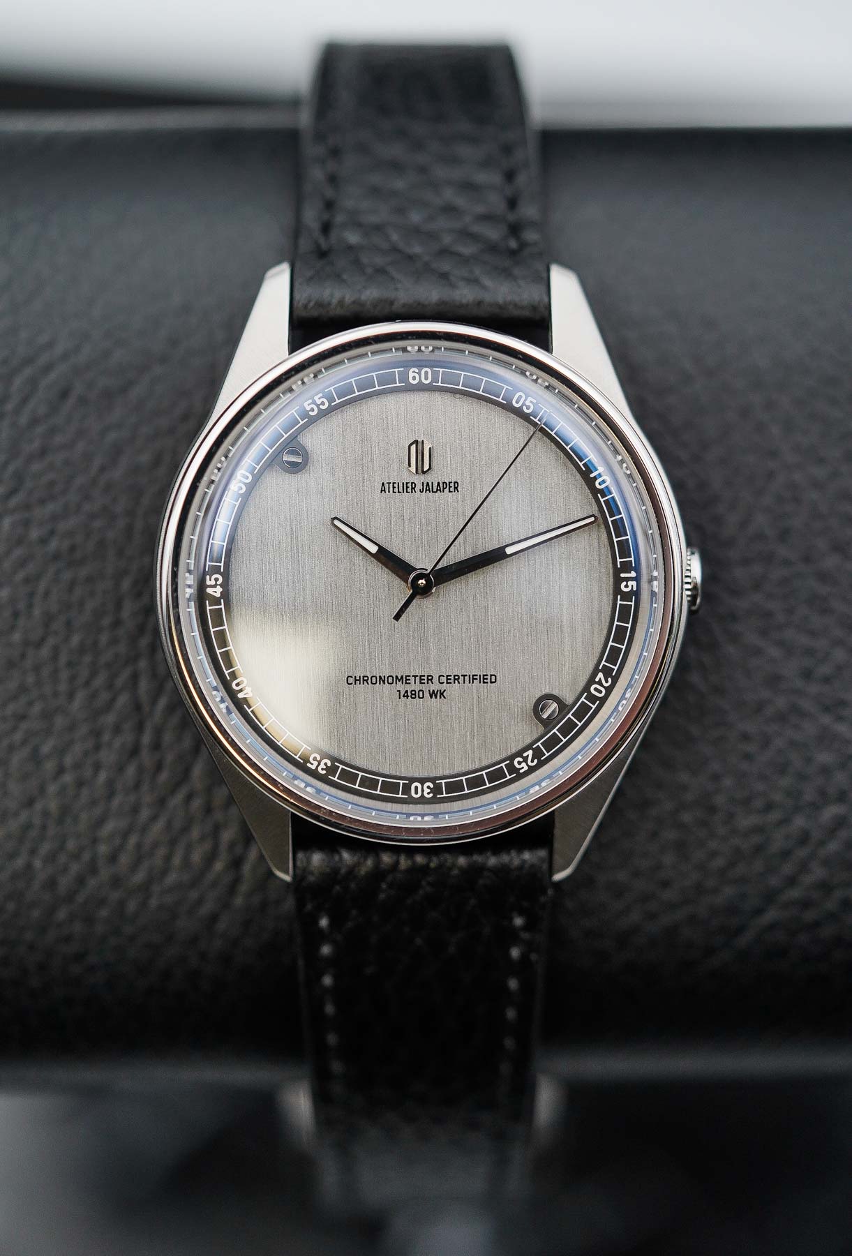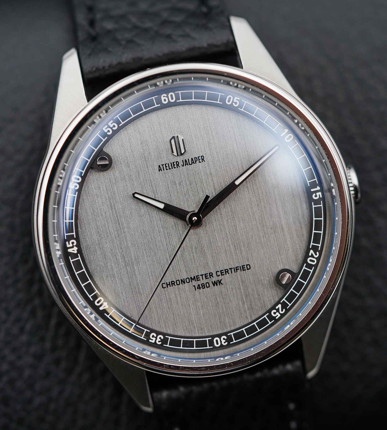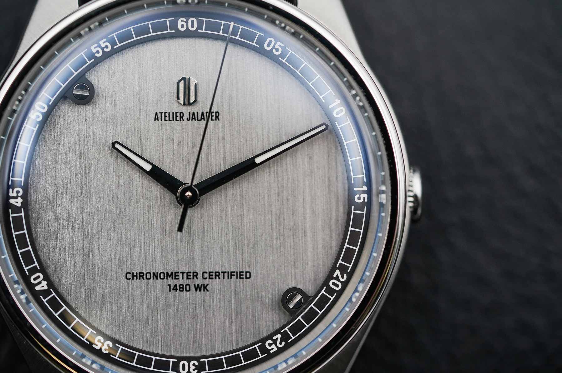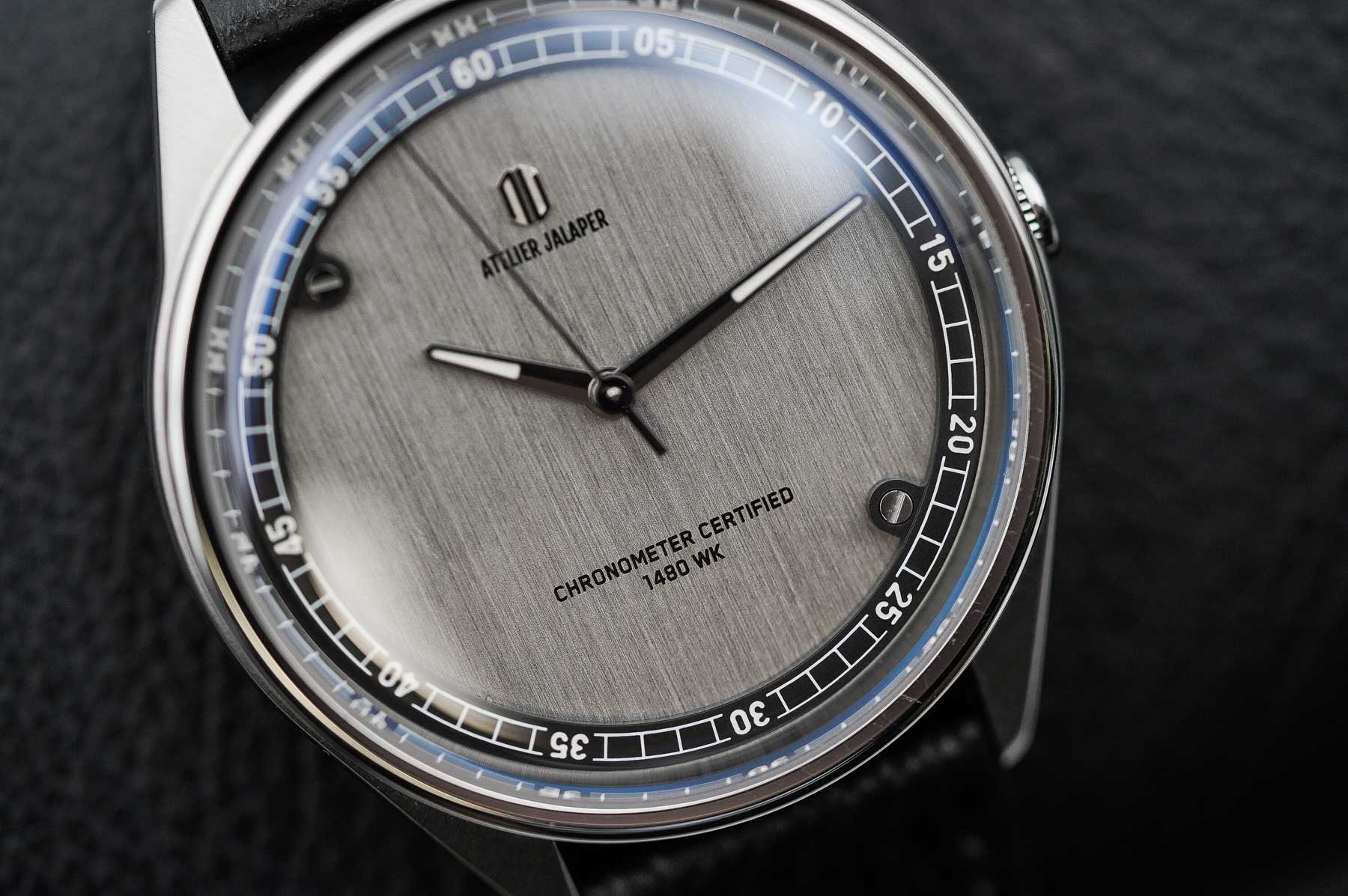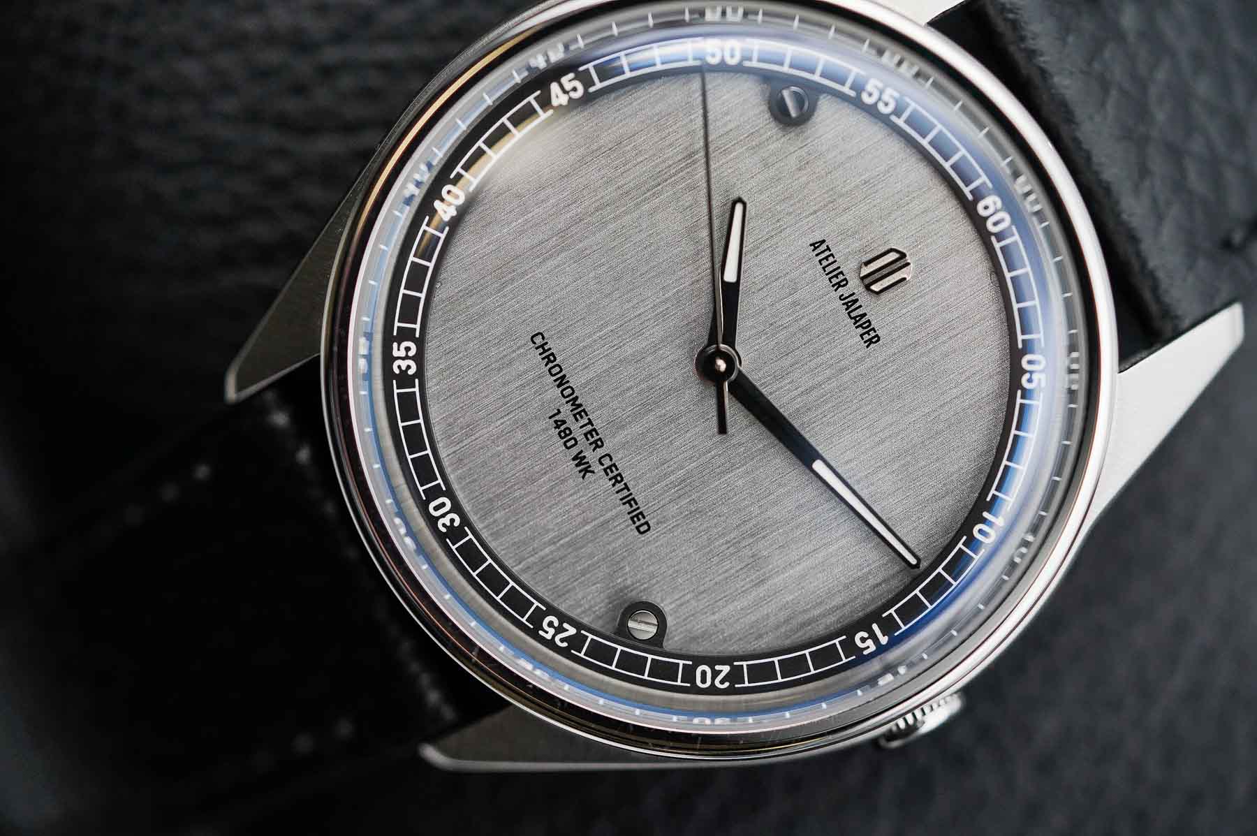 The dial is, without question, the soul of the AJ-003. It’s not just inspired by a Jaguar E-Type; it is one. Specifically, it’s crafted from the aluminum bonnet of a 1962 E-Type Series 1 Semi-Lightweight—a car that saw motorsport glory and then, fatefully, suffered a crash in 2020 during the French Tour Auto. Rather than consigning the wreck to history, Atelier Jalaper has given a part of it new life. After acquiring the bonnet from the car’s owner, the brand stripped away layers of paint, cut the raw aluminum into circular blanks, and then applied a fine vertical brushing. Two distinct dial treatments are offered: one retains the original brushed aluminum tone with a dark gray chapter ring, while the other is anodized black and paired with a white chapter ring. The chapter ring is slightly raised above the dial and secured by two visible screws, which may divide opinions. Some see them as honest tributes to automotive engineering; others may find them disruptive to the dial’s symmetry.