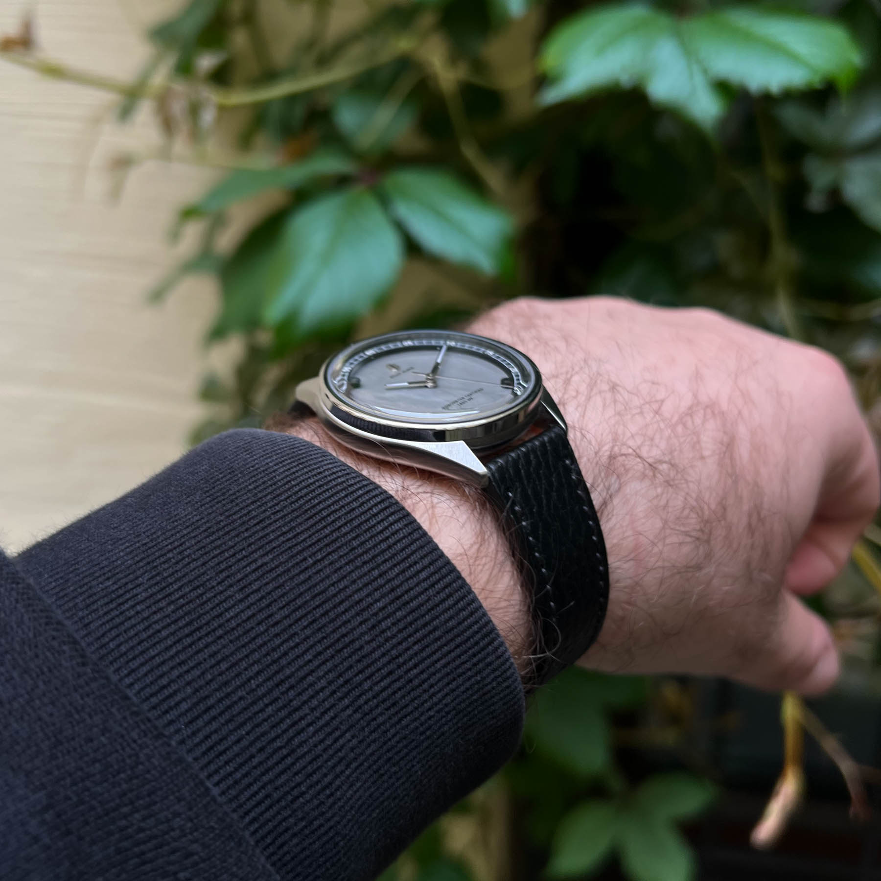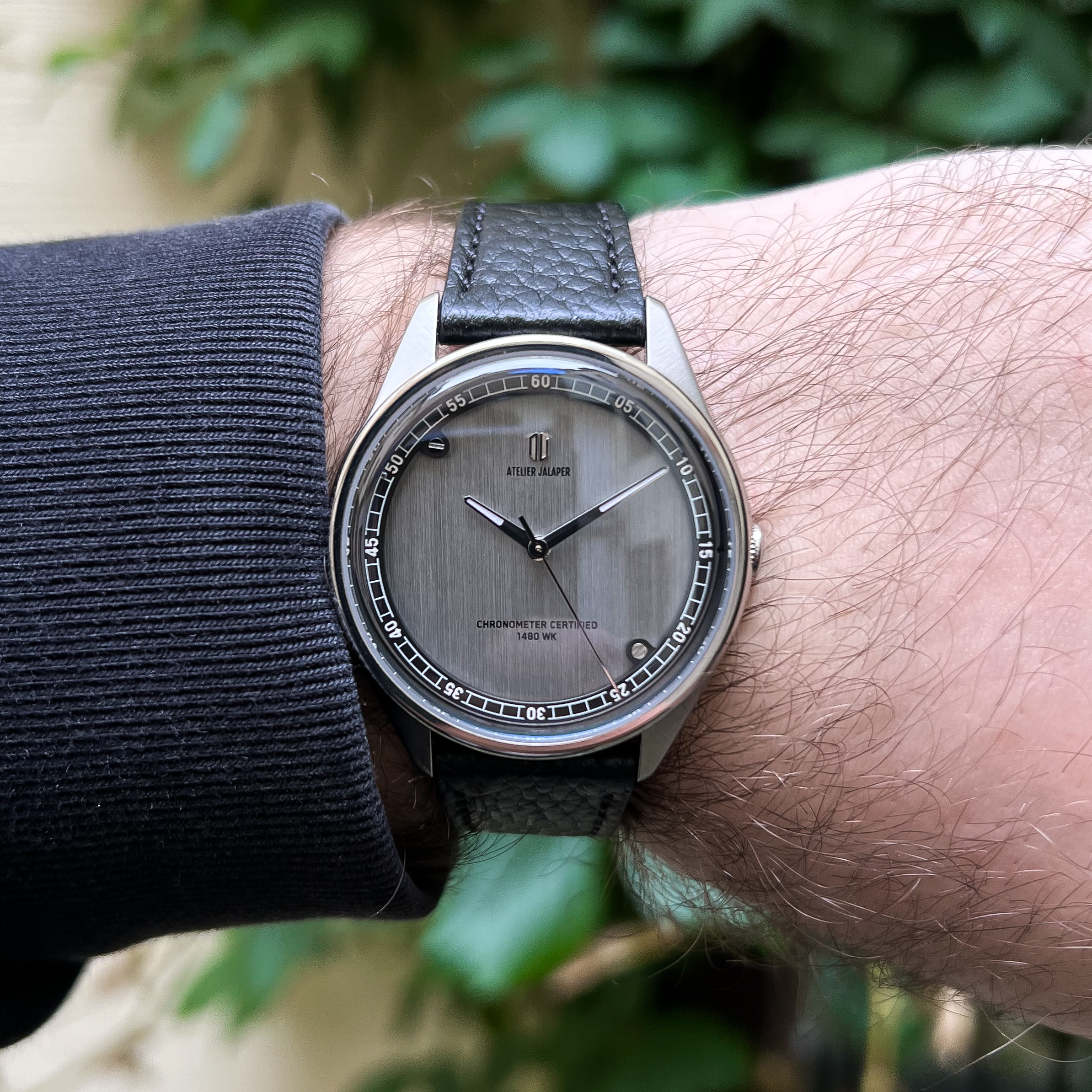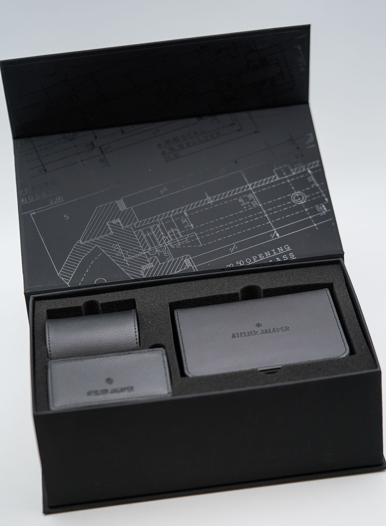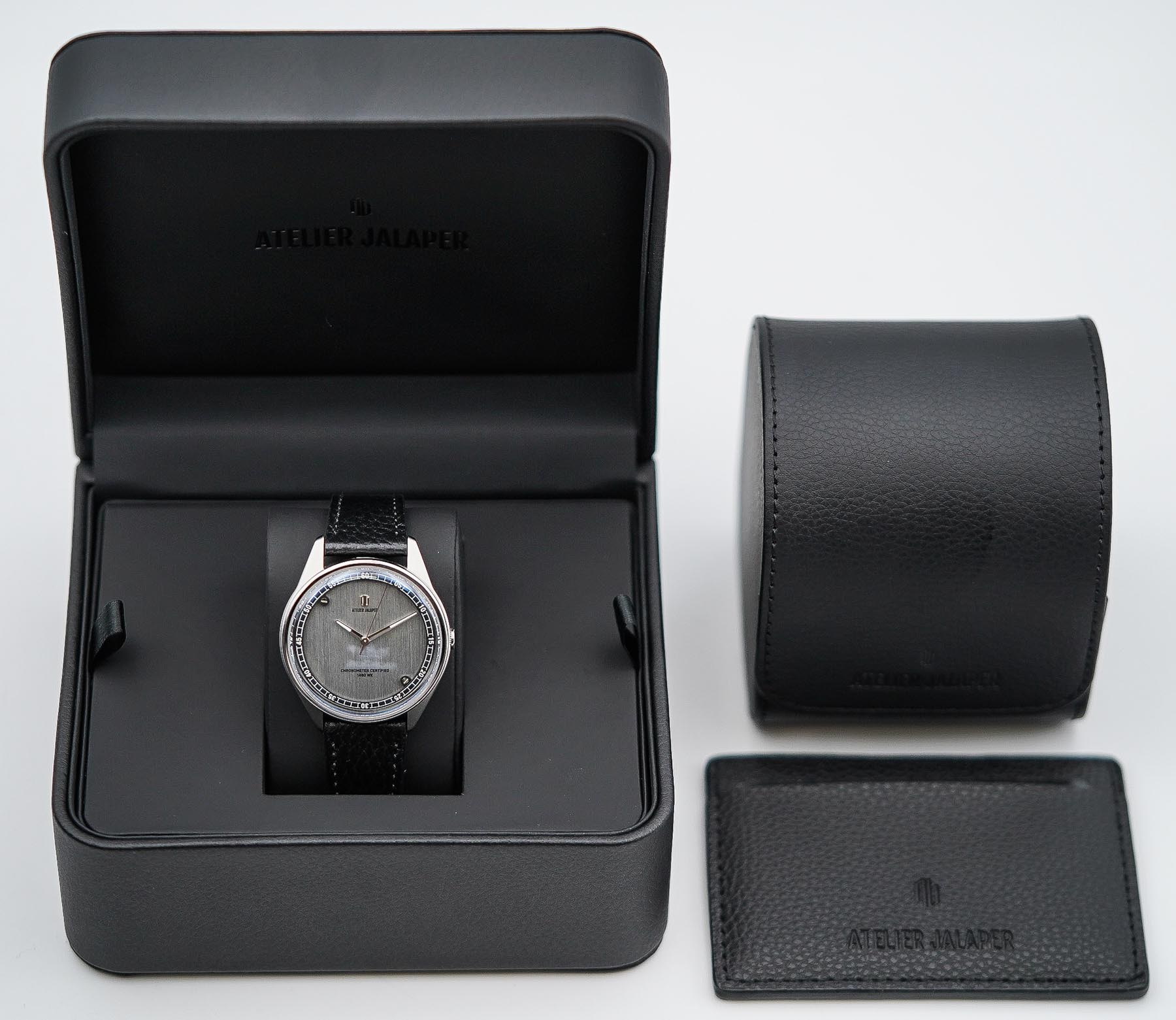 As I’ve mentioned in other reviews, smaller boxes—or better yet, just a high-quality travel pouch—make for more sustainable and reusable packaging. Large boxes tend to end up forgotten in closets, gathering dust. As someone with an ever-growing watch collection, I’ve already started discarding boxes for pieces I know I’ll never sell, and I still find myself running out of space. A streamlined package with just the essentials—the watch, pouch, and warranty card holder—would have been more than sufficient and far easier to store. That said, my first impressions of the watch itself were immediately positive. The proportions are elegant, and the overall design is tastefully understated. One small wish: I would’ve loved to see Atelier Jalaper leave a hint of the original red paint from the salvaged E-Type bonnet on the dial. It would’ve been a striking visual callback to the watch’s automotive roots, and a bold reminder of the material’s previous life.