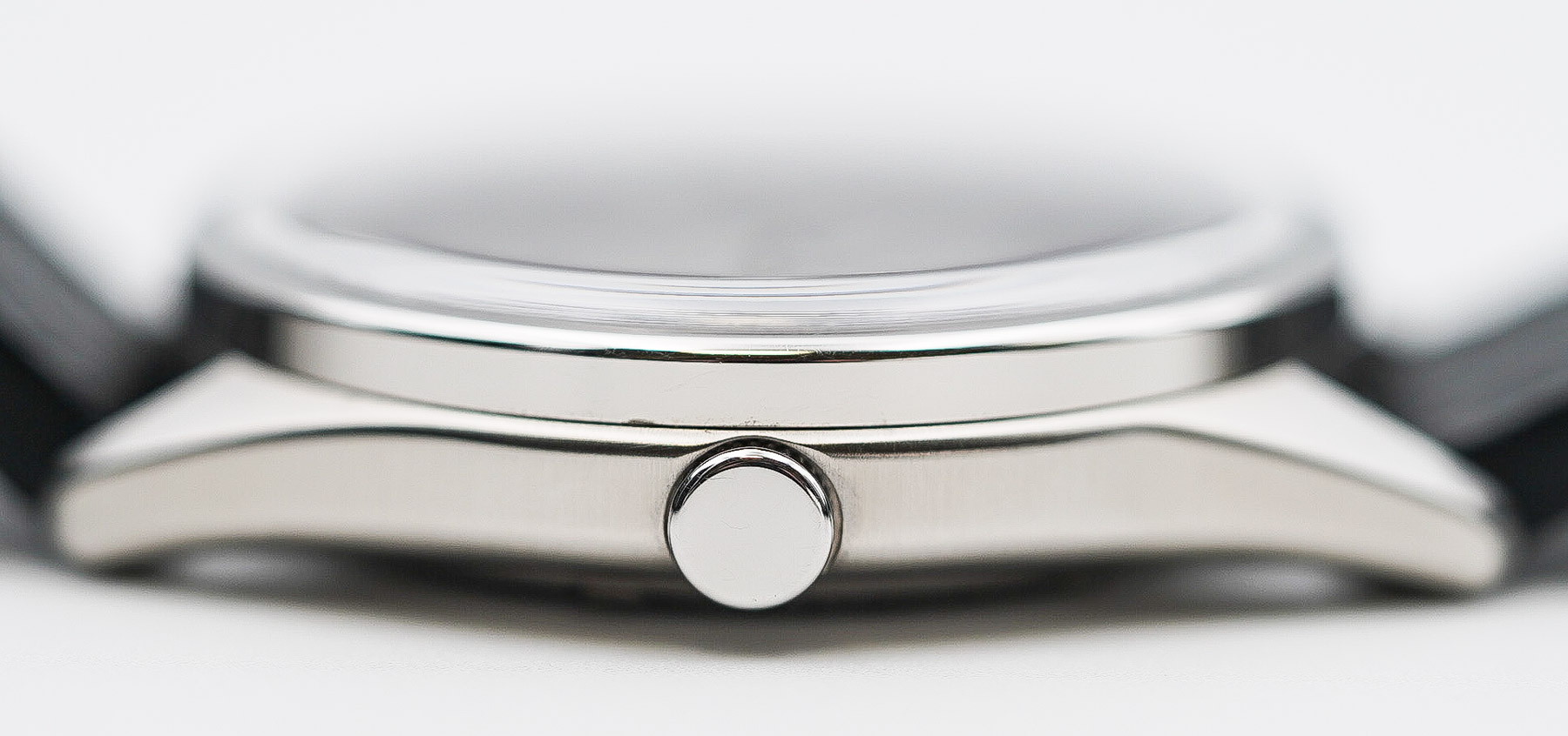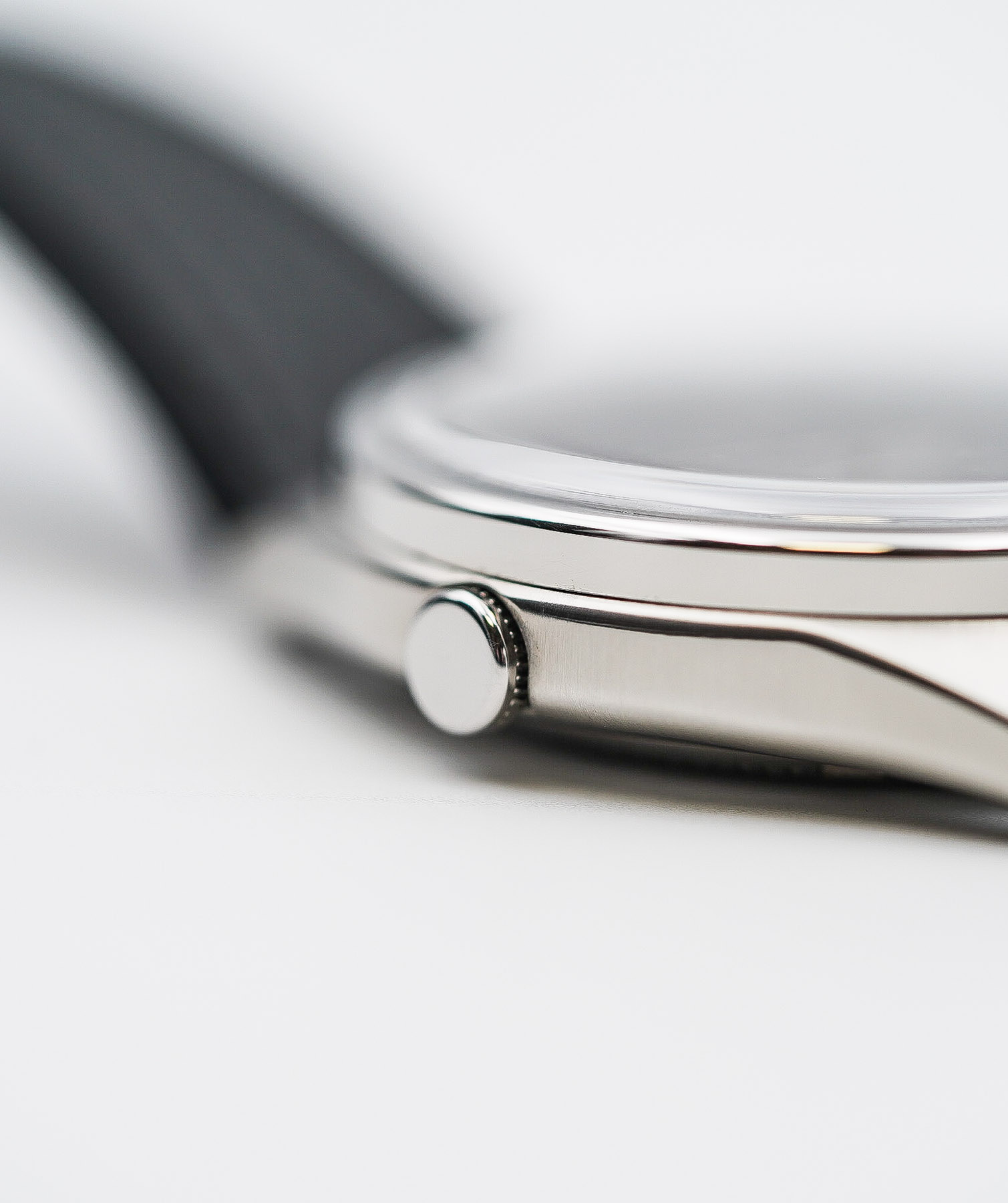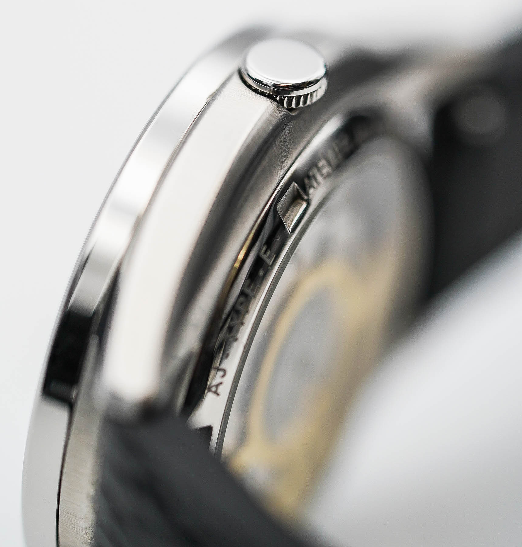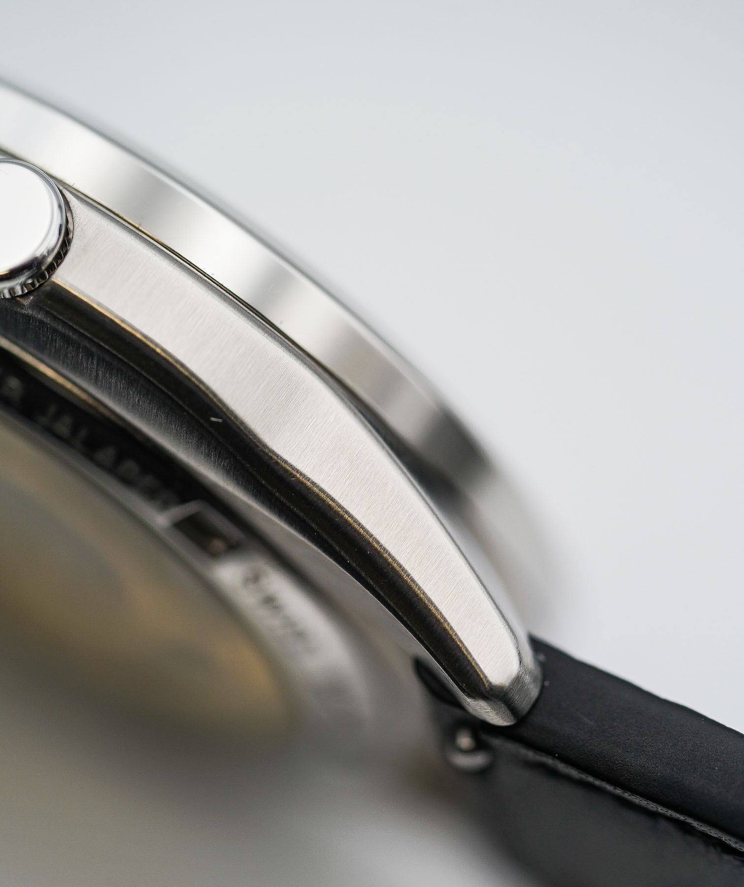 There’s not a hard edge in sight—every line is curved or softened, a tribute to the E-Type’s famously flowing silhouette. The flanks, lugs, and bezel are all carefully rounded, and surfaces are finished with a mix of brushing and polishing. The upper lug surfaces receive sunburst brushing for added visual dynamism, while the tall, smooth bezel is mirror-polished, framing the dial with refined contrast. A semi-recessed crown at 3 o’clock—hooded to resemble the way the E-Type’s fenders envelop its wheels—completes the case’s automotive homage. While the screw-down exhibition caseback ensures some protection from the elements, the crown itself does not screw down, capping water resistance at 50 meters—enough for daily wear. Still, the case is a triumph of subtlety. Rather than a literal or heavy-handed reinterpretation, it takes design cues and translates them into a unique silhouette that could just as easily pass as a well-considered design with no external reference at all. That’s the point: it’s meaningful to those who know, and quietly attractive to those who don’t.