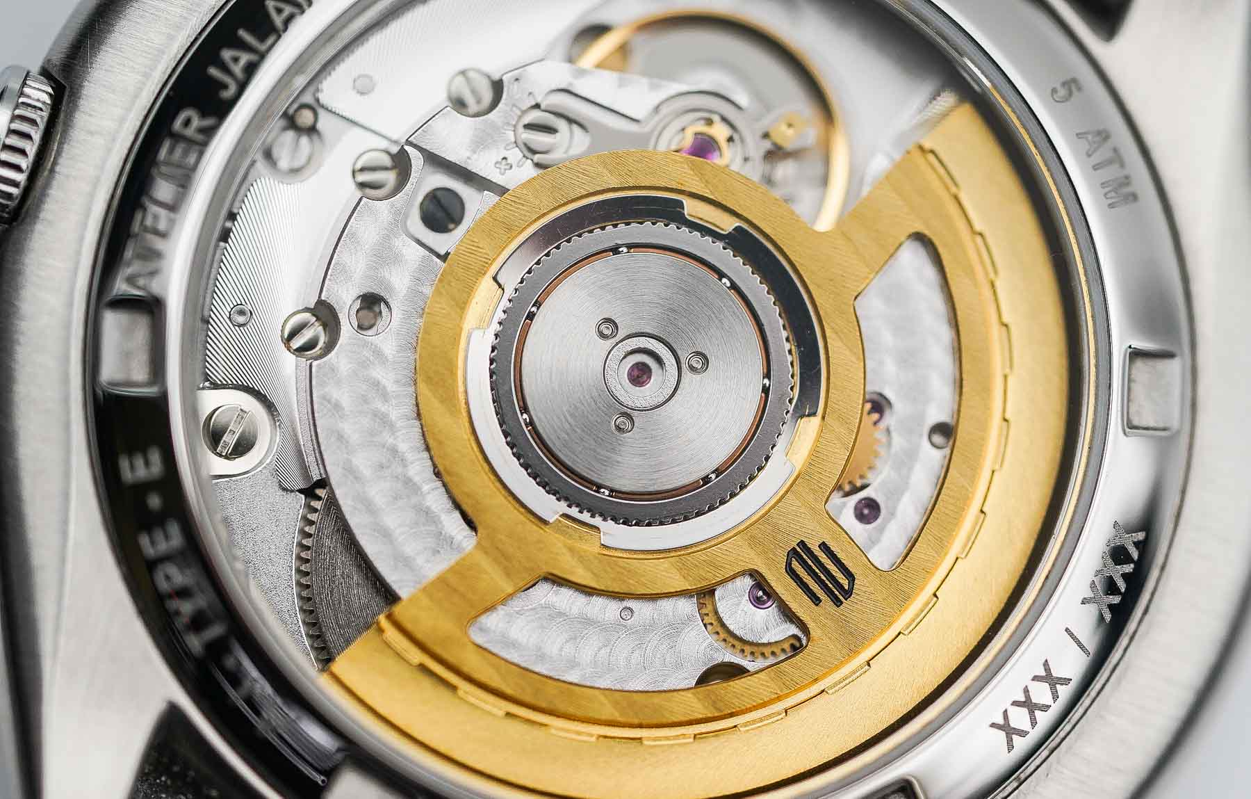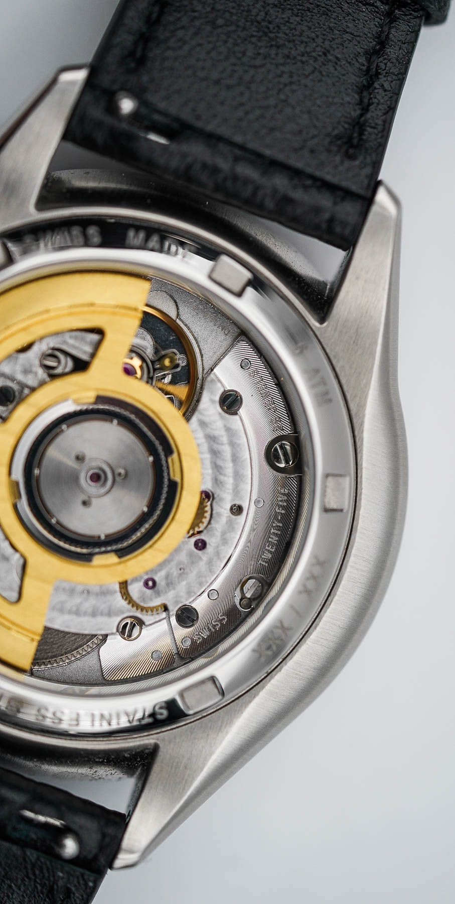 Another missed opportunity, in my opinion, lies in the design of the rotor. While the current execution is clean and nicely finished, incorporating a design element inspired by the Jaguar E-Type’s iconic steering wheel—perhaps even shaping the rotor to resemble it, or a stylized half of it—would have added a unique touch to the movement and further reinforced the automotive narrative. Given the strong story behind the dial material, extending that storytelling to the movement side would have brought the whole concept full circle and elevated the AJ-003’s sense of identity and connection to its source of inspiration.