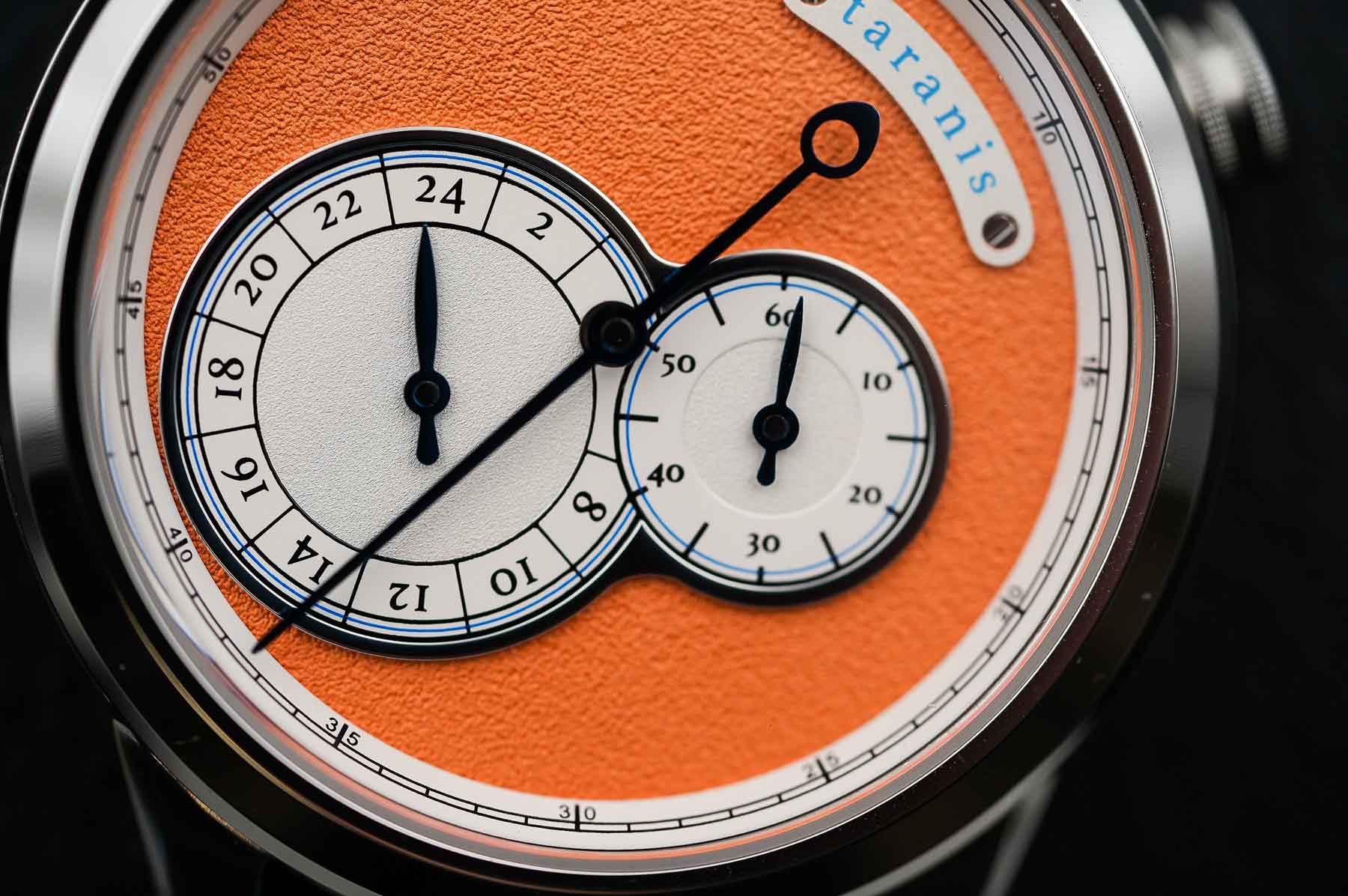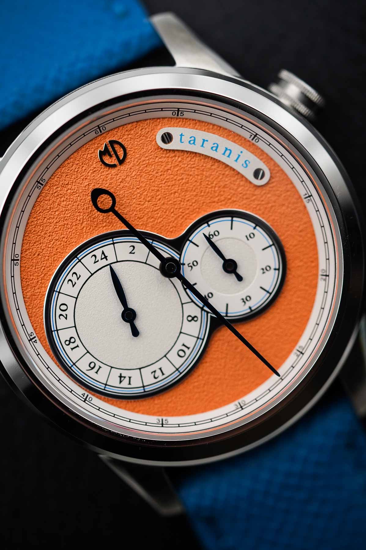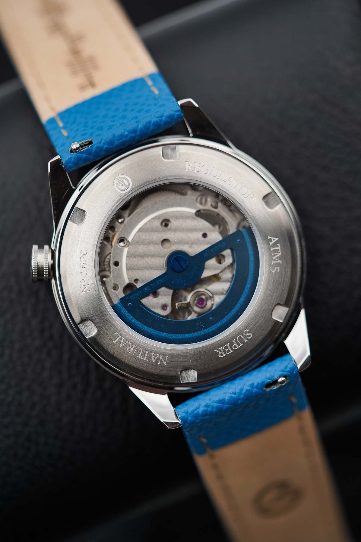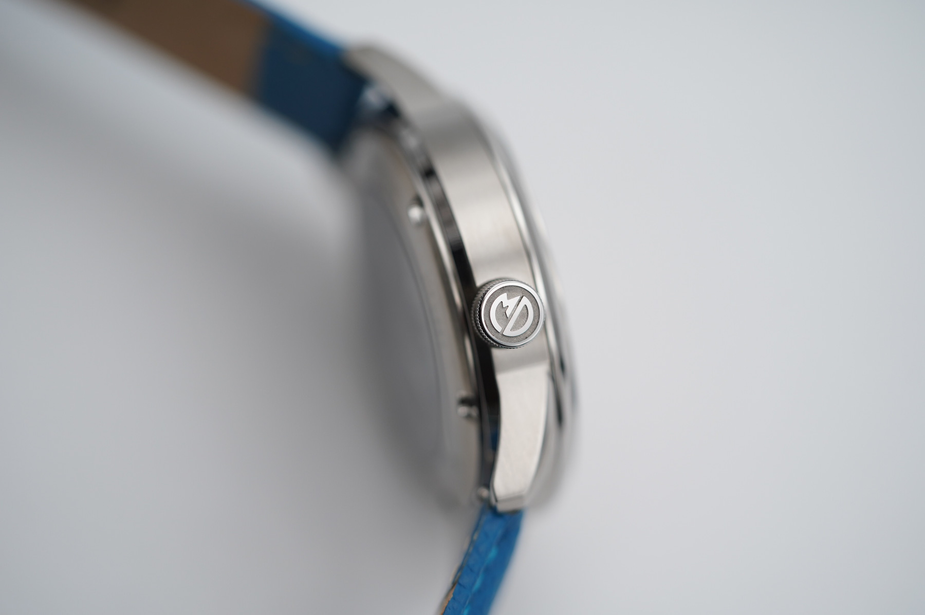 The hands are polished and finished in a vibrant blue. It’s unclear whether they are thermally blued or simply lacquered, but either way, they harmonize beautifully with the rest of the dial’s palette and add a refined touch. The applied MD logo sits proudly at the 12 o’clock position, finished in polished metal for added dimensionality. Just below, between 1 and 2 o’clock, is a metal nameplate secured with two screws, featuring the model name “Taranis” in crisp blue print—a tasteful design cue that gives the dial a distinctive personality. Legibility is excellent, though as with most regulators, it takes a little time to adjust to reading the time at a glance. Once you become familiar with the layout, it becomes second nature. As far as the dial is concerned, I find it absolutely stunning. Every detail feels intentional, balanced, and beautifully executed. I wouldn’t change a thing.