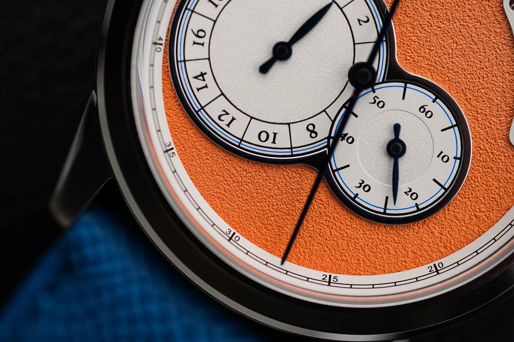 The dial is undoubtedly the highlight of this timepiece—it’s where the watch truly sets itself apart. Some may see it as a subtle homage to F.P. Journe, and I can’t deny that it shares a similar aesthetic appeal. Surrounding the dial is a sloped chapter ring in crisp white, featuring a finely printed black minute track for precise readability. The main dial surface showcases a beautiful grainy, almost frosted texture in an elegant salmon pink tone, adding both depth and visual interest. This is a regulator-style layout, meaning each timekeeping function—hours, minutes, and seconds—has its own dedicated sub-dial. The central minutes hand anchors the design, while the hour and seconds sub-dials are elevated slightly with polished metallic frames. These sub-dials contrast nicely in white and silver tones, accented with hints of blue that tie the whole dial together.