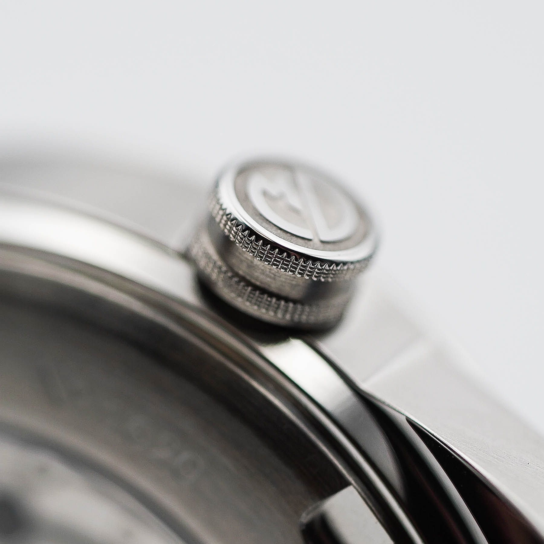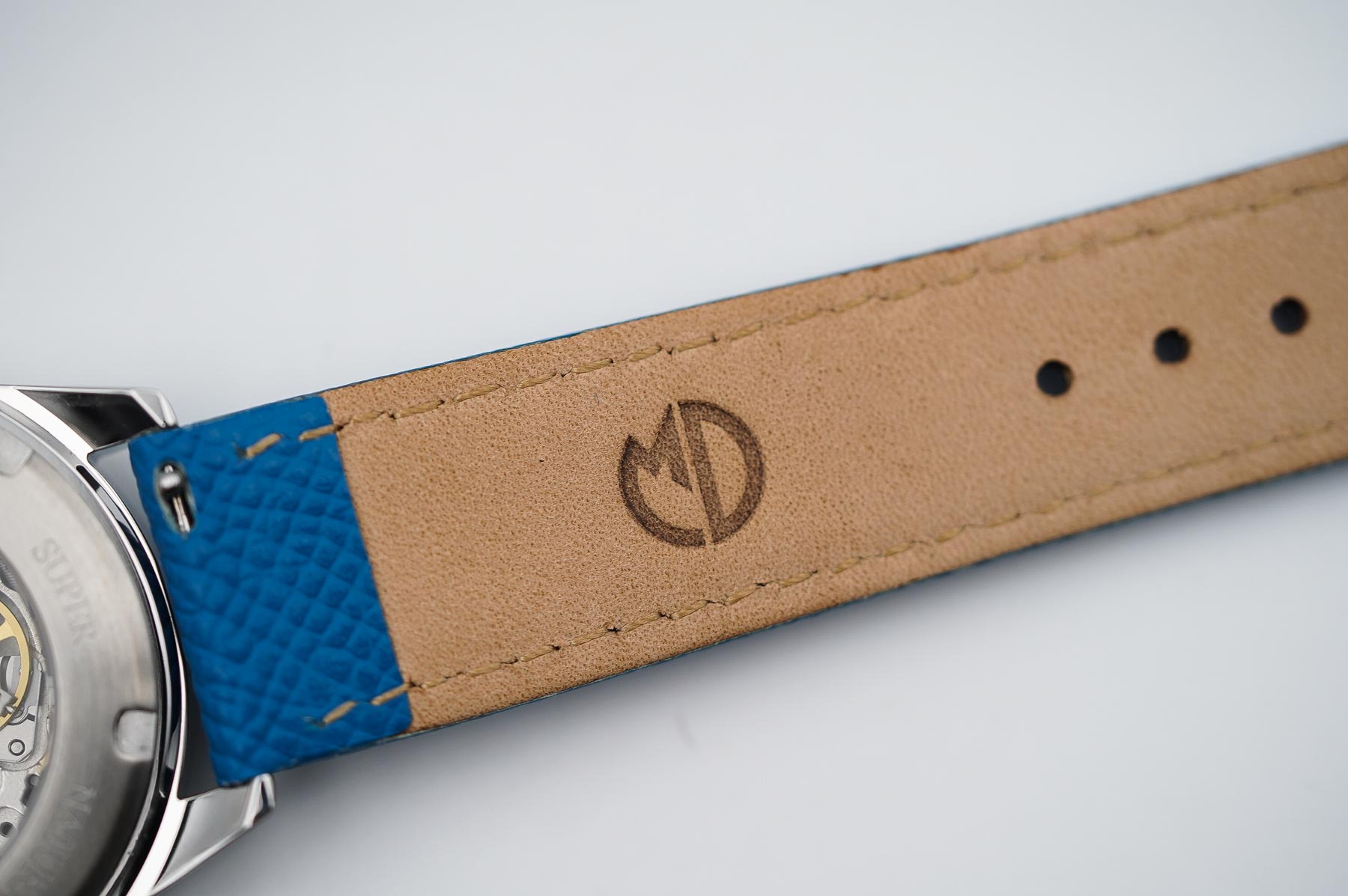 A polished bezel sits atop the case, adding a touch of elegance. Positioned at the 2:10 mark is a signed push-pull crown featuring the MD logo. The crown offers excellent grip and makes time-setting effortless. While the 2 o’clock position offers a unique aesthetic, I would have preferred a more traditional placement at 3 o’clock for better symmetry and familiarity. Turning the watch over, the exhibition case back features a satin-brushed finish and a flat sapphire crystal, offering a view of the Miyota 82S7 automatic movement. While the movement itself is relatively utilitarian, it’s still enjoyable to observe its mechanical workings. Engraved around the perimeter of the case back are key specifications of the watch. The timepiece offers a water resistance rating of 50 meters (5 ATM), which is more than adequate for everyday use and casual wear.