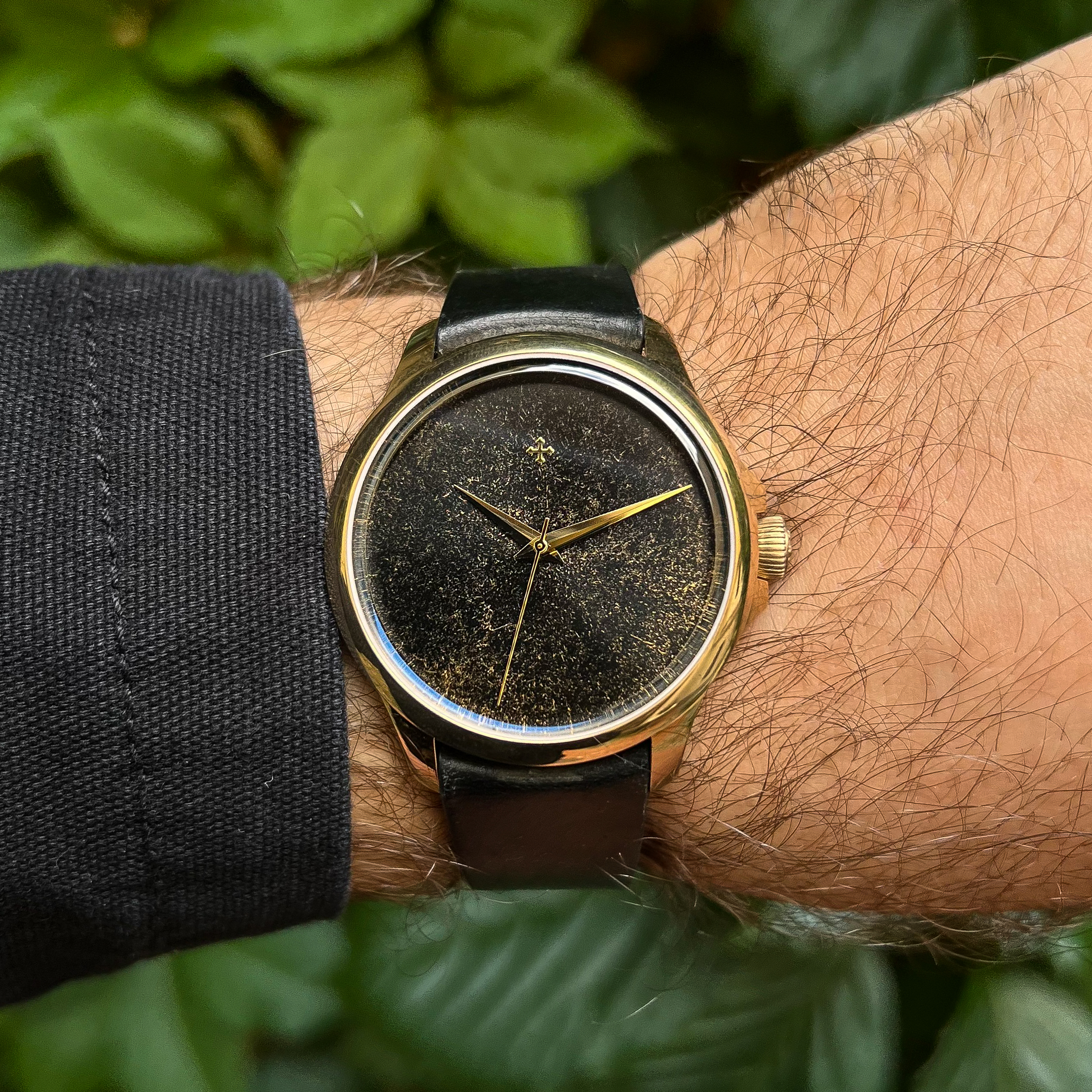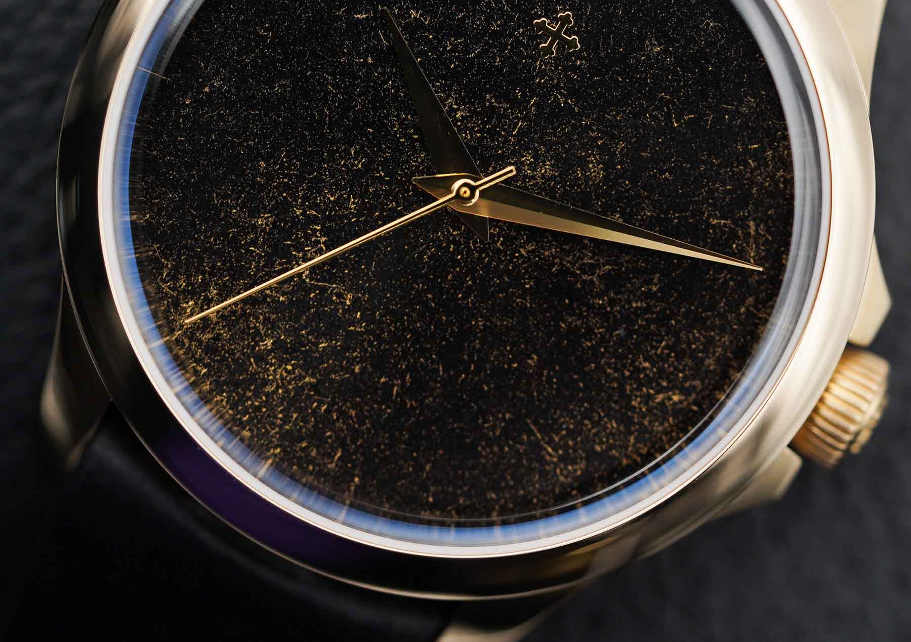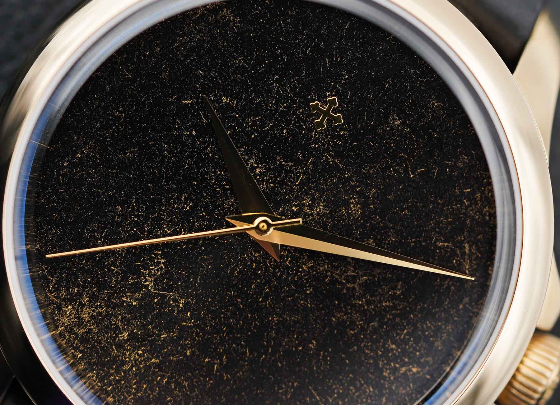 The dial is undoubtedly the star of the Redentore Bronzo. Made from brass, it undergoes a multi-step artisanal finishing process that gives each piece a unique, hand-antiqued appearance. Starting with a soleil finish, followed by a burnished coating and a tumbling treatment that selectively strips away layers to reveal underlying textures, the result is a dial that feels organic, almost alive. Thin golden strands shimmer subtly across the weathered surface, echoing the aged bronze aesthetic and tying back to the Horses of St. Mark motif. What makes the dial truly compelling is its minimalist approach. There are no indices, no date windows, and no extraneous text. The only visual elements are the finely applied Venezianico Botany Cross logo at 12 o’clock and the slender dauphine hands that match the bronze tone of the case. This design demands a certain “faith” in reading time as aesthetics take precedence over legibility. While this may deter those who value instant readability, it also elevates the watch into a statement piece—more art object than instrument. The absence of lume reinforces its purpose as a dress-oriented watch rather than a functional tool watch, leaning into the notion that this is a timepiece best suited for slower-paced, deliberate occasions.