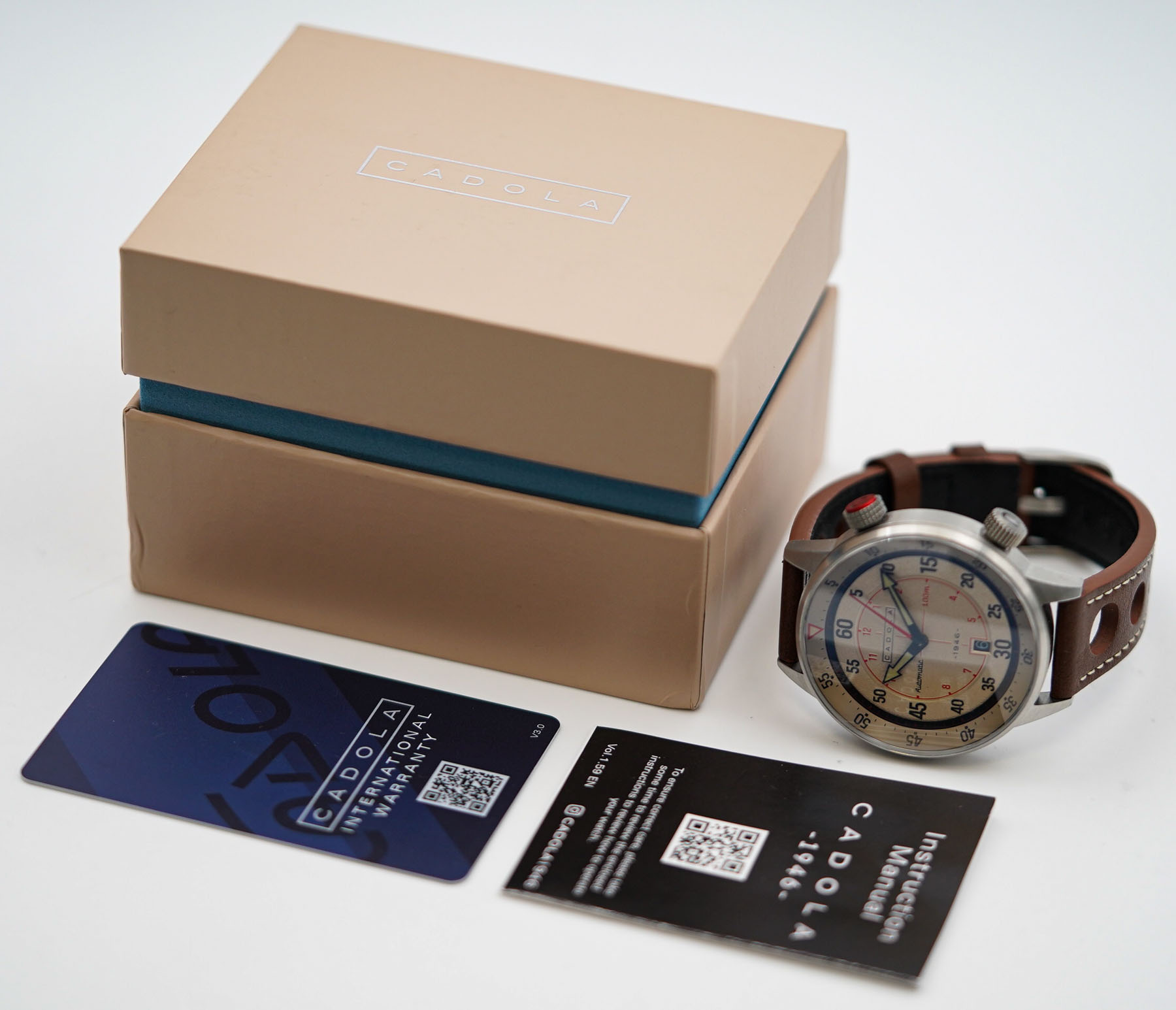 The model we’re reviewing today is the Cadola Rally Timer, available in four dial colors: Green, Black, Blue, and the version we have here — listed as Grey, but in person, it leans more toward a creamy champagne or soft gold tone than a true grey. The watch arrives in a minimalist cardboard box, just large enough to house the timepiece, a warranty card, and the instruction manual. Personally, I appreciate this no-nonsense approach to packaging — it’s compact, functional, and avoids unnecessary waste.