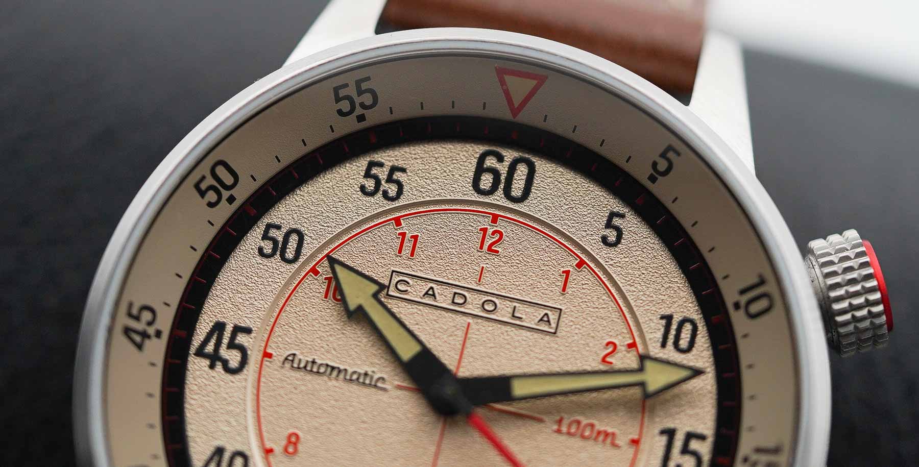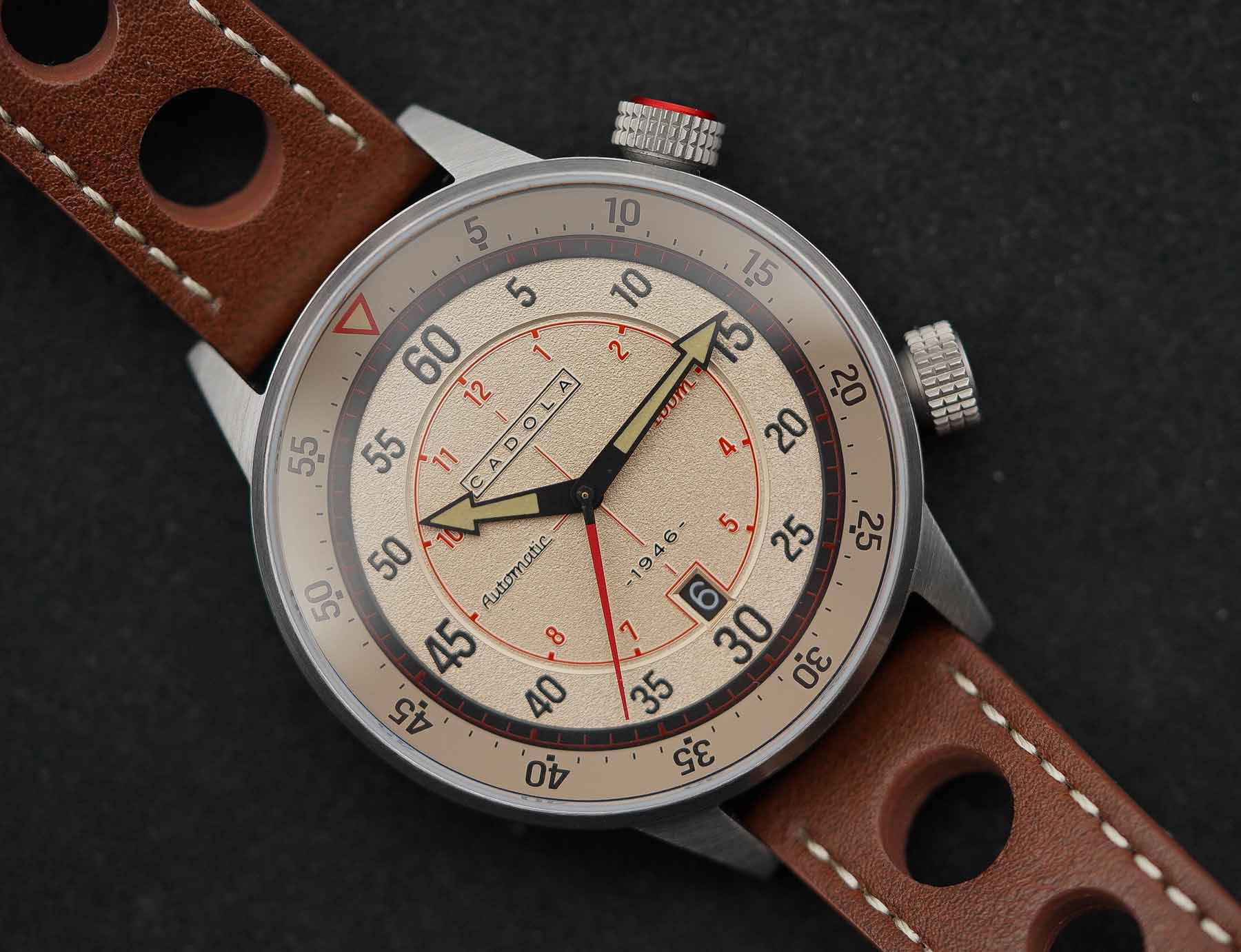 The dial of the Cadola Rally Timer is as bold as the case itself — large, highly legible, and packed with detail. While the official description lists the dial color as “Dove Grey,” in person it leans much more toward a champagne, cream, or soft gold tone, depending on the lighting. It’s a warmer hue than expected, but one that adds a touch of vintage charm. Surrounding the dial is the inner rotating bezel, angled and featuring a red triangle marker at 12 o’clock, with black-printed minute markers. Between the main dial and the bezel sits a black minute track, highlighted with red accents, which adds depth and visual layering. The center of the dial features a grainy texture, giving it a subtle tactile quality. A sector-style layout is present, defined by red vertical and horizontal line, along with printed red hour numerals. A second set of black minute markers surrounds this inner sector and, notably, these are lumed, enhancing nighttime visibility.