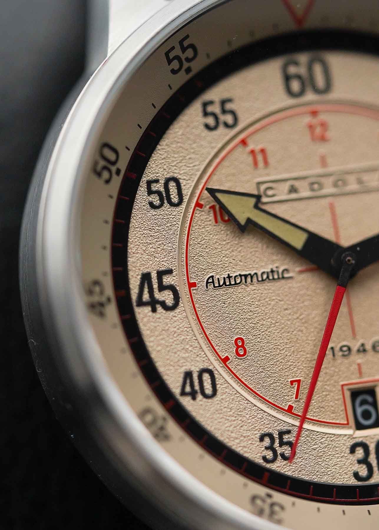 At 6 o’clock, there’s a black date window — a thoughtful touch that blends seamlessly with the overall design, avoiding unnecessary contrast. The Cadola logo sits at 12 o’clock, while “Automatic” and “100m” are printed at 9 and 3 o’clock, respectively, maintaining visual symmetry. The hands are styled in a Broad Arrow design — bold and easy to spot. They are finished in black, with luminous material filling the center portions. The seconds hand is bright red, standing out clearly against the dial for easy readability. Overall, while the dial design feels somewhat conflicted — blending racing and diving watch elements — it’s undeniably distinctive. Despite the eclectic mix, the result is a highly legible and eye-catching dial that offers strong character and practicality.