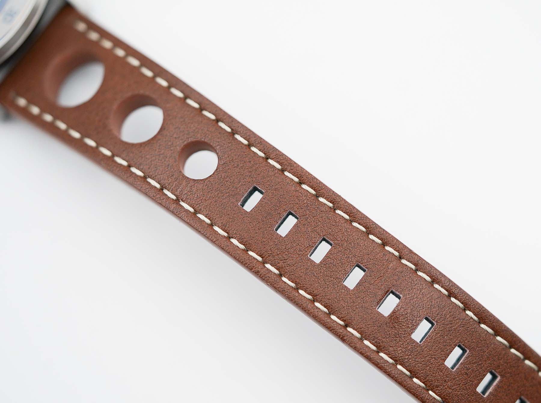 Straps have consistently been a strong point for Cadola’s sister brands such as AVI-8 and Spinnaker, and the Rally Timer continues that tradition with a well-executed, motorsport-inspired strap design. The watch comes fitted with a rally-style leather strap, characterized by its large perforations — a nod to classic racing chronographs and a fitting complement to the watch’s overall theme. Crafted from brown leather with contrasting white stitching, the strap strikes a nice balance between vintage styling and modern comfort. The underside is lined with black leather, adding a subtle layer of refinement. Curiously, the strap itself is unsigned, with no Cadola branding on the leather, which feels like a missed opportunity given the level of detail elsewhere on the watch. However, the tang-style buckle is made from brushed stainless steel and is signed with the Cadola logo, maintaining visual consistency with the case’s finishing.