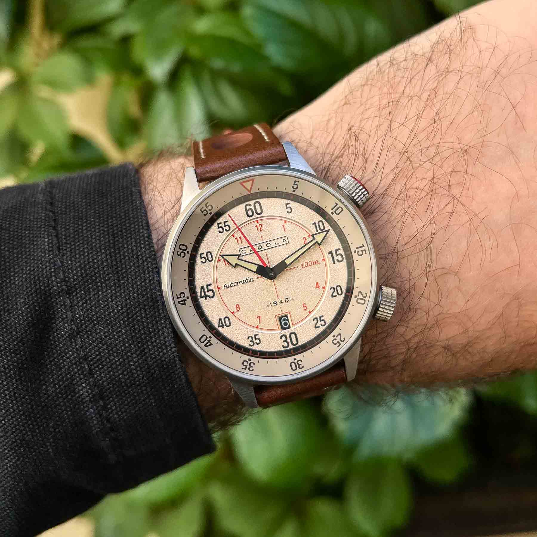 The bezel is fixed, and at 2 o’clock, there’s a secondary crown for the internal rotating bezel, capped with red anodized aluminum. Unfortunately, this crown is not screw-down, so even a light touch can unintentionally move the bezel, limiting its usefulness for accurate timing. The main crown at 4 o’clock is a large, push-pull type, signed with the Cadola logo. It’s easy to grip and operate, with solid tactile feedback. Around back, the screw-down caseback is engraved with the logo and key specifications. Covering the dial is a single-domed sapphire crystal with AR coating. The watch is rated to 100 meters (10 ATM) of water resistance — suitable for handwashing or rain — but since neither crown screws down, I wouldn’t recommend swimming with it. Overall, while the case design is solid and well-built, the sizing and crown choices may limit its practicality for everyday wear.