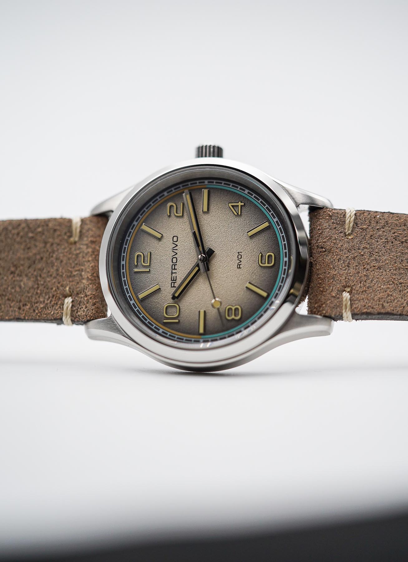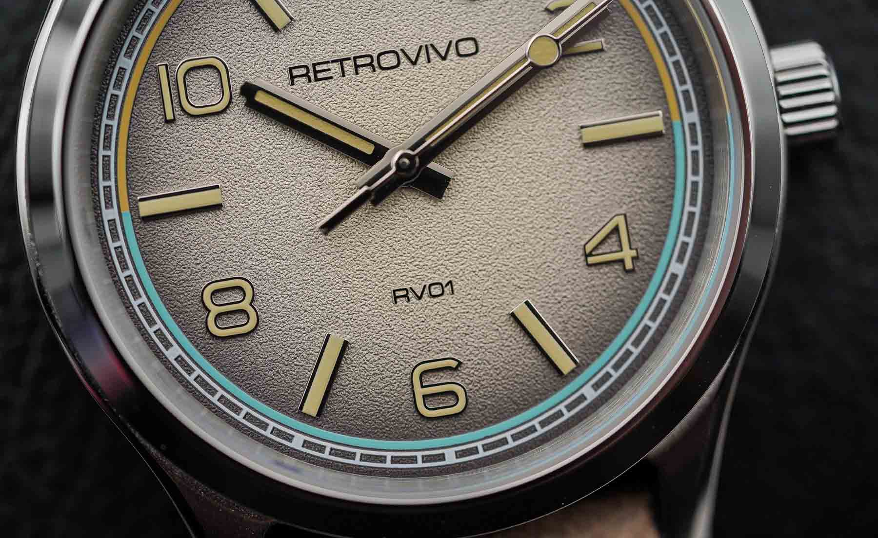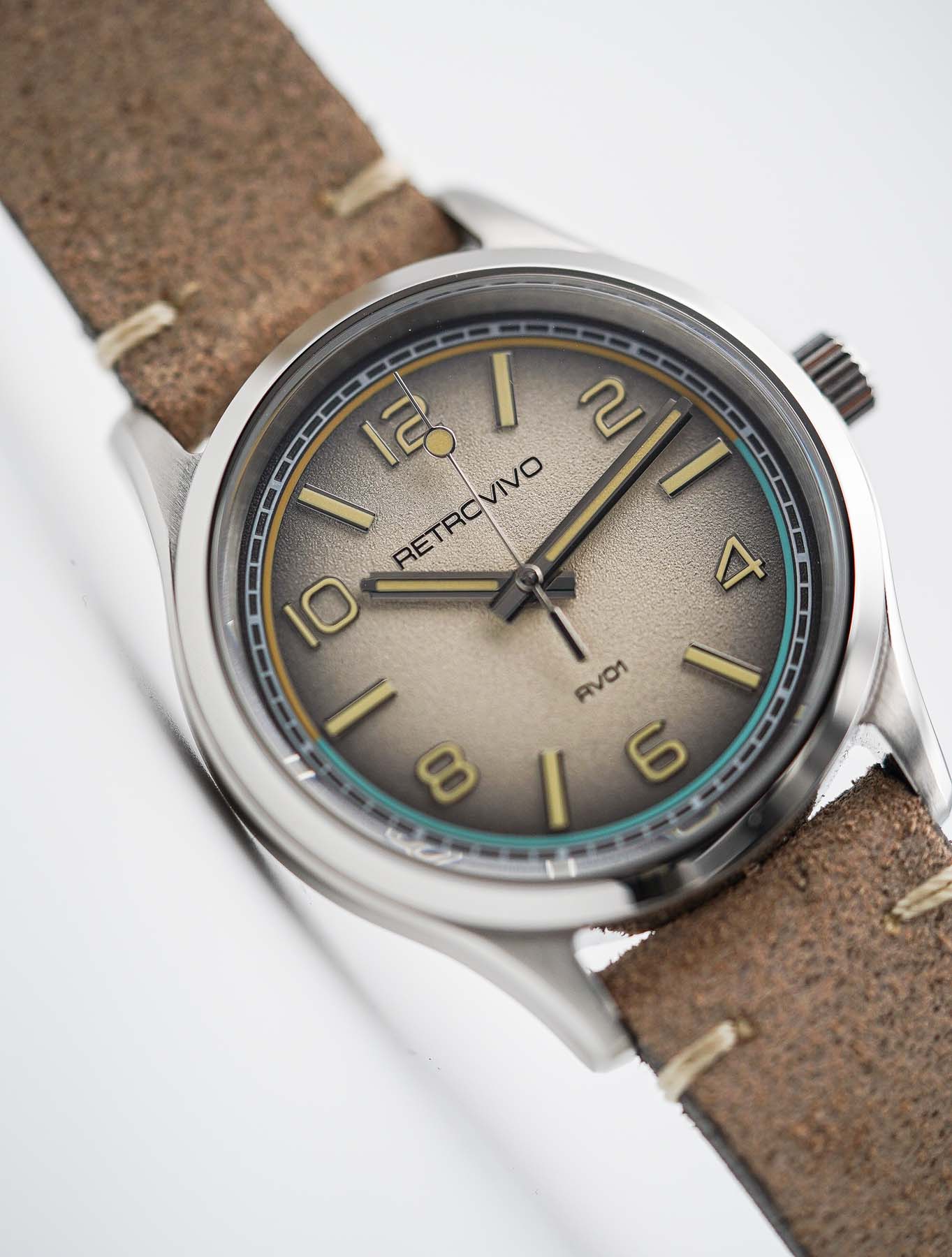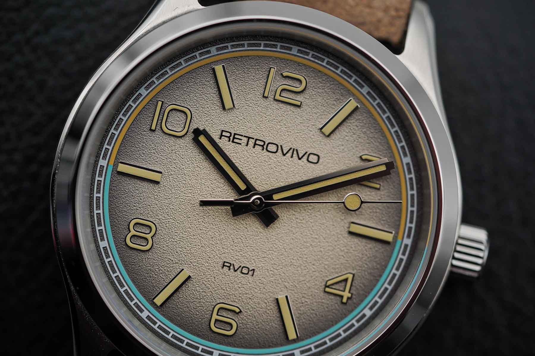 If the case is where the RV01 makes its first impression, the dial is where it truly captivates. Retrovivo has taken a confident, almost bold approach to dial design, delivering a face that feels both familiar and fresh. The RV01’s dial is deeply textured, with a subtle grainy surface that adds visual depth and interest without overwhelming the eye. Depending on the lighting, the texture creates a shifting, almost three-dimensional quality that invites closer inspection. Available in four distinct colorways—black, gray, green, and a standout ombré sand we have here —the dial offerings showcase the brand’s commitment to aesthetic diversity. Each variant shares the same structural layout, with applied polished markers, bold Arabic numerals on the even hours, and rectangular indices for the odd hours. This mix adds a layer of dynamic rhythm to the dial, balancing legibility with design flair.