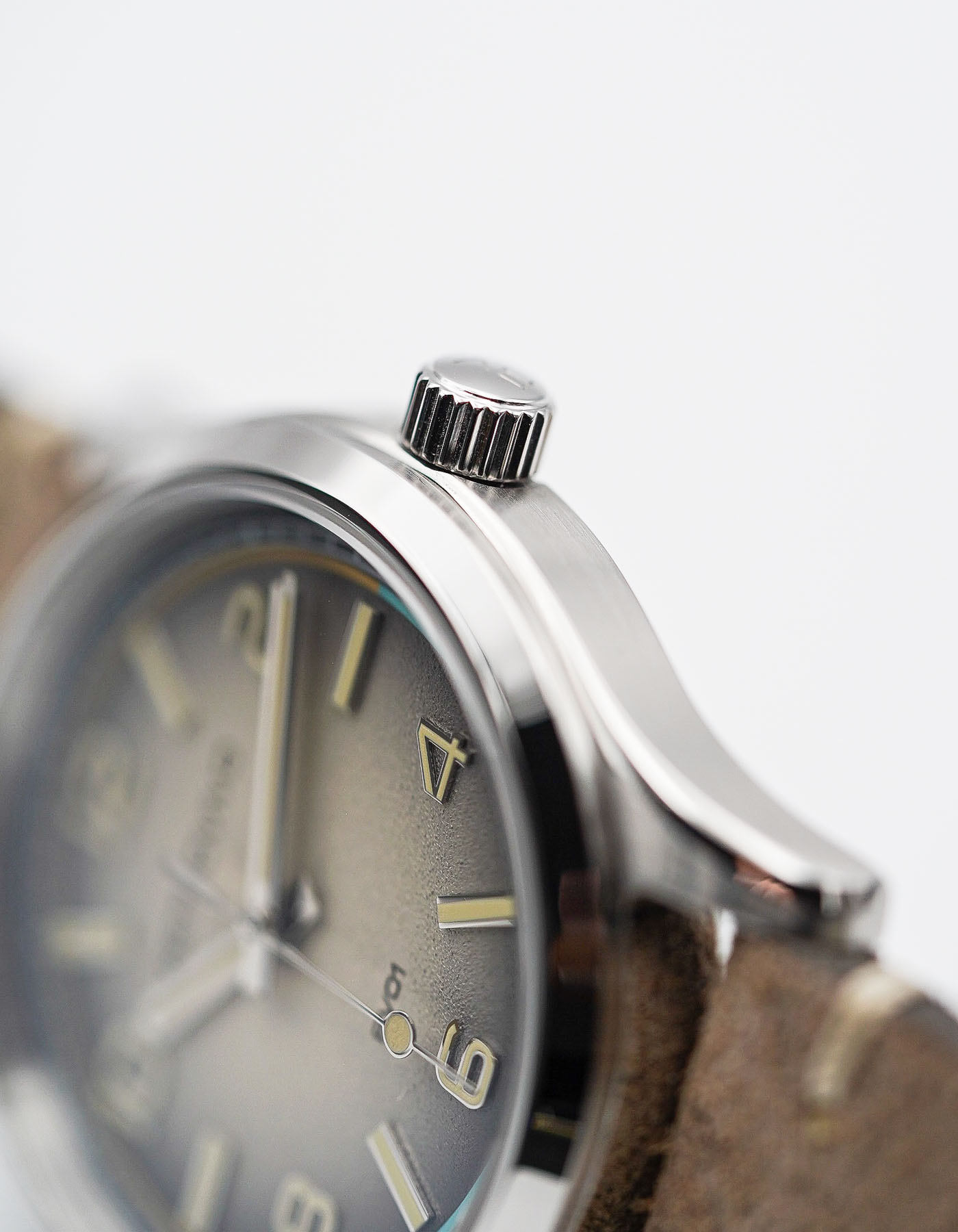 In particular, the sand dial with its gradient finish stands out for those looking for something with a vintage patina effect. It delivers that “found in a drawer” feeling that vintage collectors love, but with the reliability and precision of a modern build. The handset continues the theme of retro-modern harmony. Squared syringe-style hands deliver strong visual identity, while the lollipop seconds hand brings in a charming nostalgic vibe. Every hand extends right to the edge of its respective markers, a small but critical detail that many brands get wrong. Here, it contributes to both aesthetics and function, improving readability and reinforcing the sense of careful design. A thin two-tone ring sits just inside the railroad-style minute track. This layered approach to dial design adds complexity without clutter, creating a frame that focuses the eye toward the center.