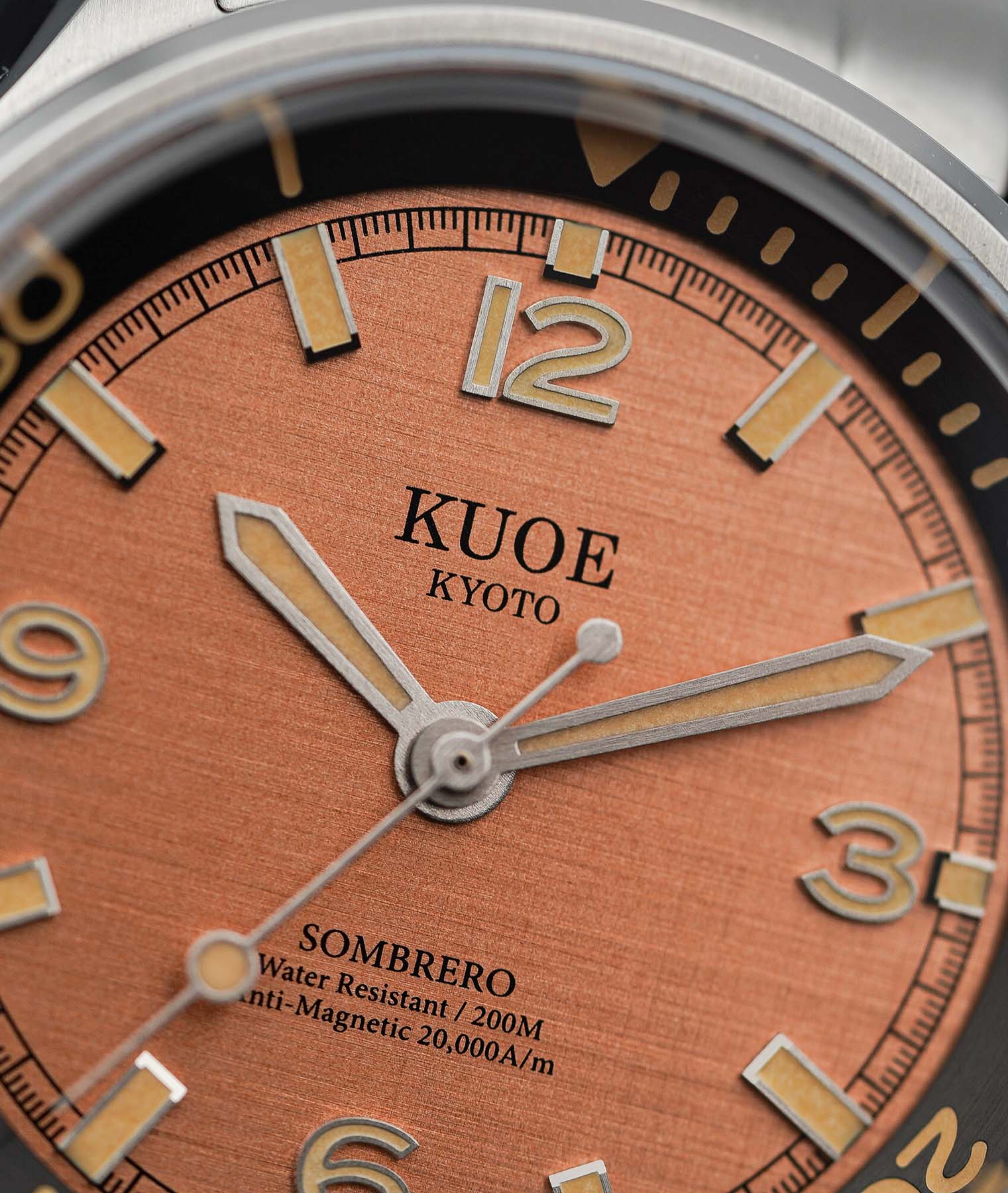 The Kuoe Sombrero in salmon pink linen is more than just a debut dive watch—it’s a statement piece that shows how far Kuoe is willing to push its design language without losing its DNA. Up to now, the brand has built its reputation on compact, vintage-inspired field watches and gentleman’s models, but the Sombrero proves they can step confidently into the tool watch arena while still delivering refinement and charm. This isn’t a watch that tries to scream “diver” through size or bulk. Instead, it takes a nuanced approach: a 38 mm compressor-style case with thoughtful finishing, twin crowns that are a joy to operate, and a build that feels substantial yet wearable. The dial is the undeniable star—salmon pink with a linen texture that shifts and shimmers under the light, offering both playful personality and vintage elegance. It’s a combination you simply don’t see in dive watches, which makes it uniquely Kuoe.