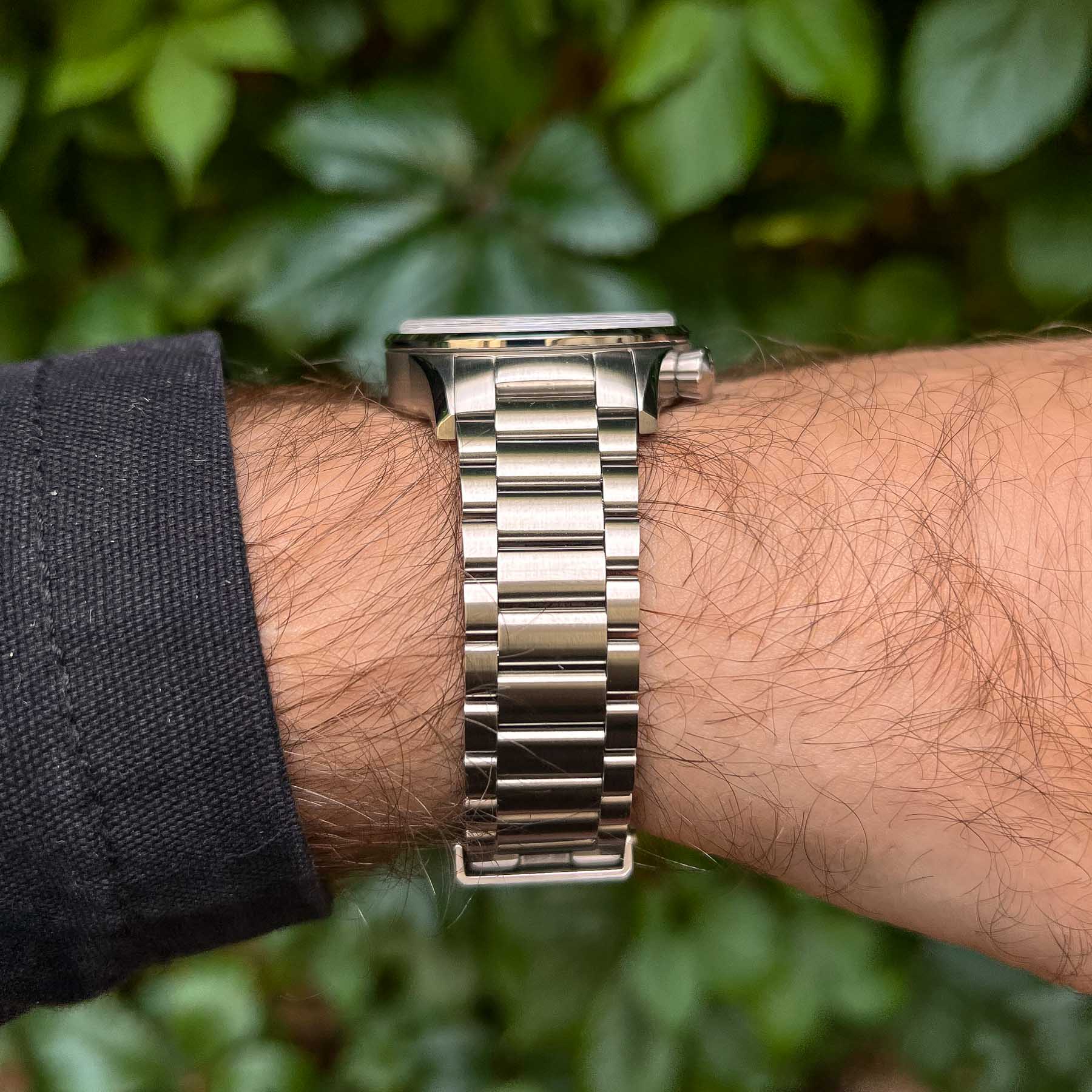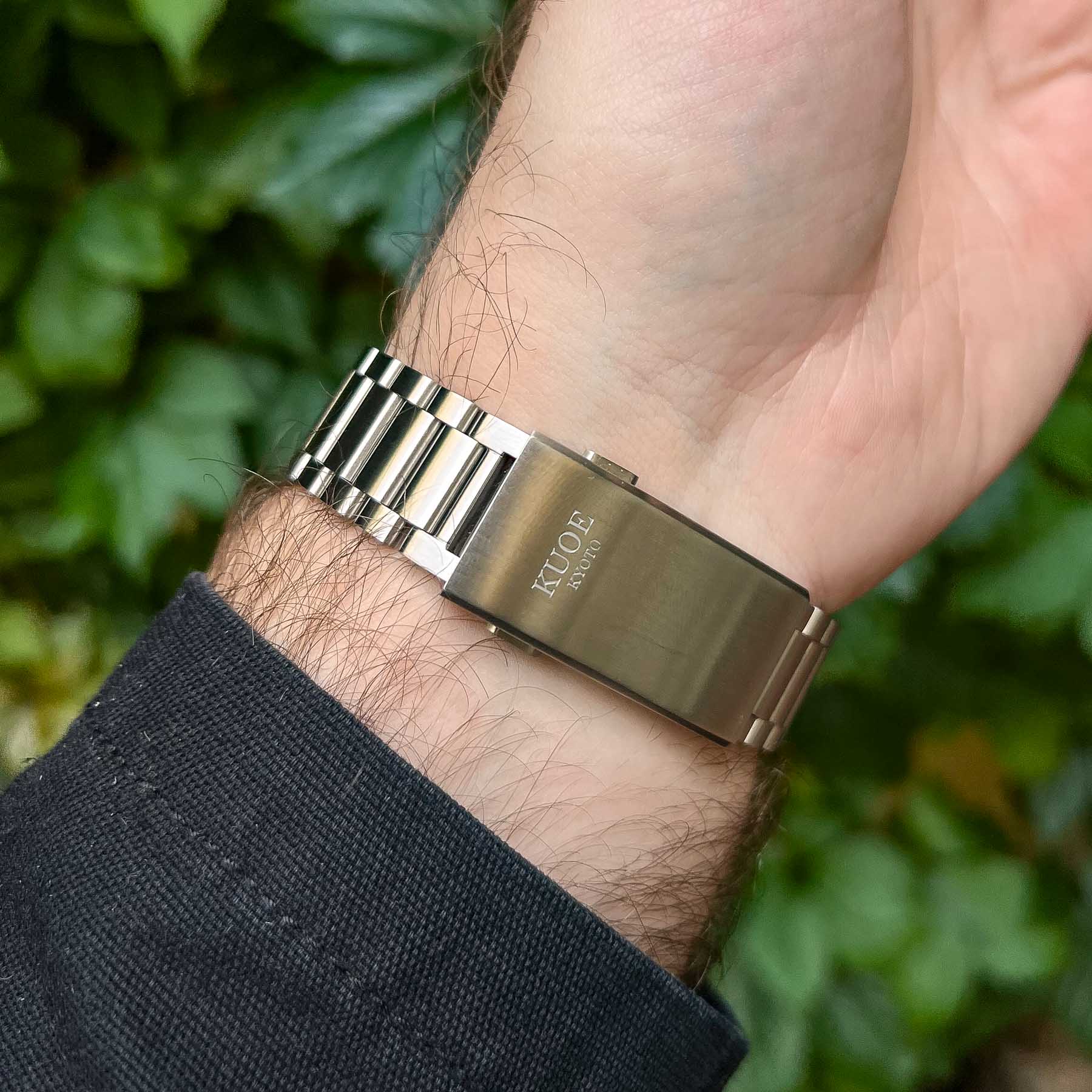 Bracelets are where many microbrands stumble. Not Kuoe. The Sombrero comes with two bracelet options: a flat-link and a Jubilee-style. My review unit came with the flat-link, and I can say this with zero hesitation: it’s one of the most comfortable microbrand bracelets I’ve worn in years. The links are short, fully articulating, and taper from 20 mm to 18 mm. That taper, plus the fluidity of the links, makes the bracelet hug the wrist naturally. Solid end links with quick-release spring bars add practicality. Sizing is done with single-sided screws (not pins, not collars—screws, as it should be). The clasp is milled, not stamped, with twin push-button triggers for security. It also has a four-position sliding micro-adjust, which means you can tweak the fit on the fly. Hot afternoon? Loosen a click. Cooler evening? Tighten it up. Every bracelet should have this. The jubilee-style option has its own charm—more dressy, more vintage-diver vibes. Personally, the flat-link fits the salmon dial’s playful elegance better, but it’s great that Kuoe lets you choose.