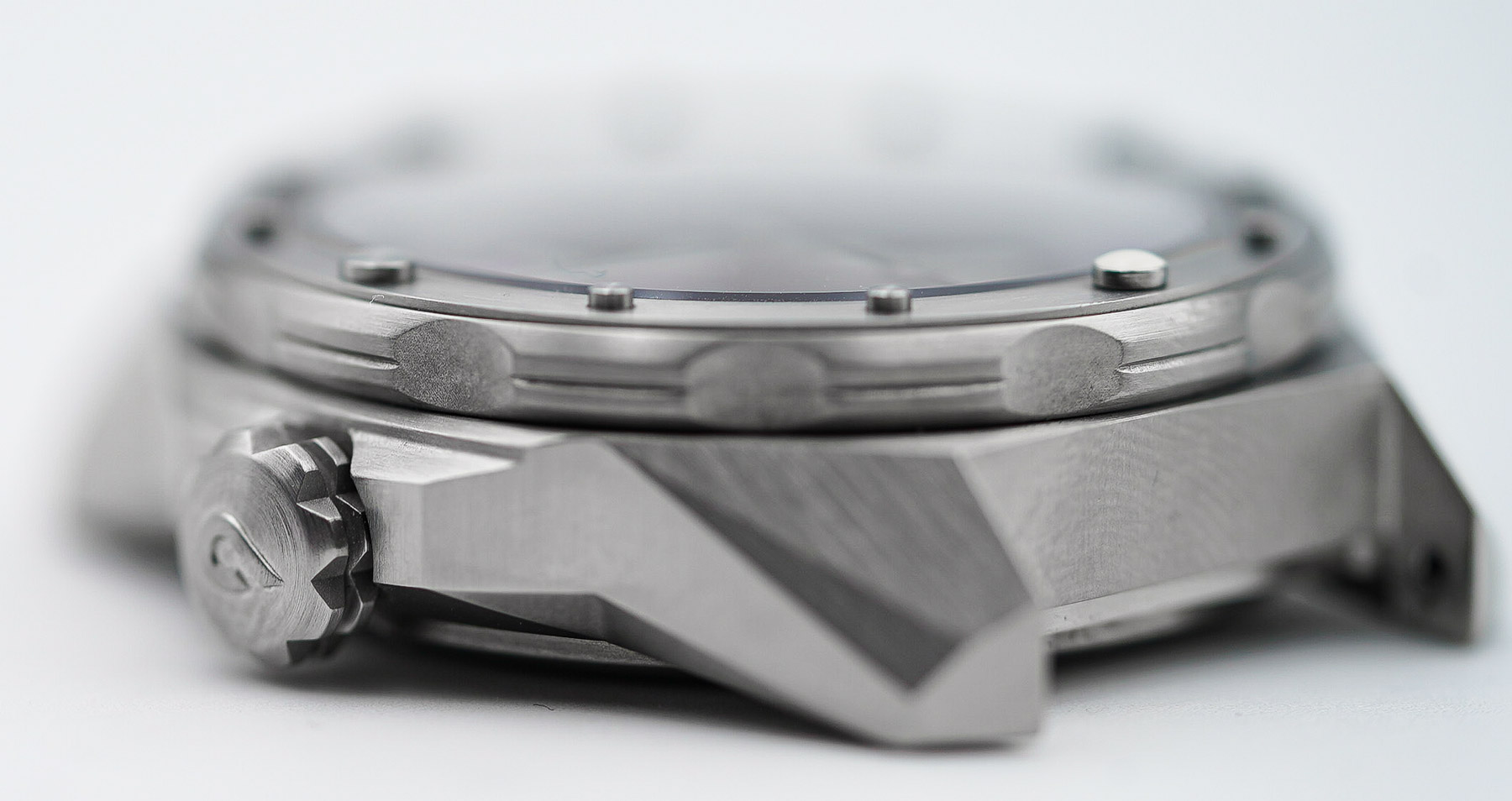 The first thing you notice about the Odyssey is its case. Describing it simply as “titanium” doesn’t do it justice. Yes, titanium is the core material—offering durability, corrosion resistance, and of course, the lightweight feel that makes the watch comfortable in daily wear. But what makes this case special isn’t just the material; it’s the geometry. Rather than following the smooth-edged, round-bezel archetype of most divers, the Odyssey’s case is a faceted fortress. Angular lugs jut outward like sculpted blades, catching light in a way that makes the watch seem to shift personality depending on the angle. From one perspective it looks aggressive, all sharp edges and tool-like seriousness. Tilt it slightly and the vertical brushing softens the effect, letting the case resemble a piece of purposeful industrial design. On top sits a 120-click unidirectional bezel also made in tiatnium. It’s a titanium insert with raised hour markers with 12 o’clock pip filled with Swiss Superluminova. Functionally, this turns the Odyssey into a dual-time GMT rather than a full triple-time tracker. Some may lament the lack of a 24-hour rotating bezel, but for most users, two time zones are plenty. The payoff is a cleaner, more sculptural bezel that complements the case’s angular personality.