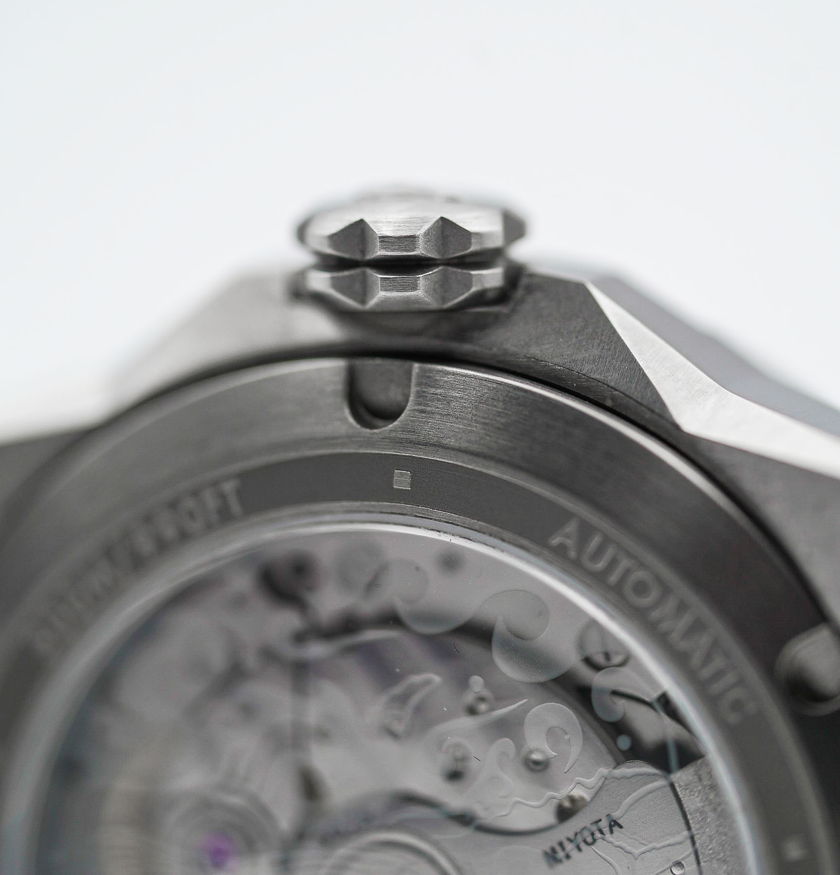 Despite its presence, the watch is more compact than it appears. On wrist, you’d swear it’s 42–43 mm across, but the calipers prove otherwise: 40 mm diameter, 48 mm lug-to-lug, and a 13 mm thickness. Those aren’t intimidating numbers at all. Combined with downward sloping lugs, the Odyssey sits planted without overhang, hugging the wrist rather than hovering awkwardly above it. Weight is another pleasant surprise. At just 125 grams on bracelet, the titanium Odyssey feels sturdy without the fatigue that comes from heavy stainless steel cases. It has just enough heft to reassure you of its toughness, but never crosses into clunky territory. And toughness is central here. The case is treated with a 1200HV coating for scratch resistance, a thoughtful upgrade given titanium’s reputation for showing marks more easily than steel. Water resistance is a confident 300 meters—more than enough for any recreational diver or, more realistically, the knocks of daily urban life. Add in a screw-down crown with a playful gear-shaped design, and the case balances ruggedness with whimsy. Flip the watch over and you’ll find a sapphire caseback decorated with an embossed humpback whale. It’s unexpected, charming, and ties into the ocean-traveling theme of the watch. It might not serve a technical purpose, but it brings a smile—a reminder that not every tool watch has to take itself too seriously.