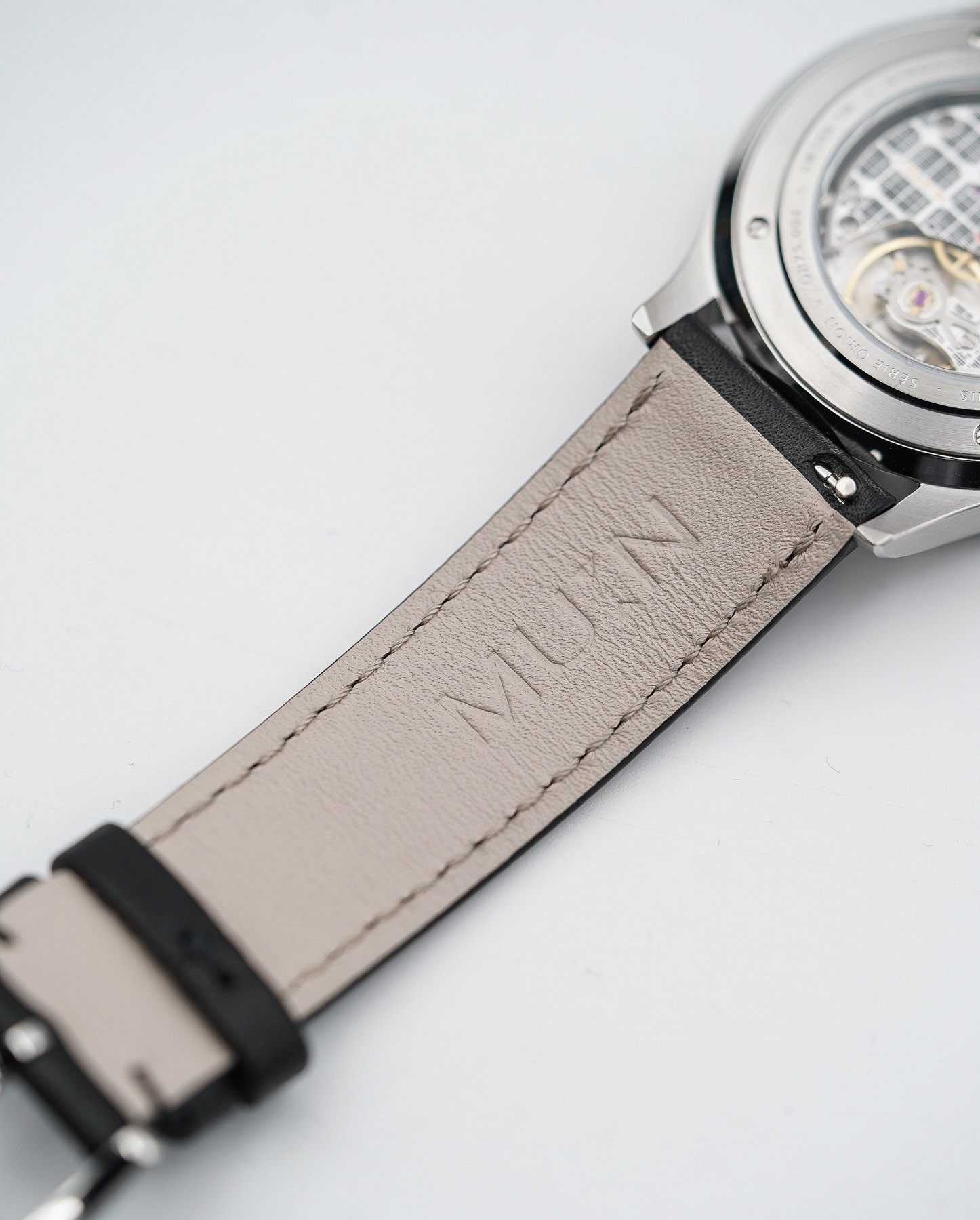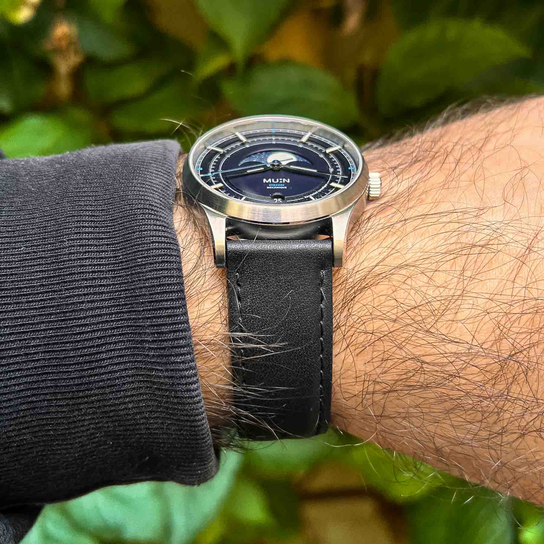 In standard configuration, the Orion ships on a two-piece black coloured calfskin leather strap. Sourced from milk-calf leather” raised and tanned in France, the strap is soft, supple, and designed for comfort from day one. Integrated spring bars allow for tool-free changes, encouraging owners to experiment. The strap tapers from 20mm at the lugs to 18mm at the buckle, balancing the watch head nicely. The tang buckle, solid and engraved with Mu:n’s logo, feels sturdy and secure. There is also more color options available when buying the watch, allowing buyers to customize the look to match their wardrobe. The grey/midnight blue dial pairs particularly well with both black and navy straps, but also looks surprisingly elegant on lighter tan or even burgundy. For those seeking more versatility, Mu:n offers a five-link stainless steel bracelet as an optional upgrade.