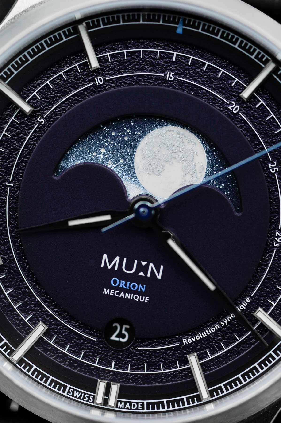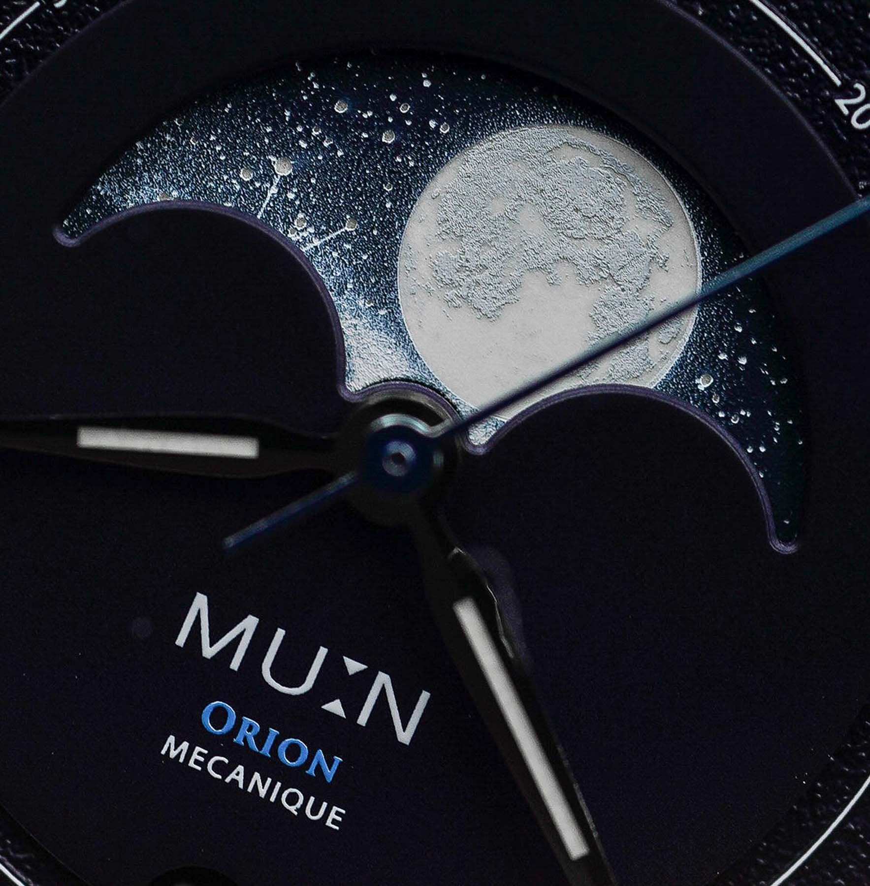Text is restrained, placed entirely below the hand stack to keep the moonphase unobstructed. At 6 o’clock, a circular date window is neatly integrated, maintaining symmetry without stealing attention. The star of the show, of course, is the moonphase disc. Mu:n partnered with AJS Production, specialists in micro-miniaturization, to produce this luminous lunar tableau. Rather than the traditional paint or liquid deposition method, Mu:n uses a Super-LumiNova sticker as the base, hand-applied to ensure uniformity. Over this, layers of acrylic paint are applied with a micro-spray gun, forming the canvas. From there, femtosecond laser engraving takes over. This cutting-edge technology, developed in the 1990s for microsurgery and optics, emits ultrashort pulses of light capable of engraving down to a micron (0.001mm) without causing cracks or heat damage. The laser sculpts away layers of paint to reveal an intricately detailed, hyper-realistic moon. Surrounding it, the Orion constellation and starry sky emerge with precision impossible by hand. By day, the moonphase is strikingly realistic. By night, it transforms. Thanks to BGW9 Super-LumiNova, the moon glows with icy blue light, each crater and ridge illuminated. It is arguably the most lifelike luminous moonphase disc currently available on the market at this price point. The result is a dial that balances restraint and spectacle. At a quick glance, it looks traditional. Under scrutiny, it reveals modernity, technical innovation, and poetic beauty.