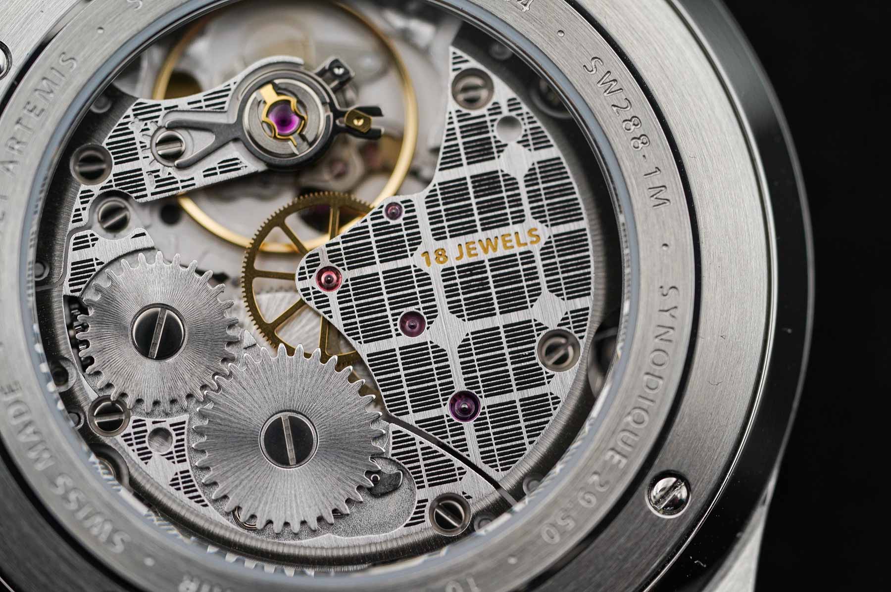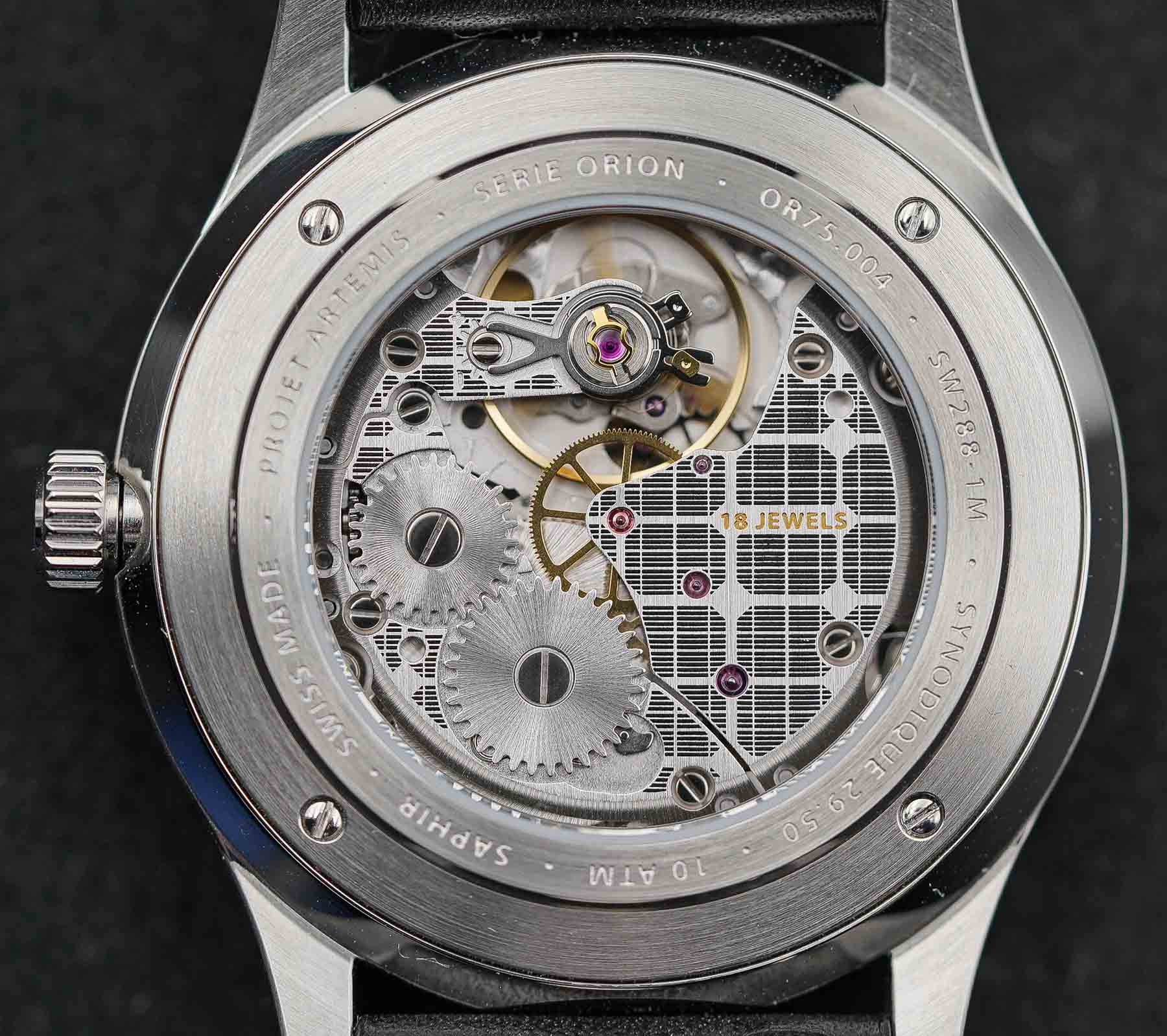 Inside beats the Sellita Caliber SW288-1 M a, a manual-wind derivative of the ubiquitous SW200. This movement was chosen for its compactness (allowing the slimmer case) and its moonphase complication. It operates at 28,800 vibrations per hour (4 Hz), with a 42-hour power reserve. The moonphase module follows the standard 29.5-day cycle, which is typical at this price range, and can be adjusted via the crown. Mu:n opted for the Elaboré grade, which delivers an accuracy of approximately ±7 seconds per day—a very respectable figure for a non-chronometer moonphase. The finishing is distinctive. Rather than Geneva stripes or perlage, the Orion’s bridges sport an engraved linear motif reminiscent of solar panels or spacecraft radiator vents. Black inlay accentuates the lines, gold lettering (“18 jewels”) adds warmth. Purists may scoff at the lack of haute horlogerie hand-finishing, but the effect is undeniably contemporary and thematically appropriate for a space-inspired watch. For many, an exhibition caseback is justification enough—the chance to observe gear trains, balance wheel, and the act of winding. Here, the movement serves not only as an engine but as a conversation piece.